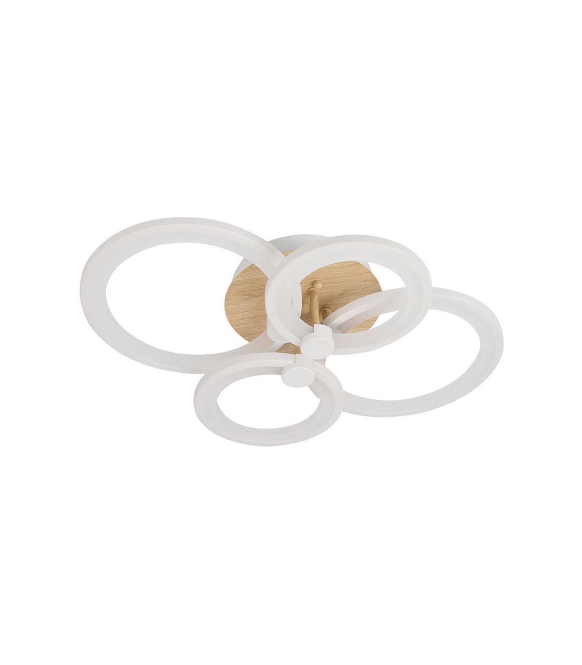 Plafón que se compone de 4 círculos superpuestos a distintas alturas en color blanco e imitación madera, resultando una muy moderna composición.