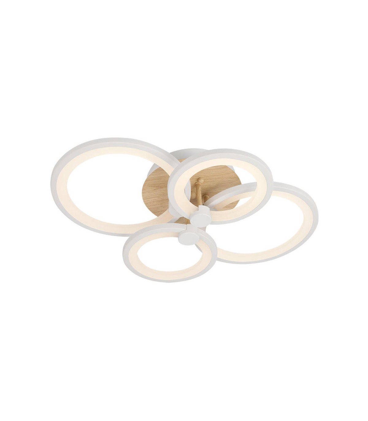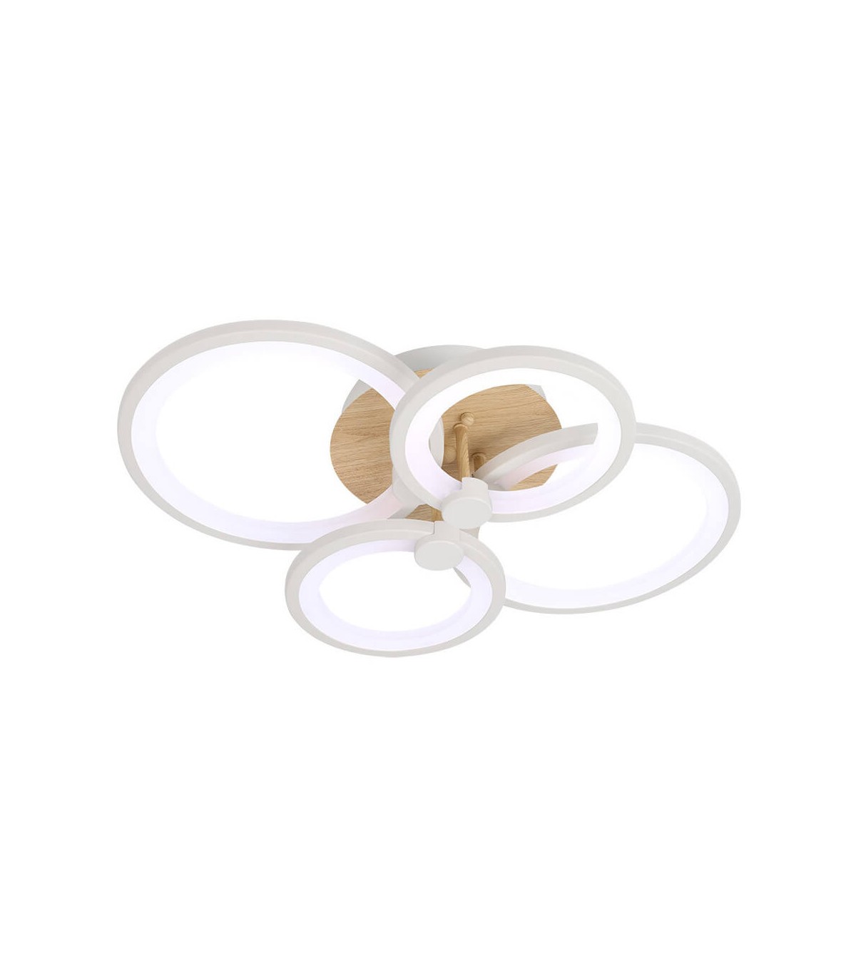 Acabado, blanco e imitación madera natural. Posee led integrado, 76 W de potencia, 10260 lúmenes y con tres temperaturas regulables de luz mediante mando a distancia de 3000º, 4000 o 6500º.