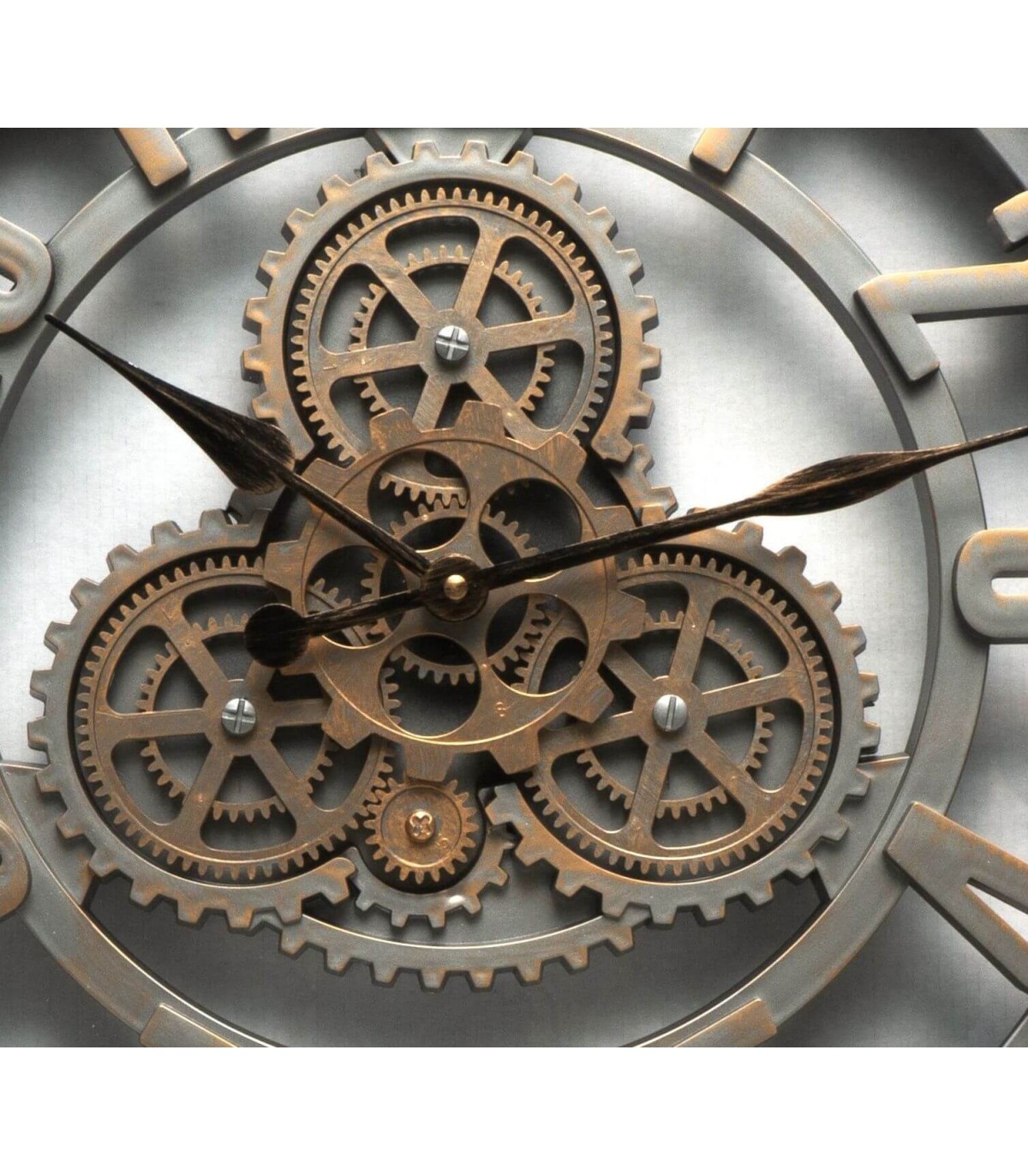 Reloj de pared realizado en policarbonato acabado champagne con cristal. Presenta un diseño muy original y elegante, imitando a los relojes antiguos pero también muy acorde con decoraciones modernas, Vintage o Industrial. Destaca su forma calada y sus engranajes con movimiento que junto con sus aguas de diseño hacen que resulte una composición muy decorativa y vistosa, haciéndose el centro de la estancia que decora.