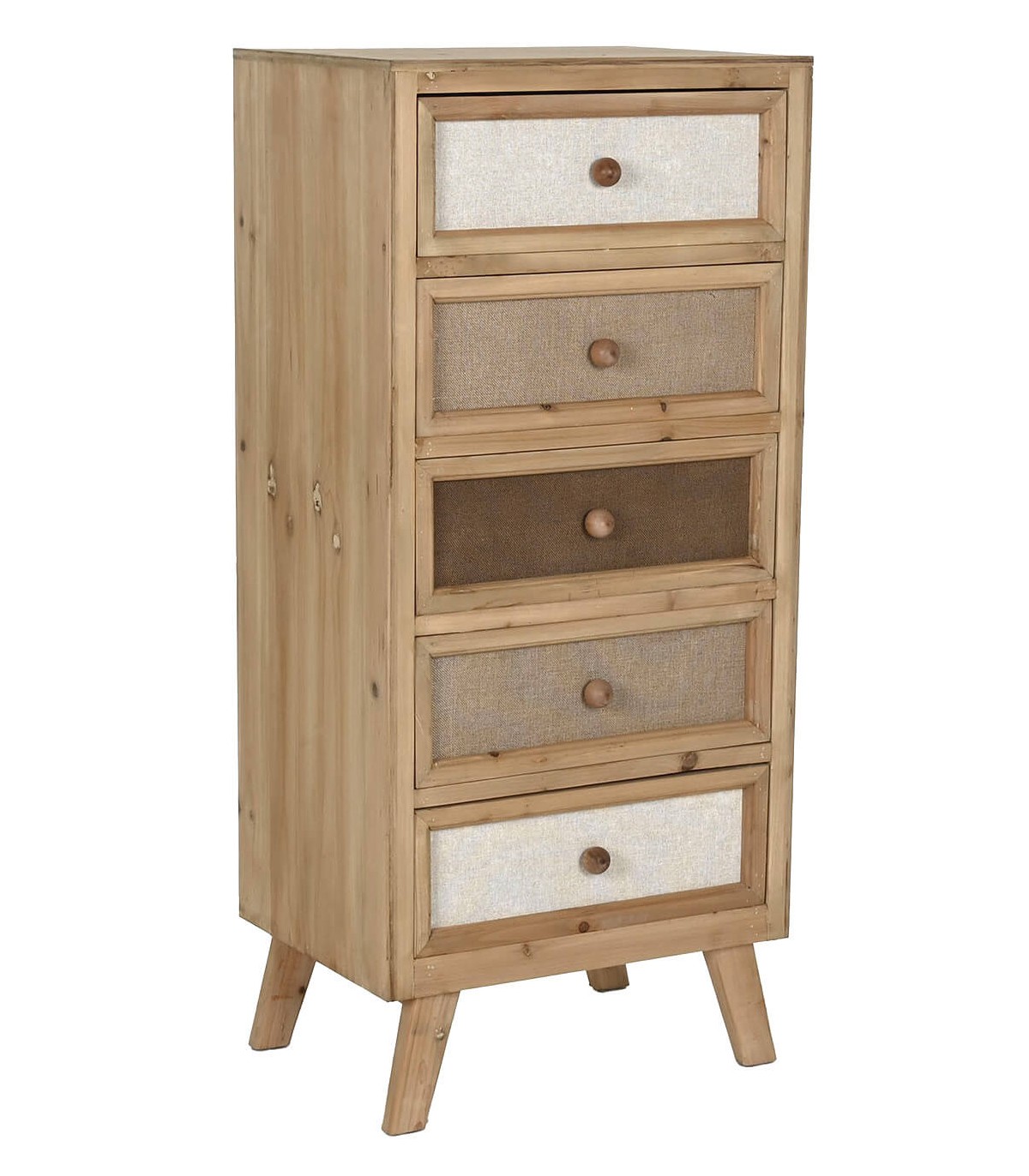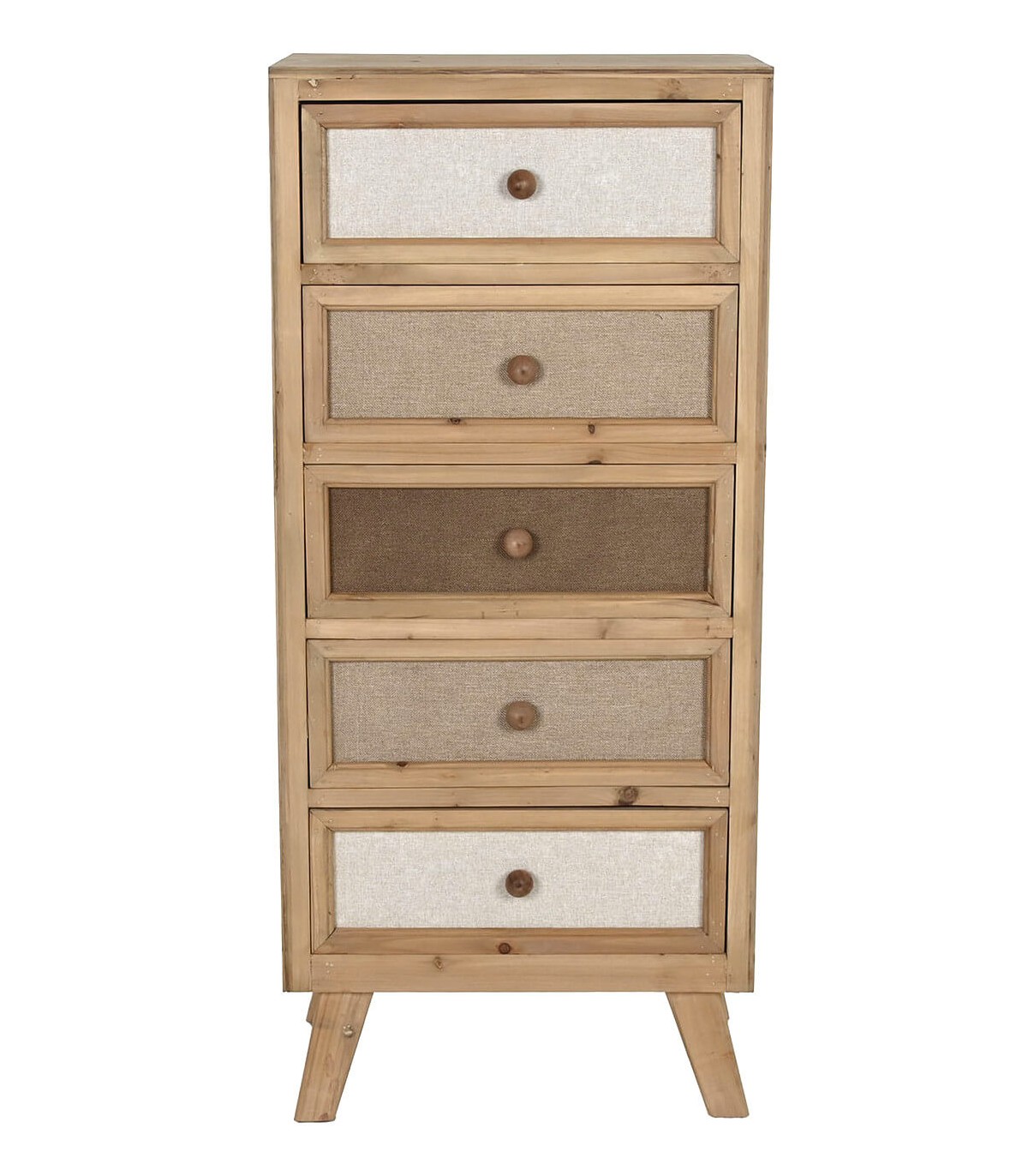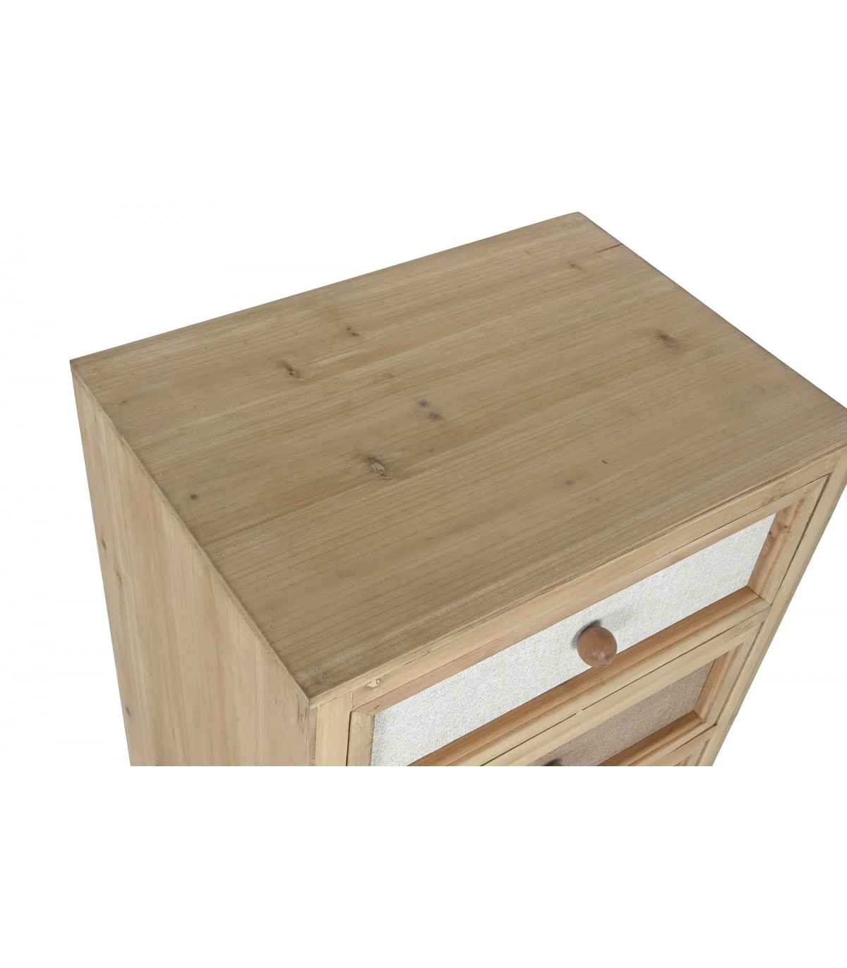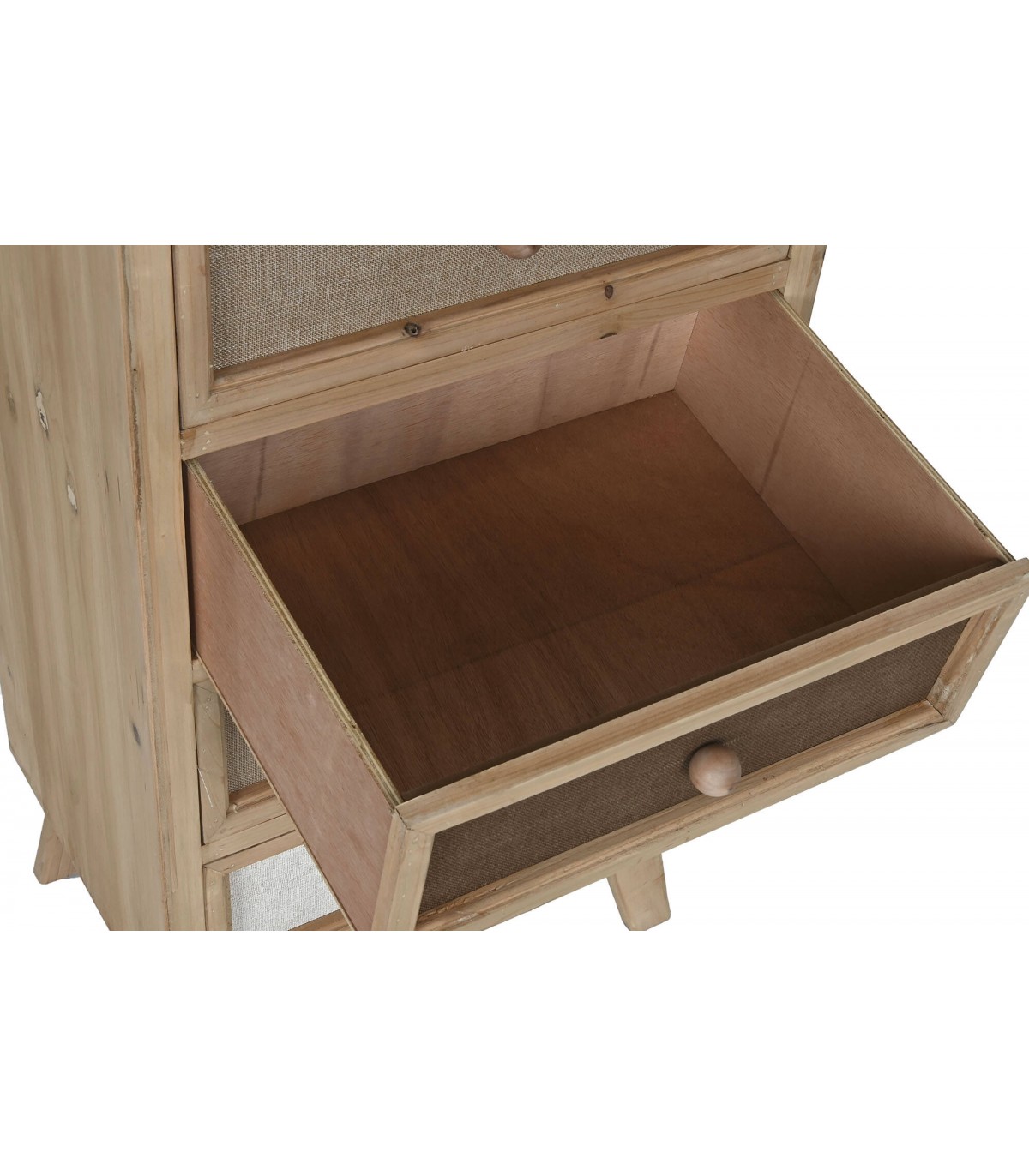 Sinfonier pequeño con 5 cajones realizado en madera de abeto natural con el frente de los cajones tapizados en lino en 3 tonos diferentes, un sinfonier de noche original y cálido.