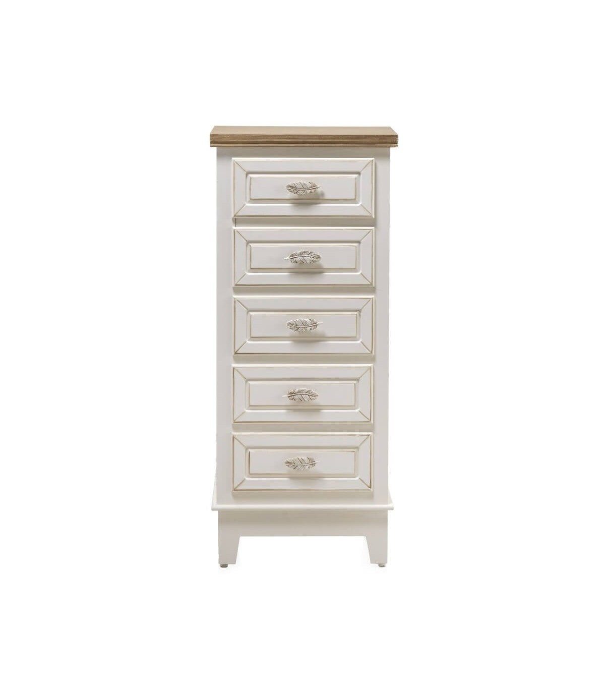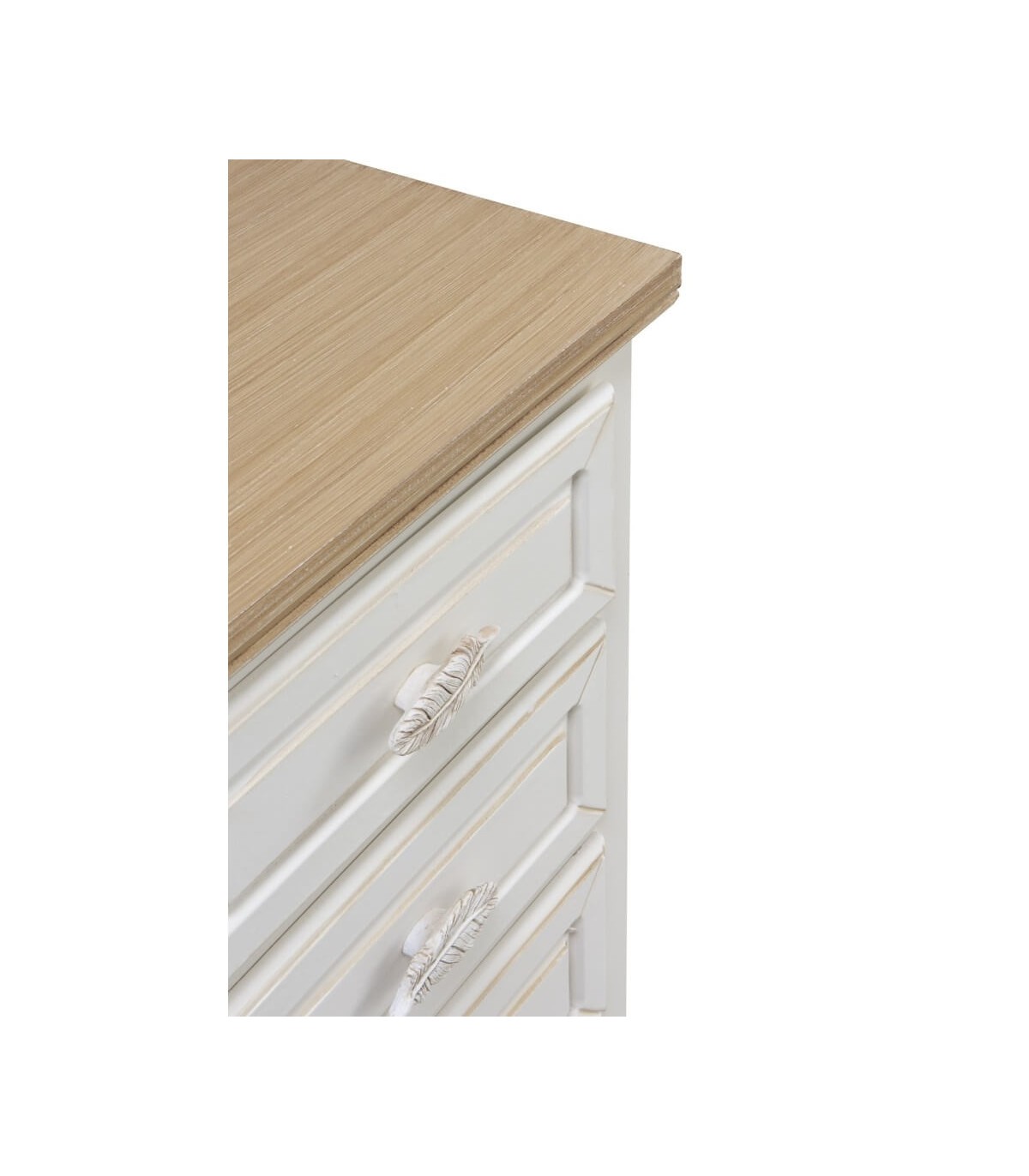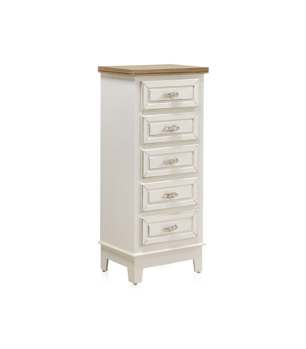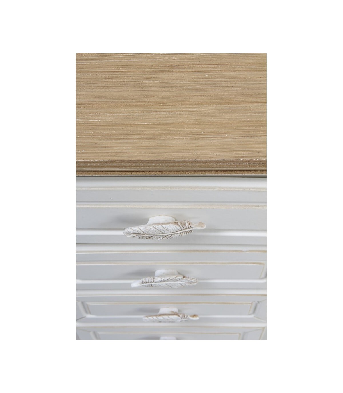 • Sifonier con 5 cajones, realizado en madera natural y blanco rozado, con el tirador en forma de hoja, una sifonier que viste mucho.