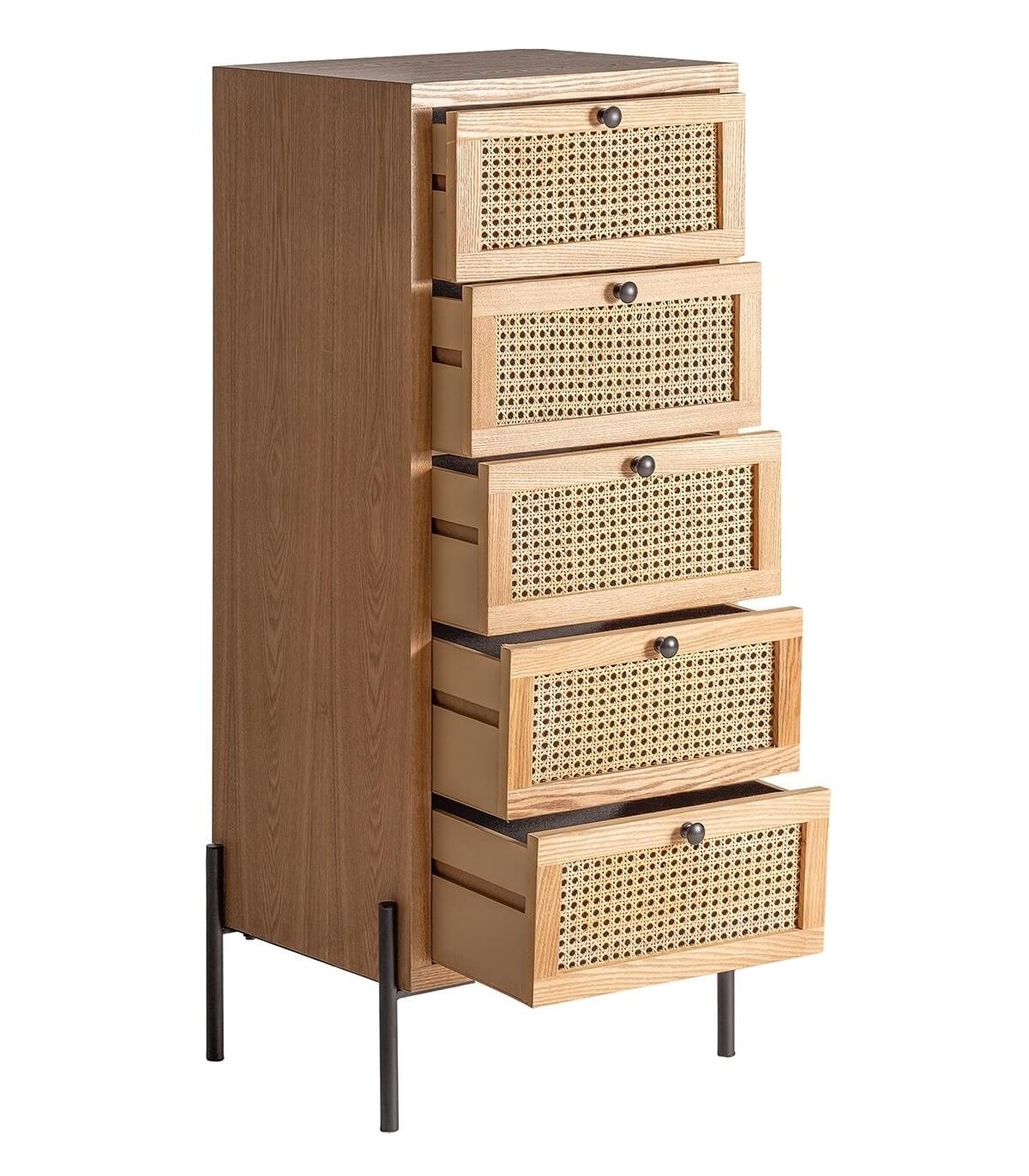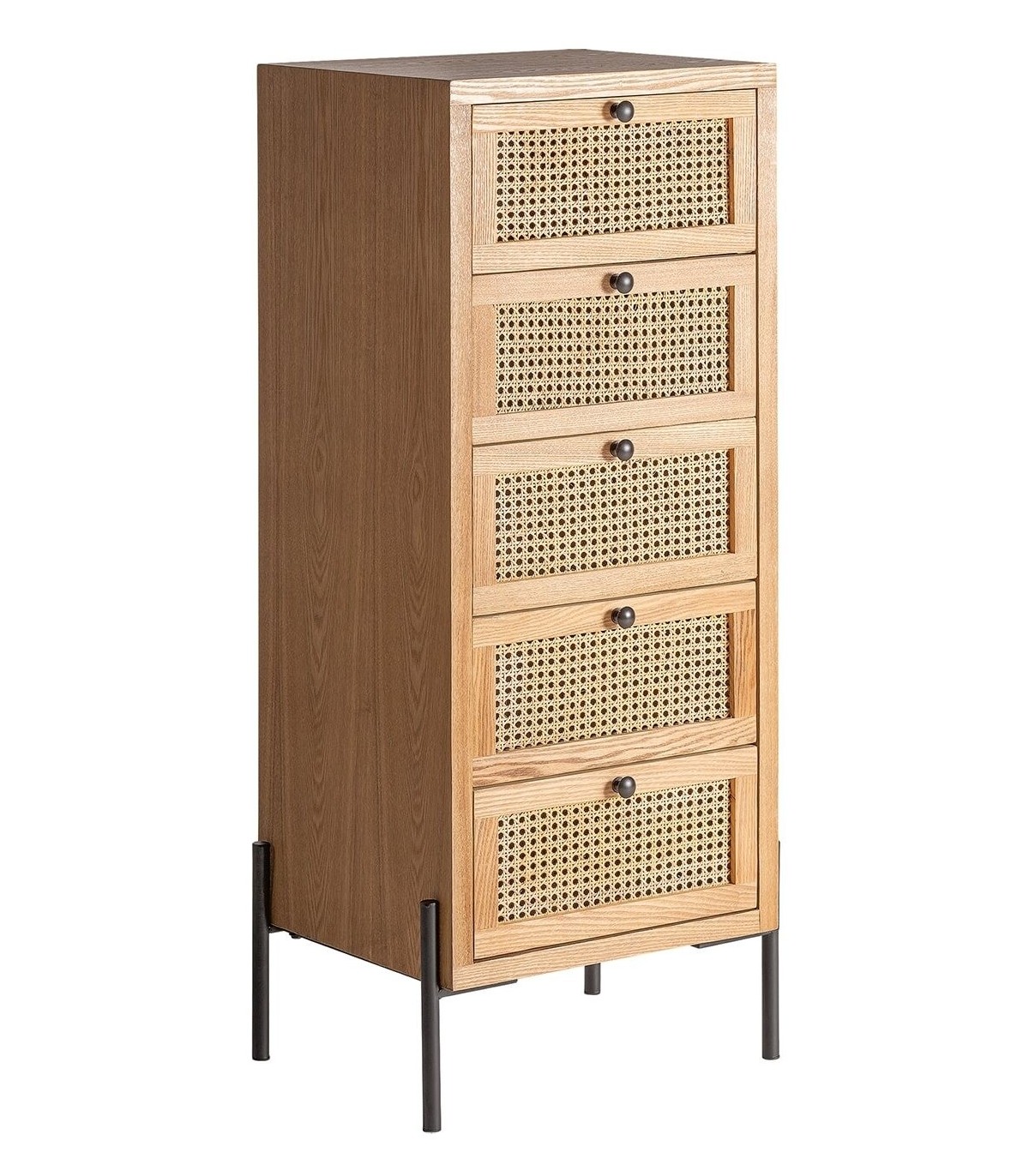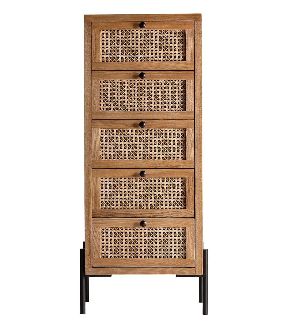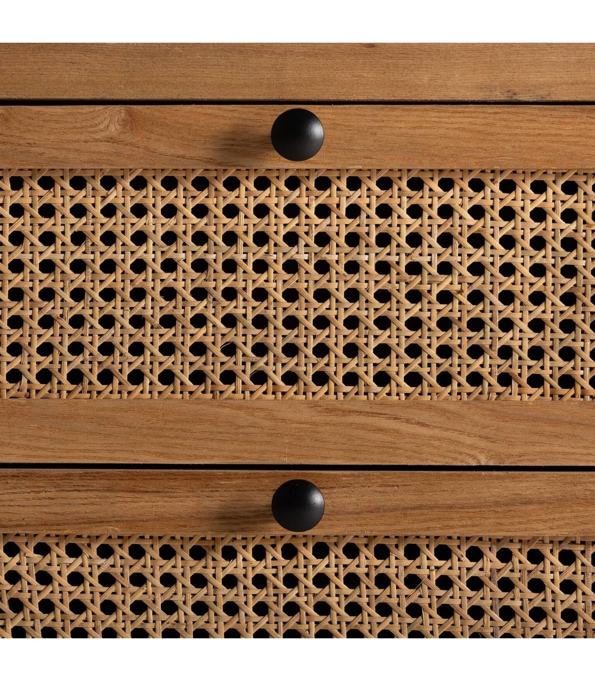 Sinfonier de nuestra colección Tezel, una colección que se caracteriza por sus frentes en ratán y sus patas en color negro, una colección de muebles a caballo entre el estilo colonial y el industrial que aporta muchas posibilidades a la hora de combinarlos.