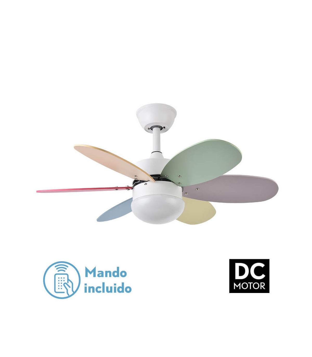 Ventilador DC serie Alves de color blanco con cinco aspas reversibles en colores pasteles o colores intensos y seis velocidades. Posee 2 portalámparas E27. Bombillas no incluidas. Tiene control remoto incluido con la opción verano/invierno y la opción de temporizador de 1 hasta 4 horas. El cuerpo del ventilador es de metal y policarbonato; y las aspas de madera mdf.