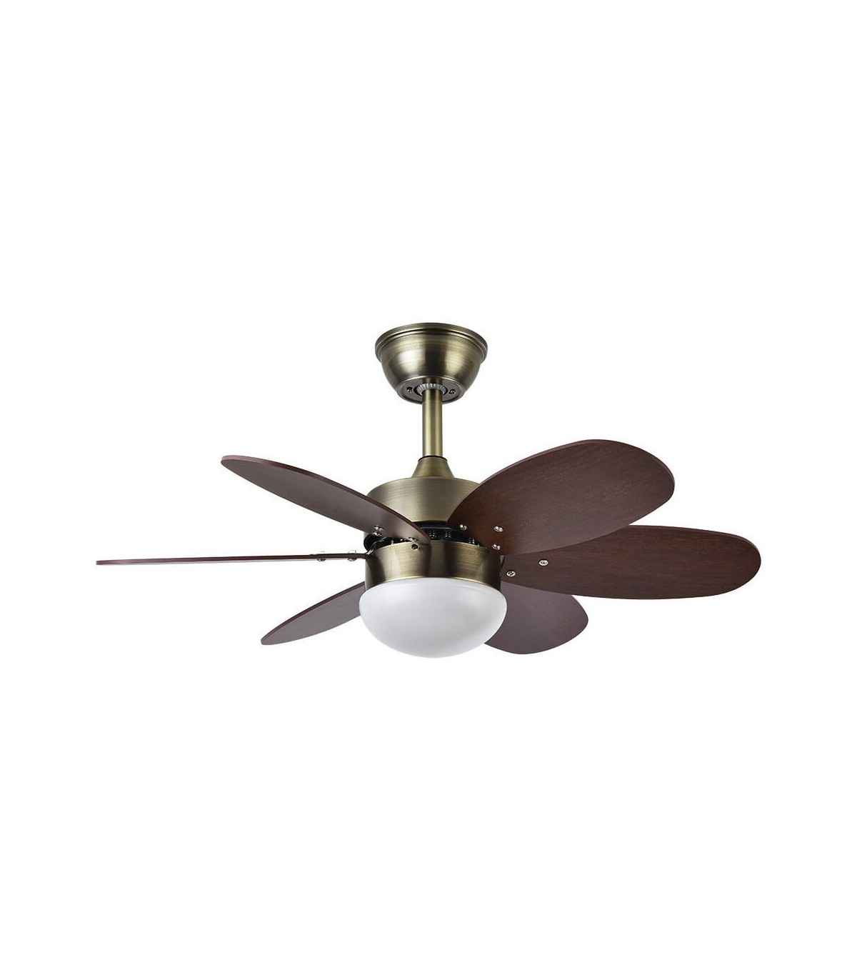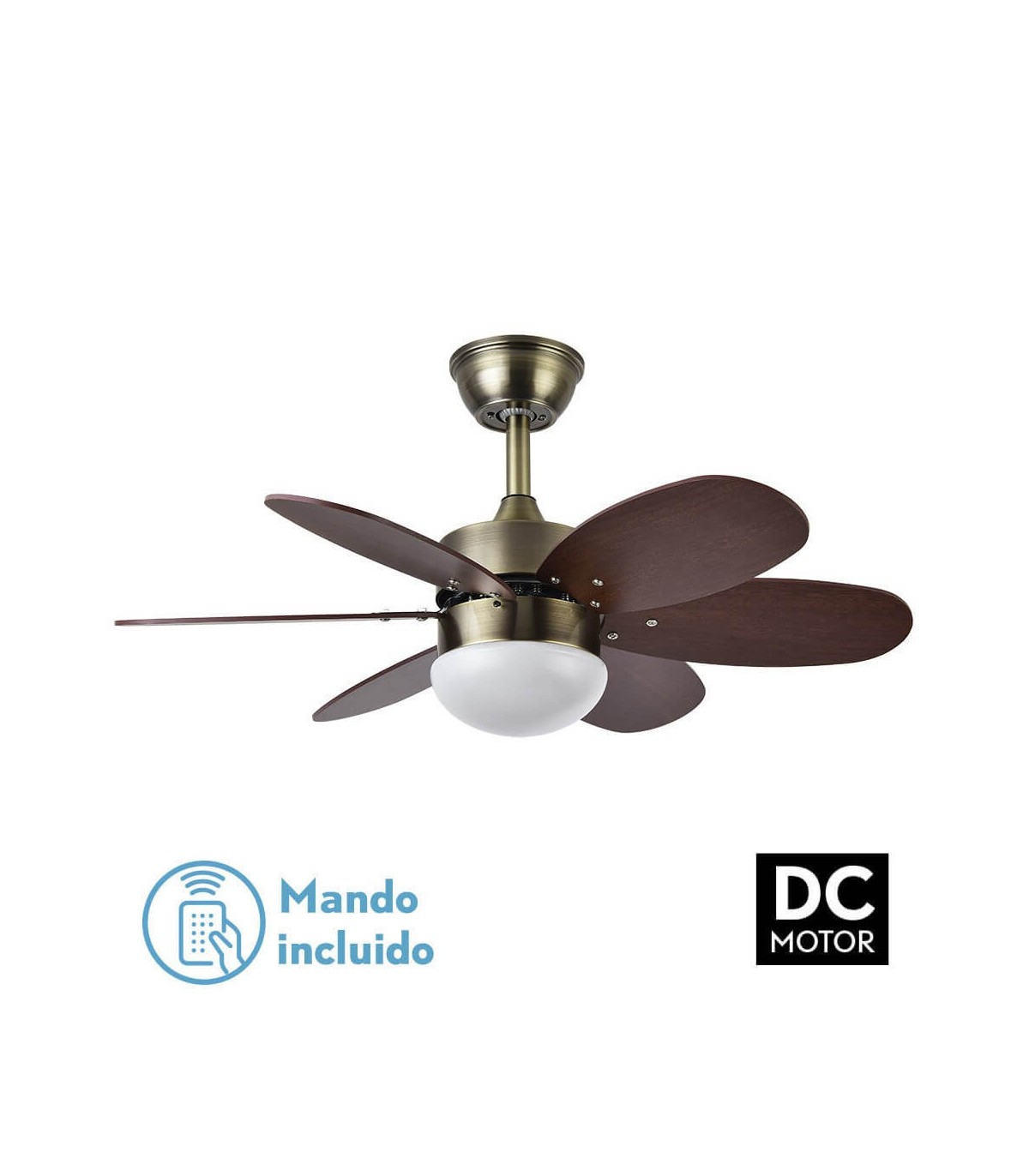 Ventilador DC serie Alves de color oro viejo con cinco aspas reversibles en color cerezo y nogal y seis velocidades. Posee 2 portalámparas E27. Bombillas no incluidas. Tiene control remoto incluido con la opción verano/invierno y la opción de temporizador de 1 hasta 4 horas. El cuerpo del ventilador es de metal y policarbonato; y las aspas de madera mdf.
