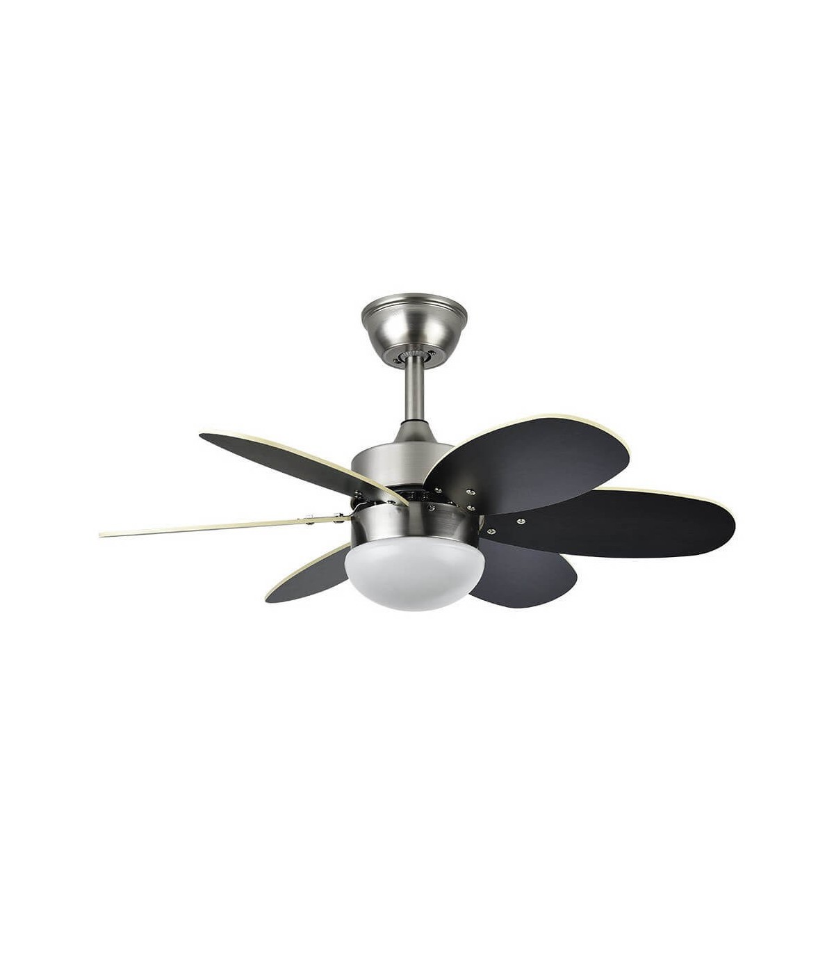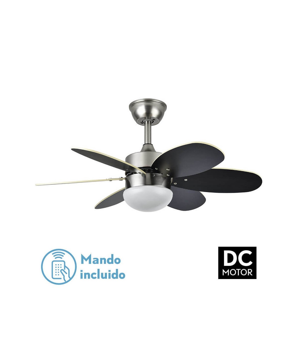 Ventilador DC serie Alves de color níquel con cinco aspas reversibles en color wengue y haya natural y seis velocidades. Posee 2 portalámparas E27. Bombillas no incluidas. Tiene control remoto incluido con la opción verano/invierno y la opción de temporizador de 1 hasta 4 horas. El cuerpo del ventilador es de metal y policarbonato; y las aspas de madera mdf.