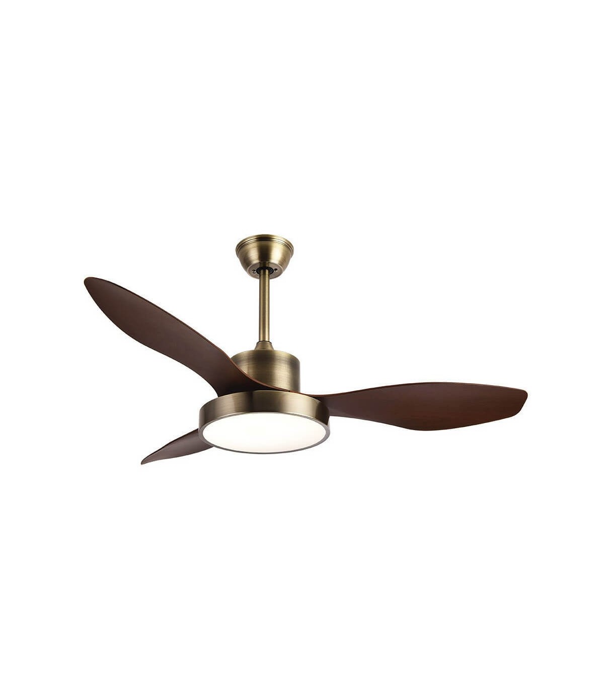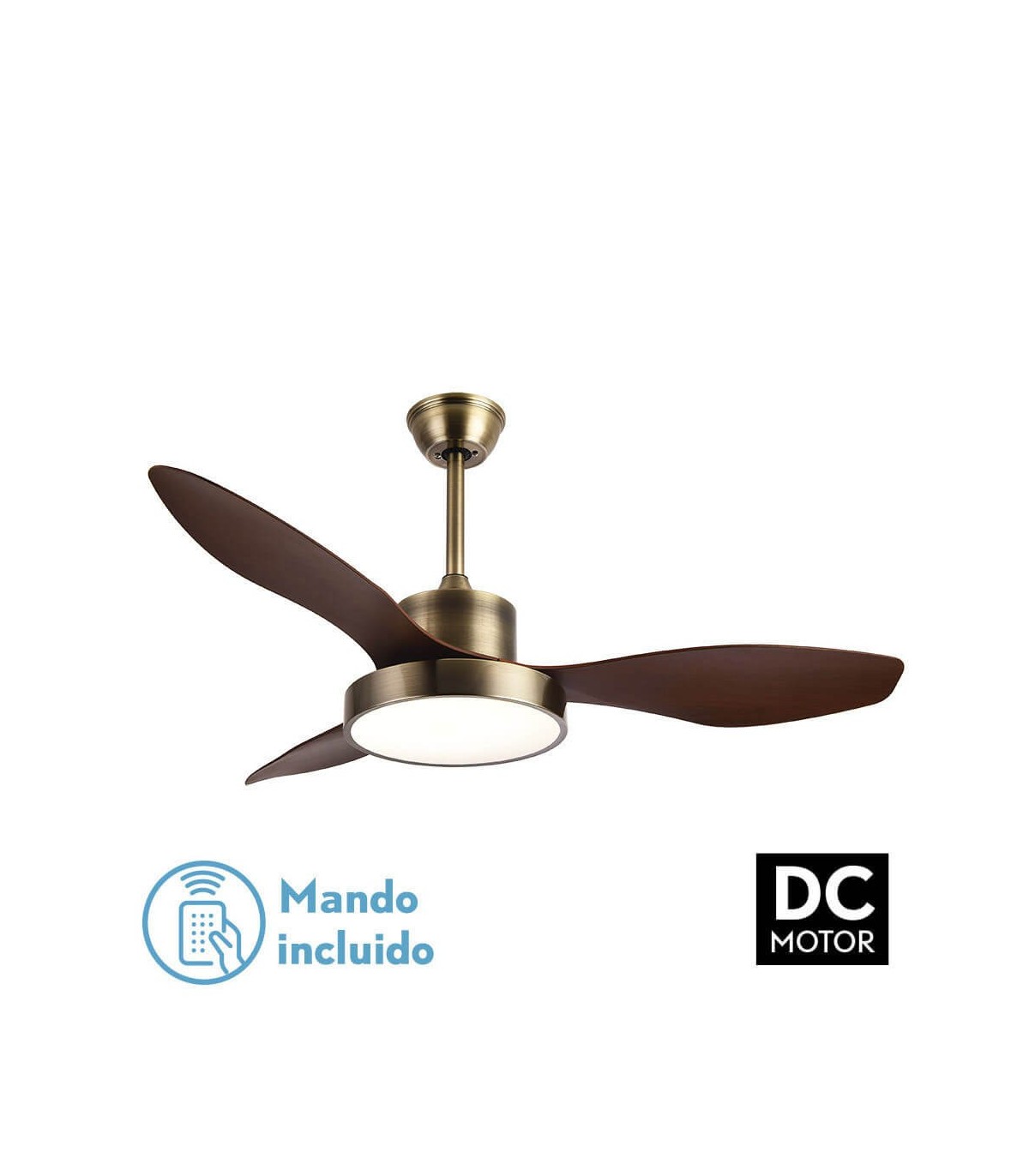 Ventilador Hayate realizado en metal, abs y policarbonato, en color oro viejo con tres aspas de color roble oscuro. Motor DC, tiene seis velocidades ajustables. Tecnología LED incorporada con una potencia de 48W, con 3 temperatura de luz( 3000-4000-6000K) y 4078 lúmenes. Viene con dos medidas de tija, lo que permite adaptarlo para distintas alturas de techo. Control de aire verano o invierno. Mando a distancia INCLUIDO con memoria de color incorporada y temporizador 1/2/4 H.