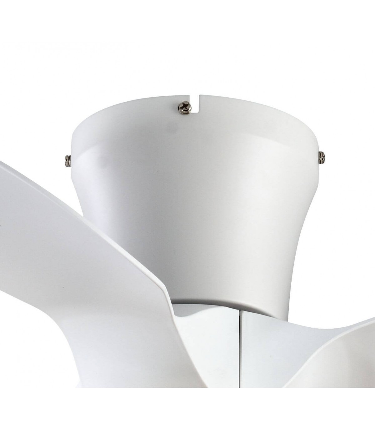 Ventilador Koslo de color blanco con 3 aspas en abs color blanco con un detalle en imitación de madera natura,l combinado con metal blanco. De diseño moderno, con líneas sencillas, pero muy decorativo por su estructura compacta, ideal para dormitorios y habitaciones juveniles.