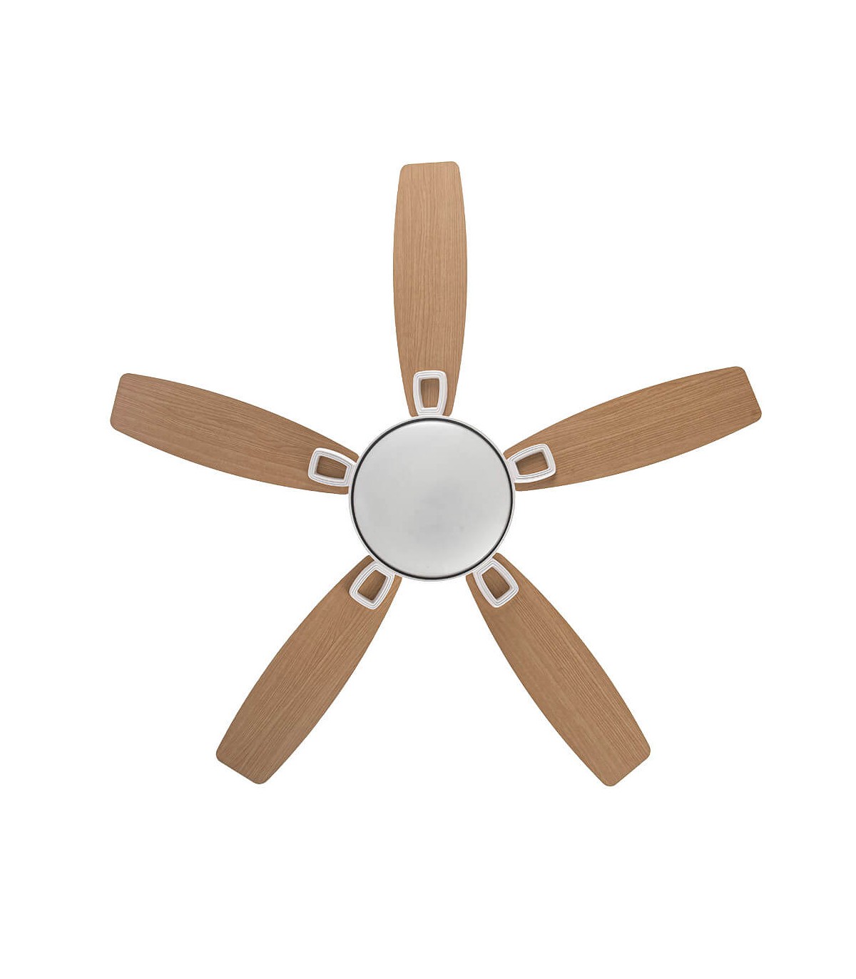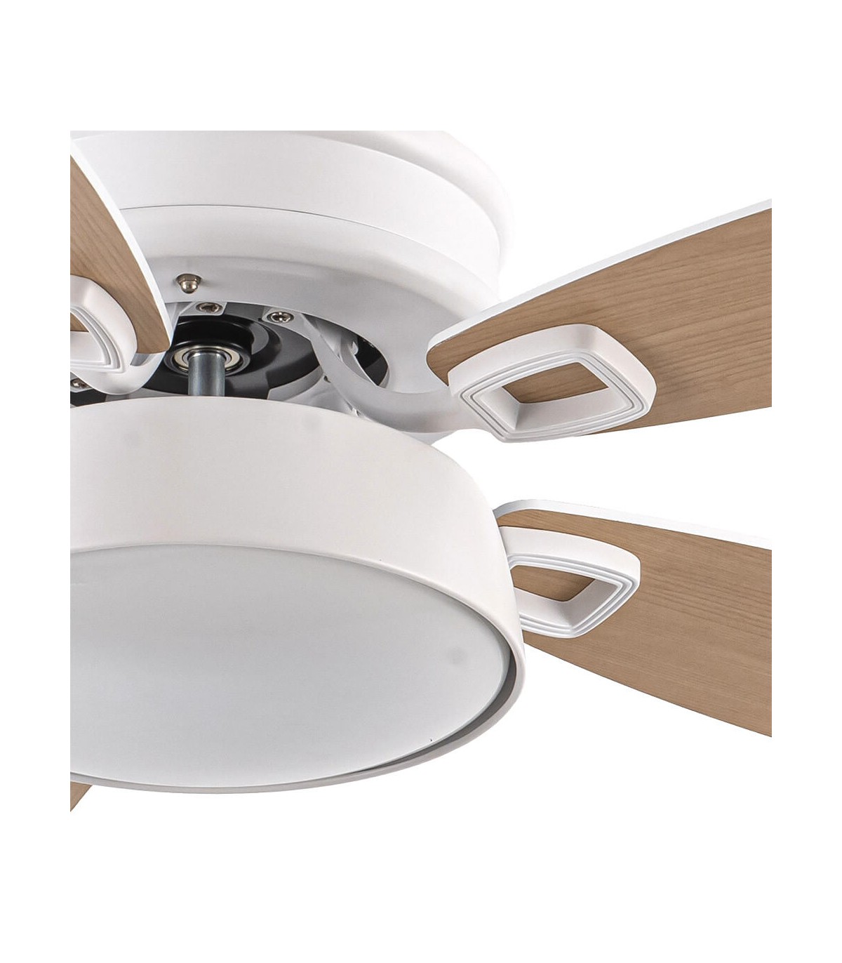 Ventilador Slow con 5 aspas en abs combinado imitación haya natural y blanco, metal blanco. De diseño contemporáneo con cierto aire colonial, con líneas sencillas, pero muy decorativo por su estructura compacta, ideal para dormitorios, comedores y salones.