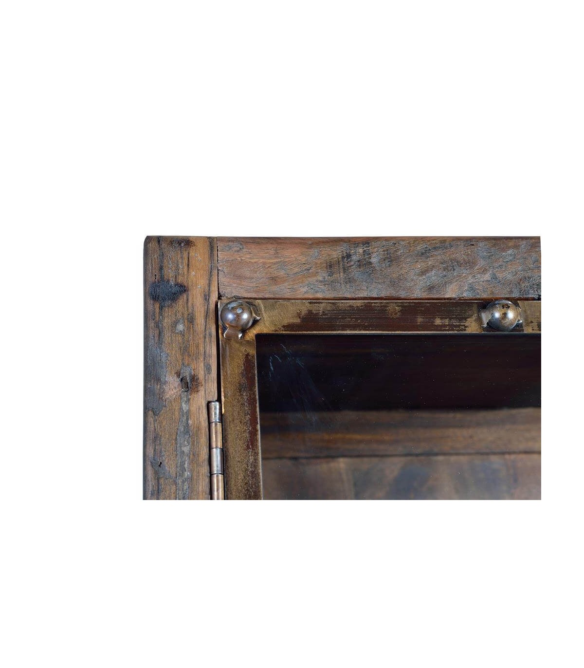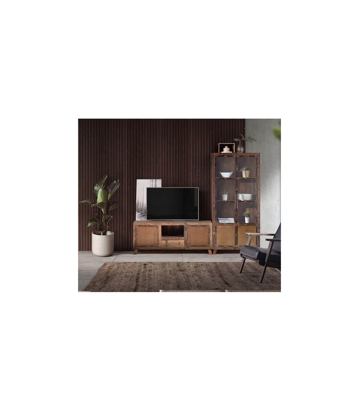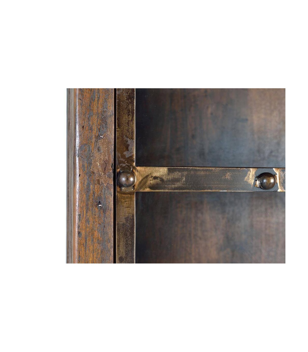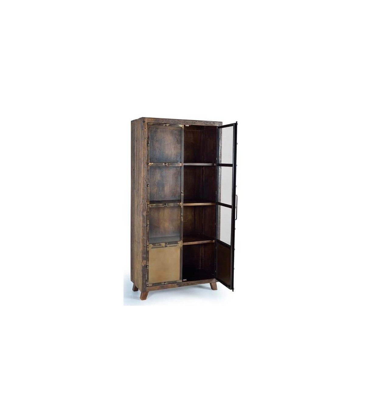 Vitrina robusta y de gran capacidad con 2 puertas realizada en madera recuperada de traviesas de ferrocarril, metal acabado oro viejo, cristal transparente, una vitrina pensada para espacios grandes.