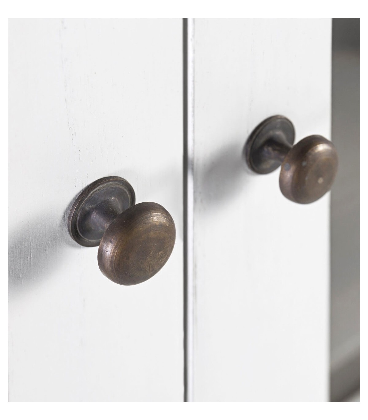 Acabado, estructura lacada en blanco, tapa y estantes en caoba natural, tiradores bronce.