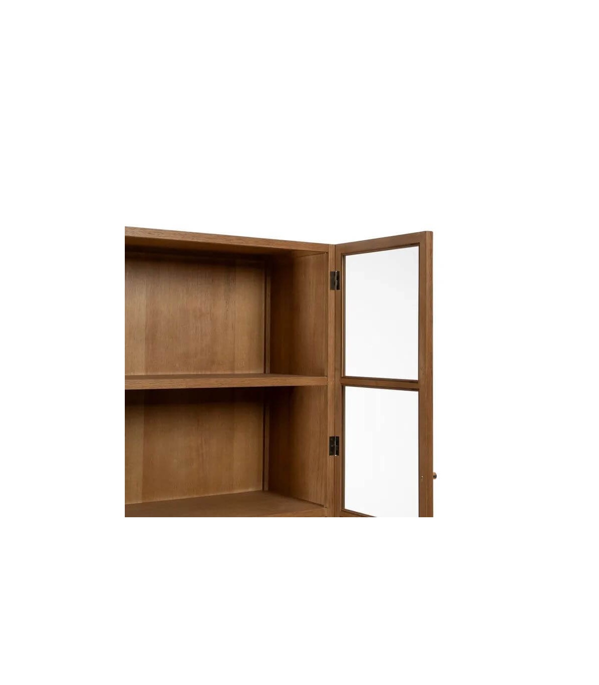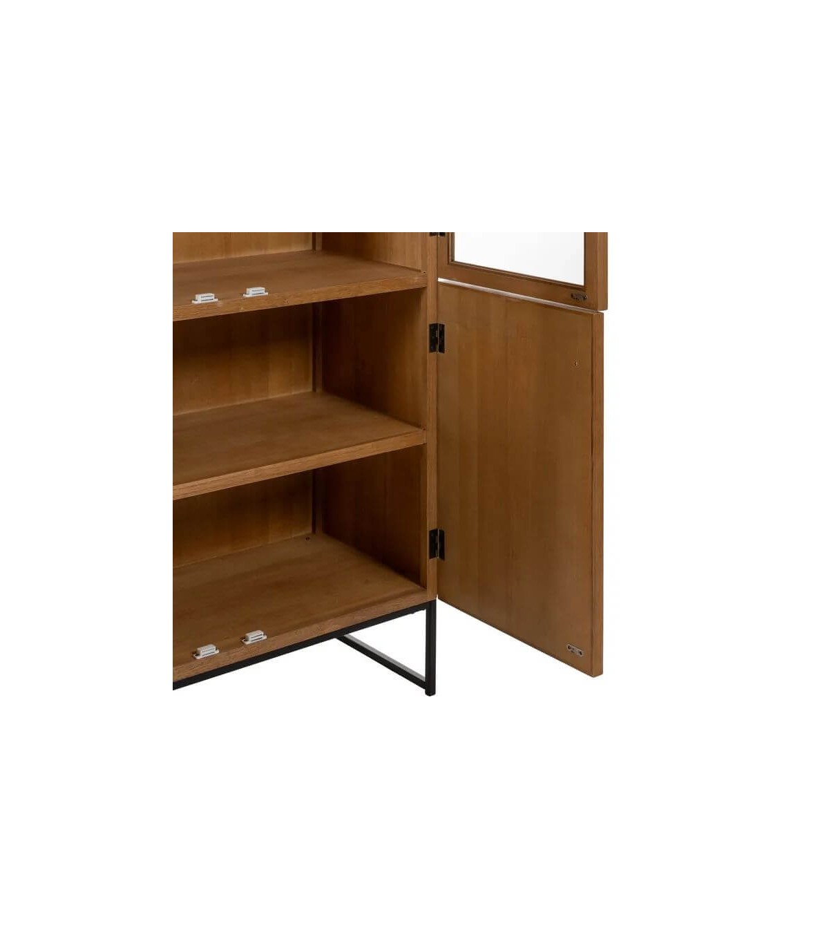 Vitrina, realizado en dm acabado fresno natural con las patas en metal negro, de estilo colonial. Dispone 4 puertas, vitrina espaciosa y muy decorativa.