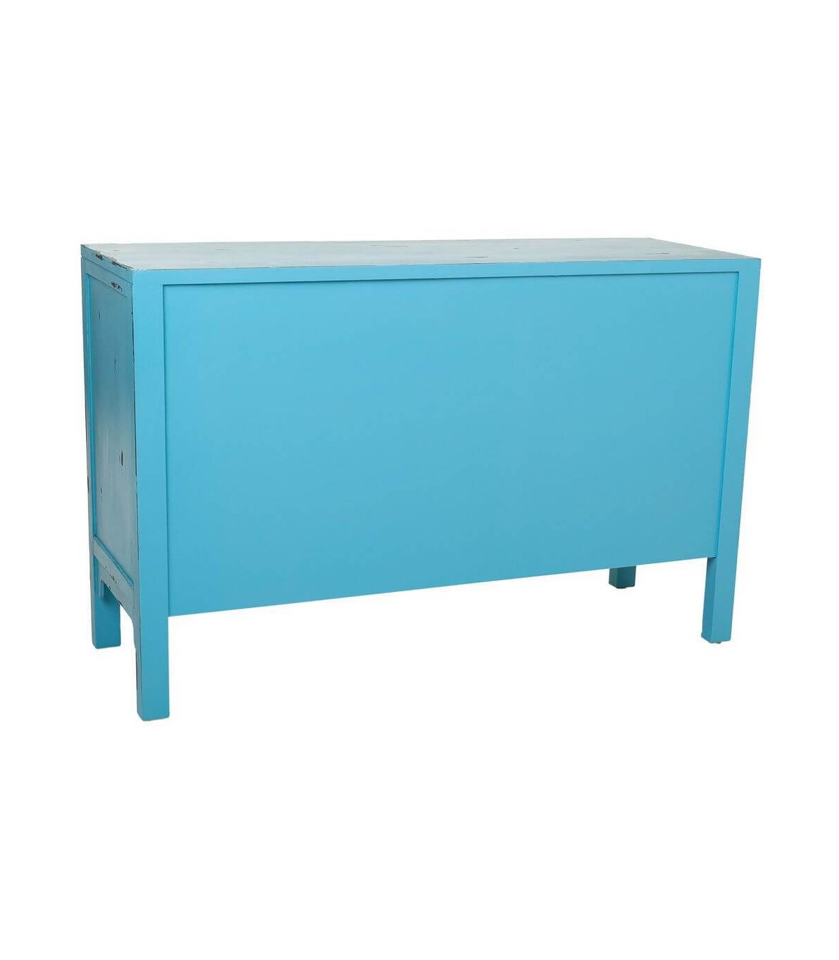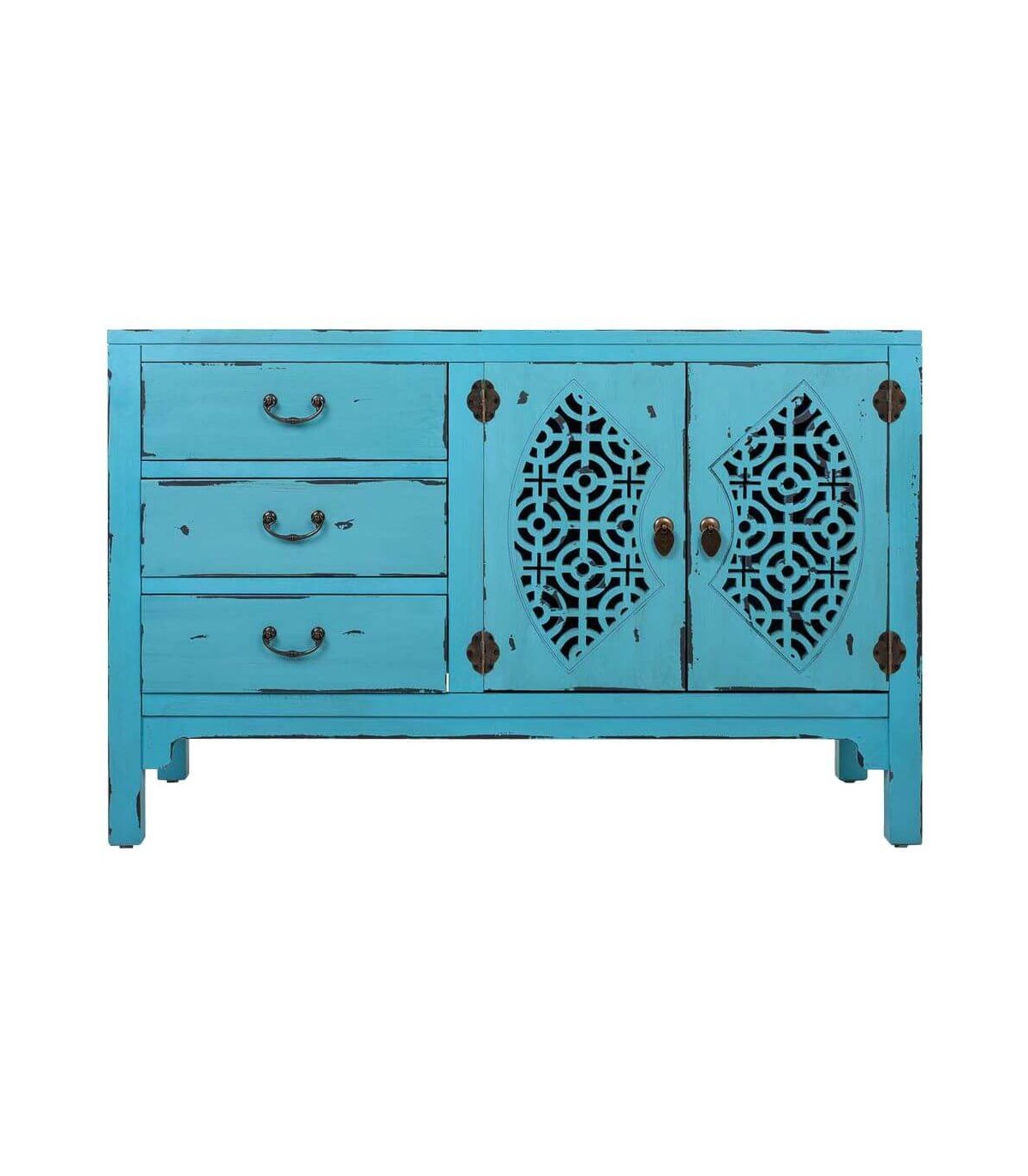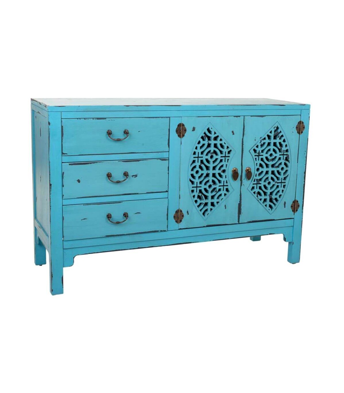 Cómoda de nuestra colección de muebles Makalu, una colección de inspiración oriental, realizada artesanalmente con los frentes de las puertas tallados a mano y decapado en tres colores diferentes, una fiesta de color que le dará alegría y viveza a a tu decoración.