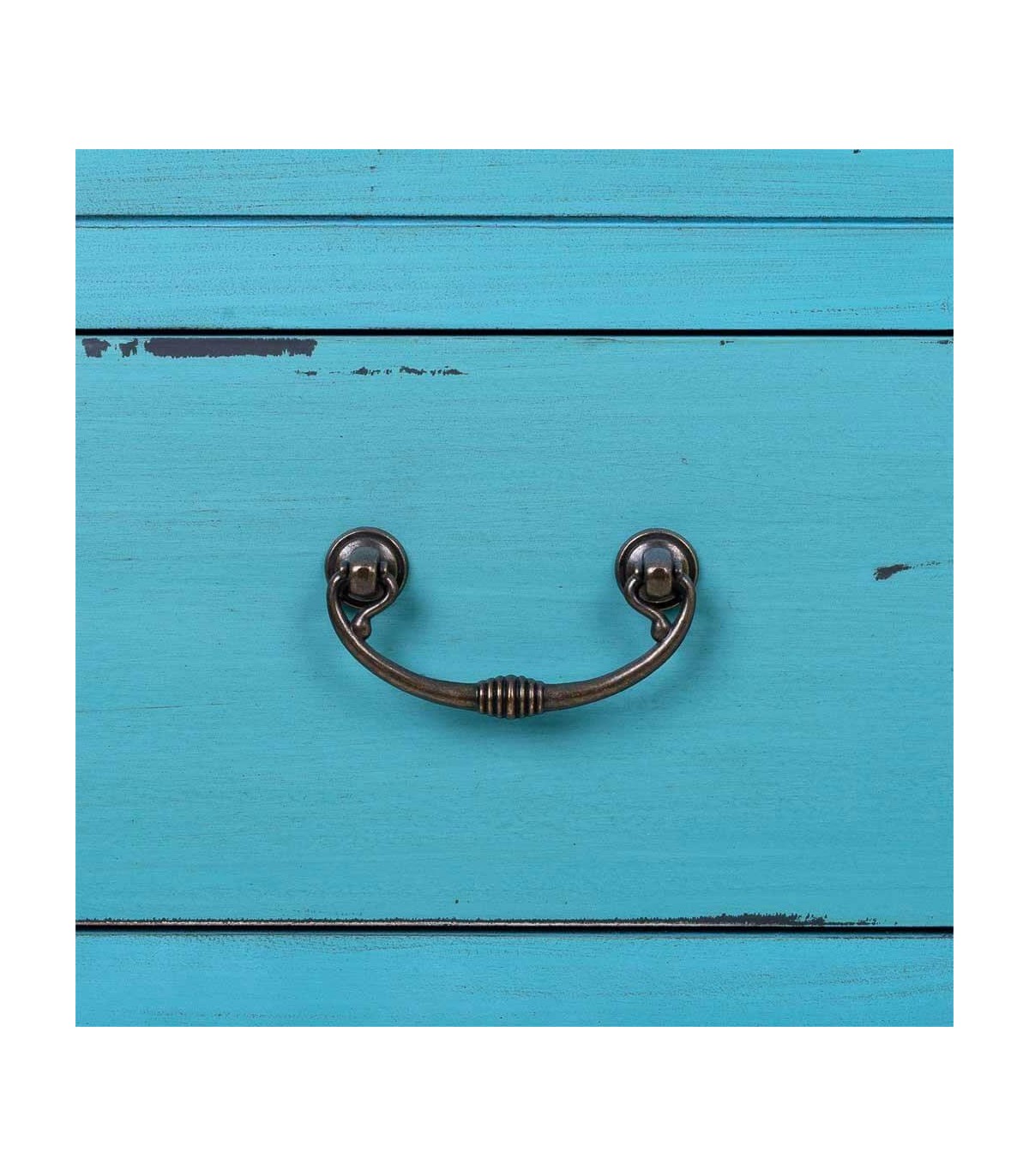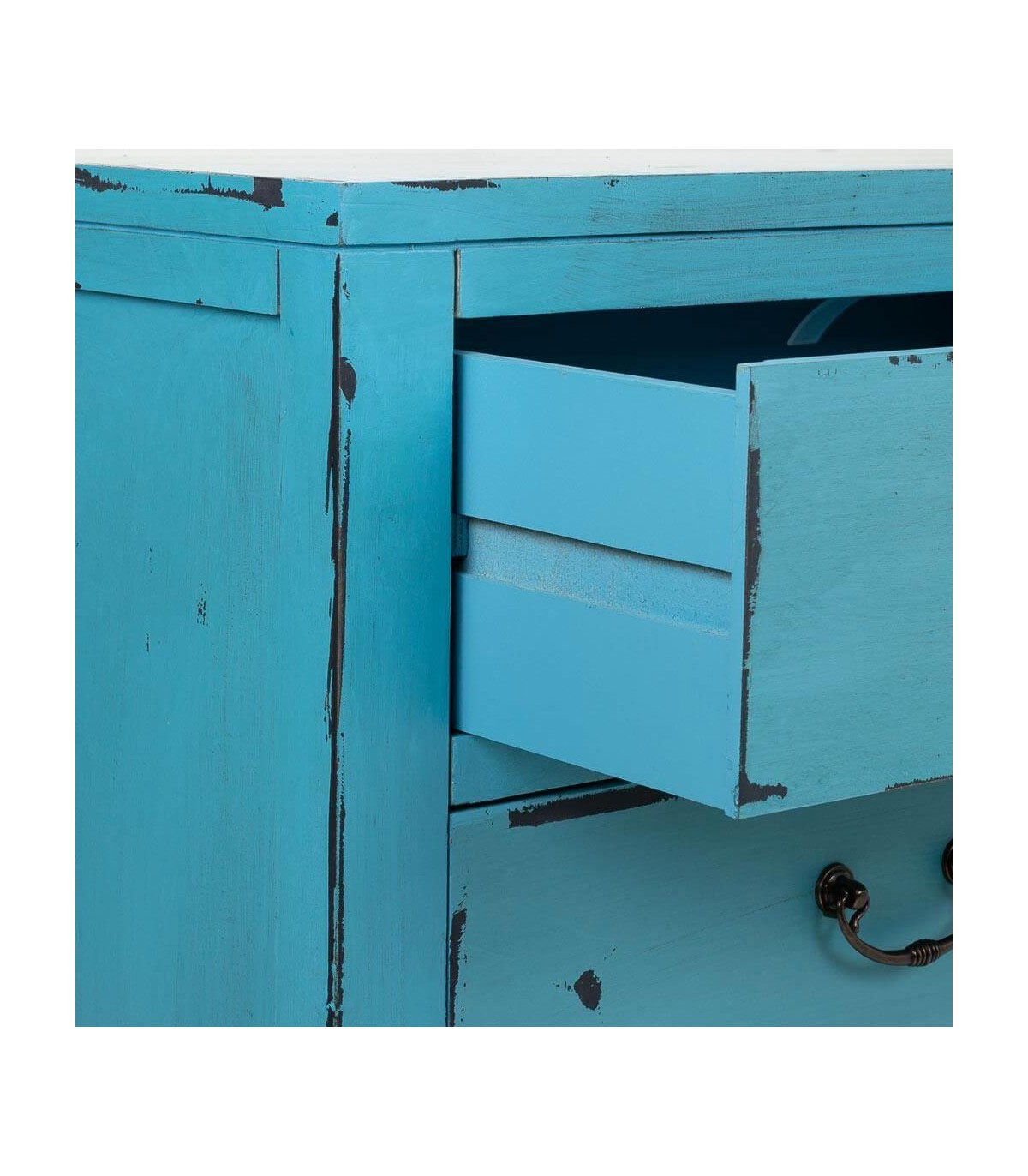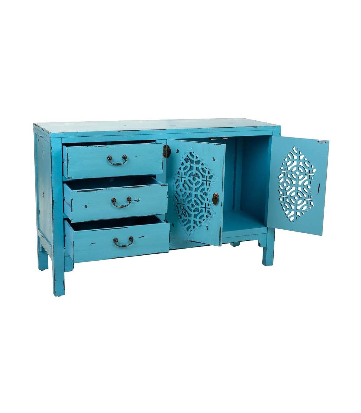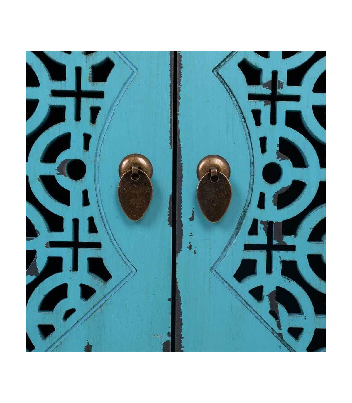 Acabado, artesanal, frente de las puertas talladas a mano, decapado azul, tiradores de bronce.