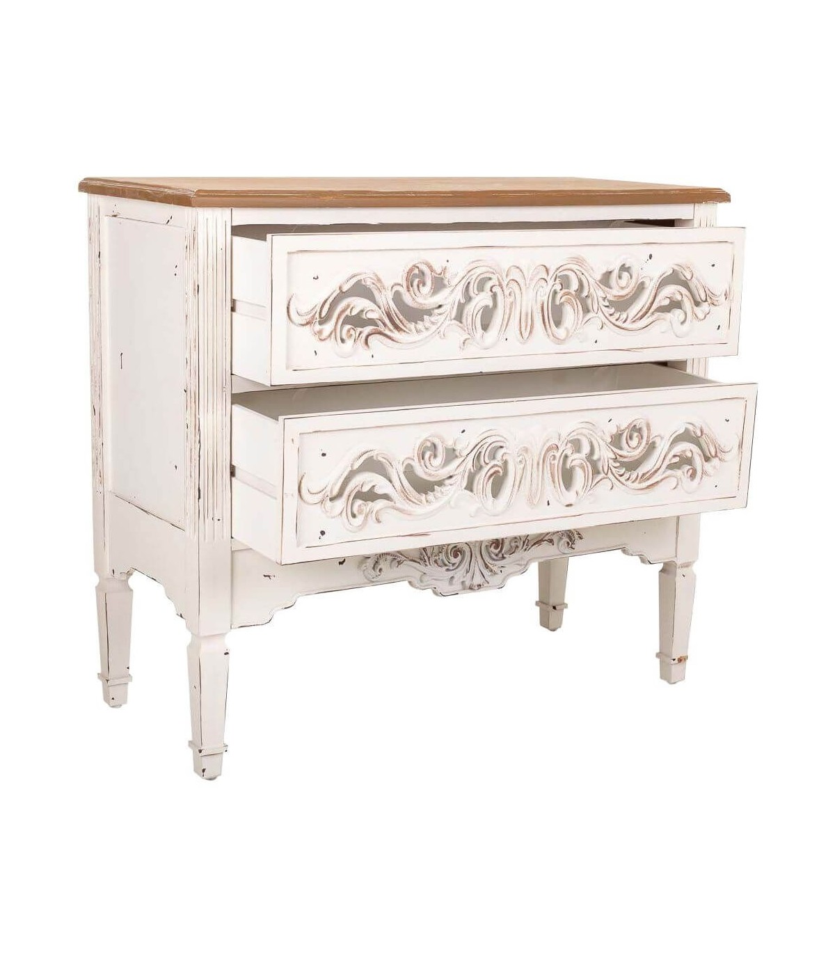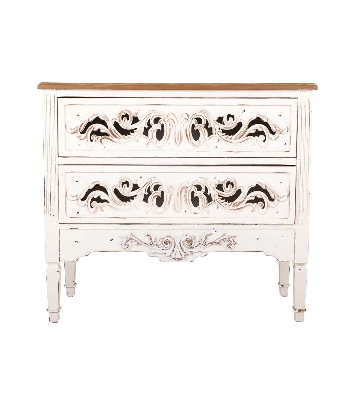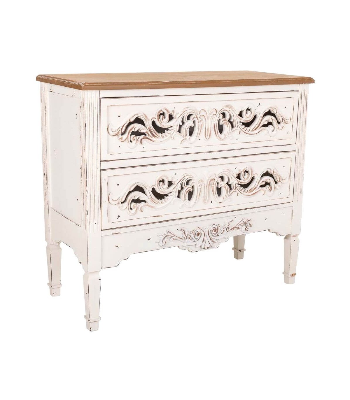 • Acabado, madera envejecida en blanco con puertas talladas a mano, tapa en madera natural.