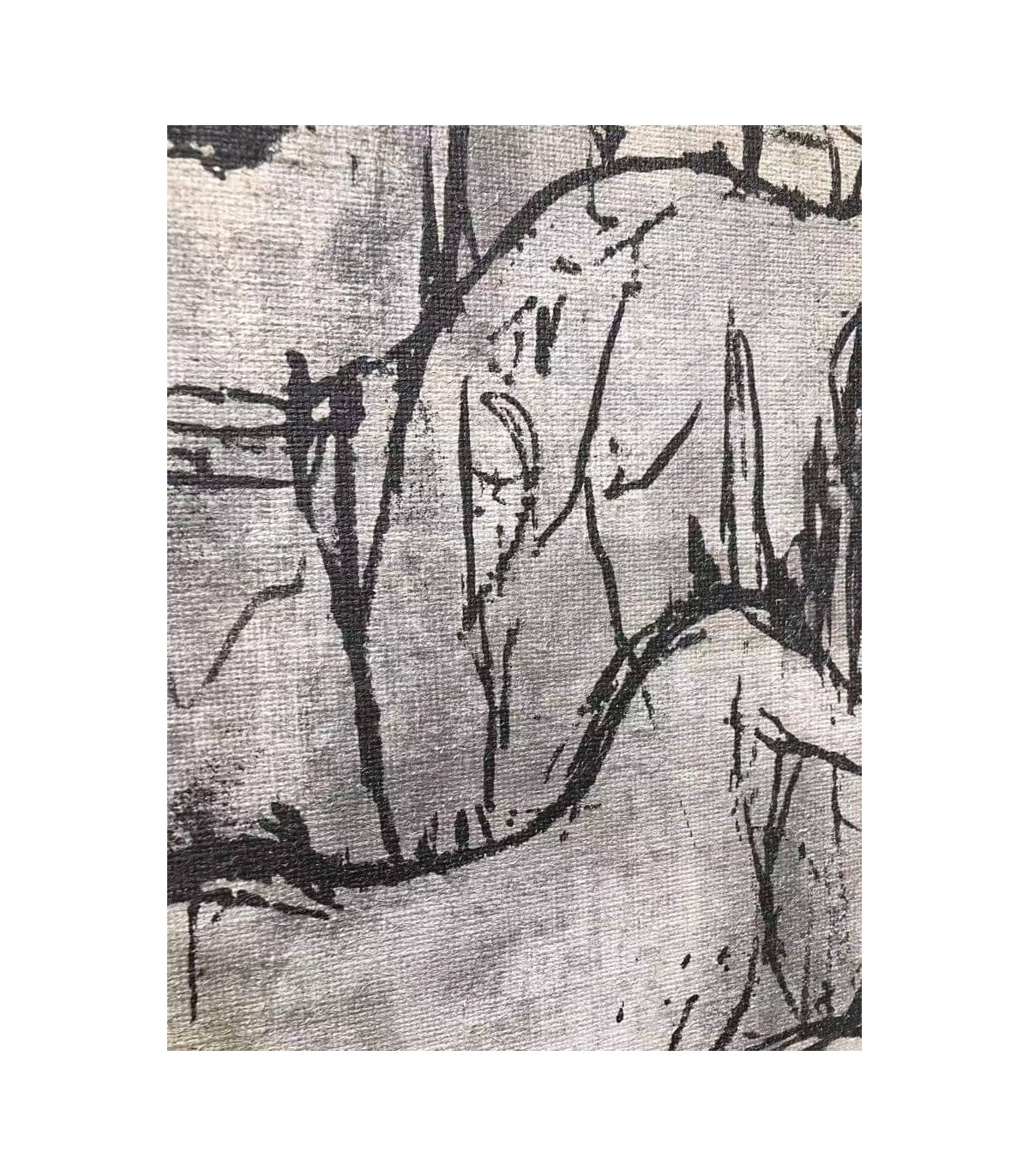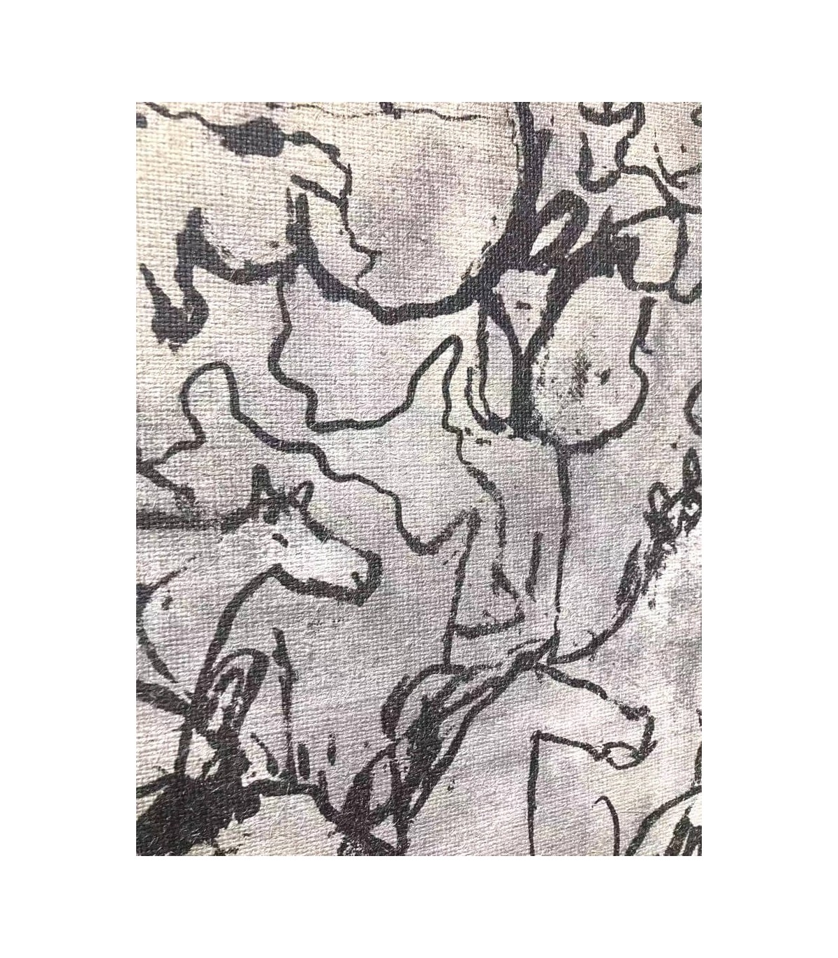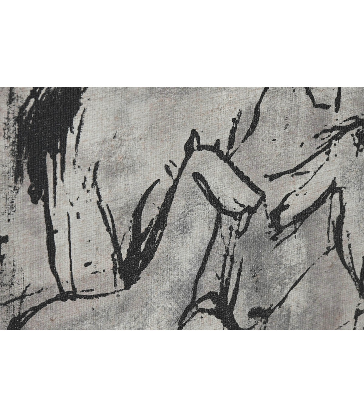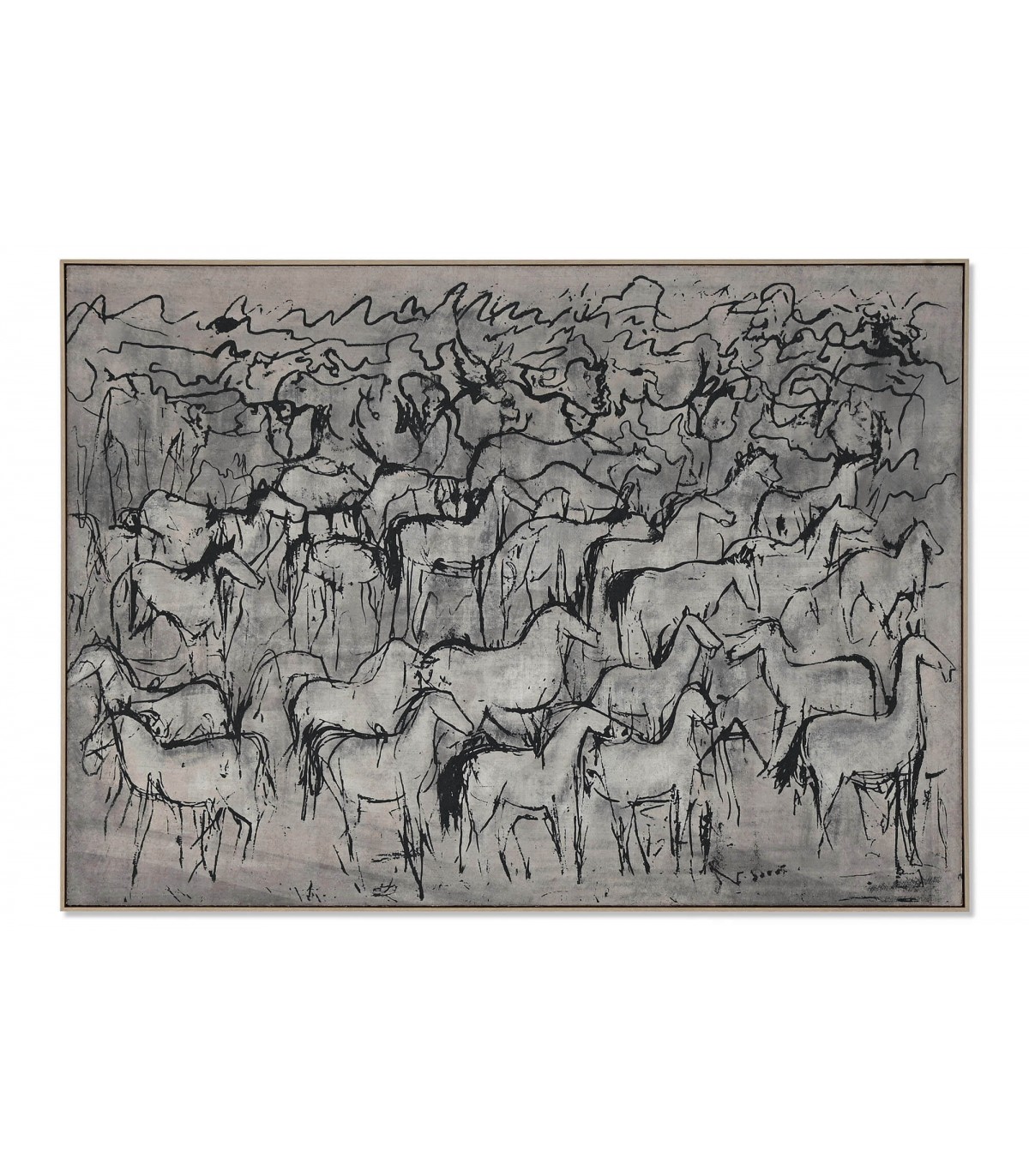 Este cuadro horizontal de gran formato representa una manada de caballos en movimiento, con una técnica gestual que transmite dinamismo y emoción. Pintado a mano sobre lienzo de yute en tonos grises y negros, combina expresión artística y estética serena.