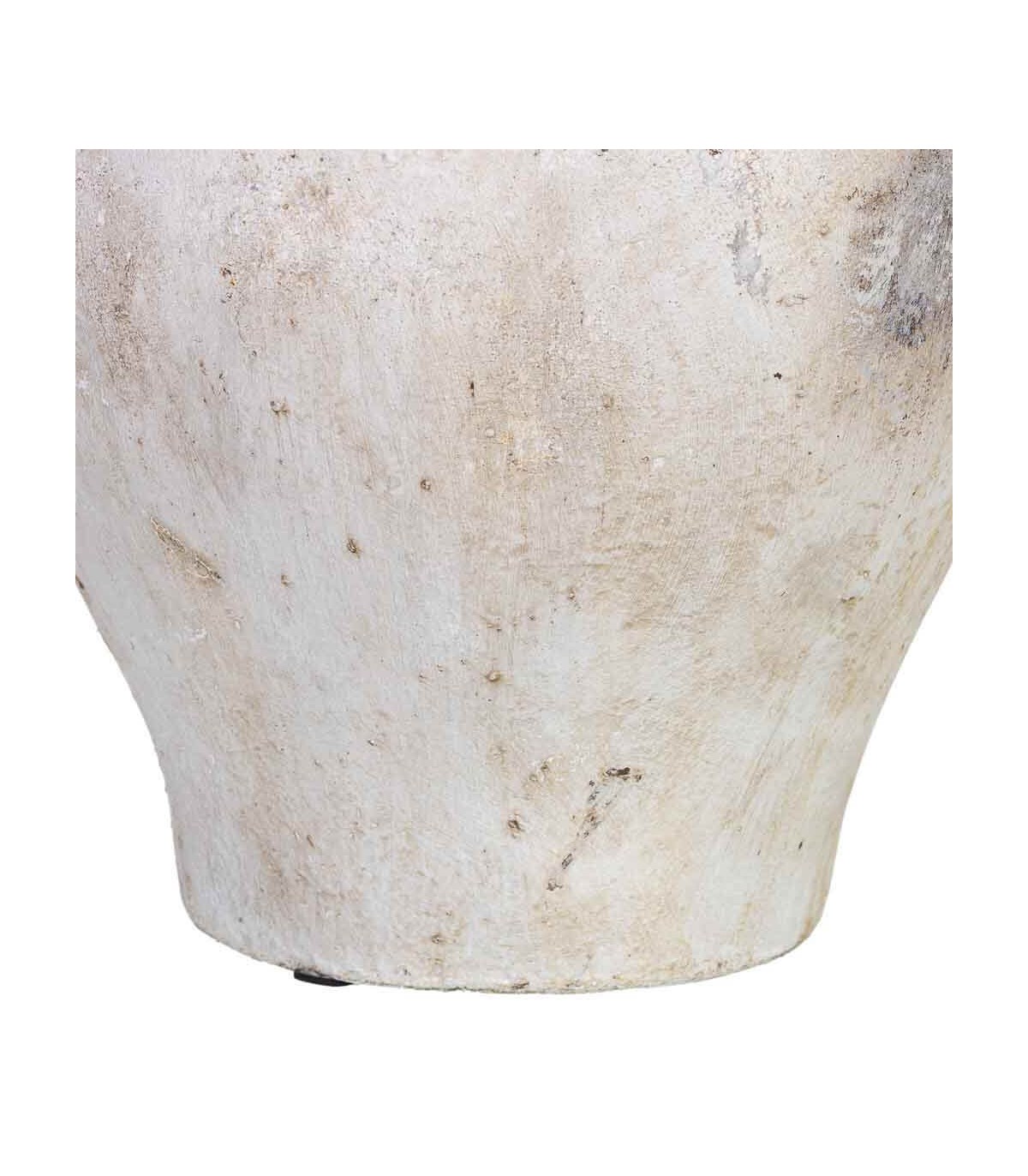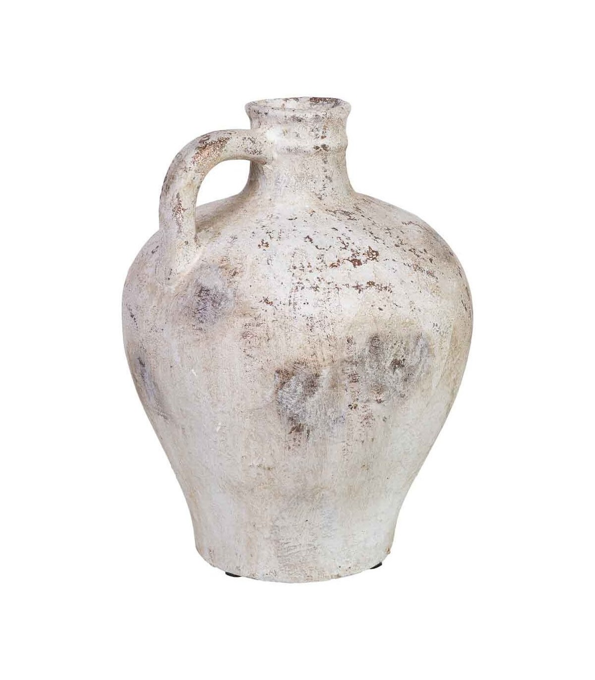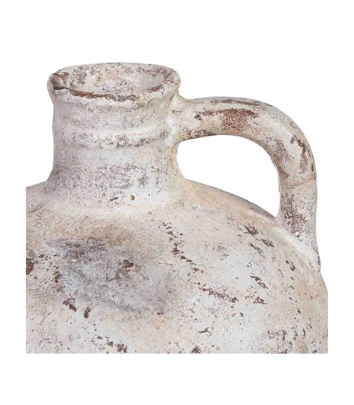 Este jarrón decorativo impresiona por su forma redondeada y su acabado blanco con efecto envejecido. Fabricado en magnesia con textura rugosa, simula el aspecto de la cerámica antigua con gran realismo. El diseño clásico con cuello estrecho y asa lateral evoca piezas tradicionales de alfarería mediterránea.