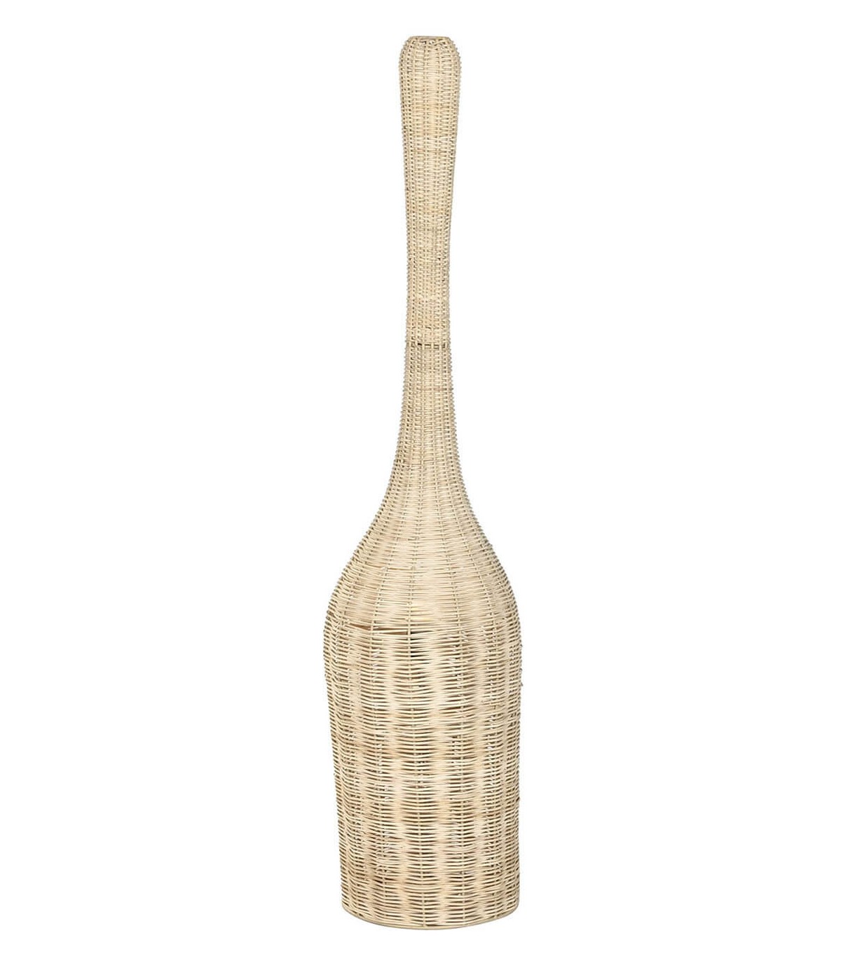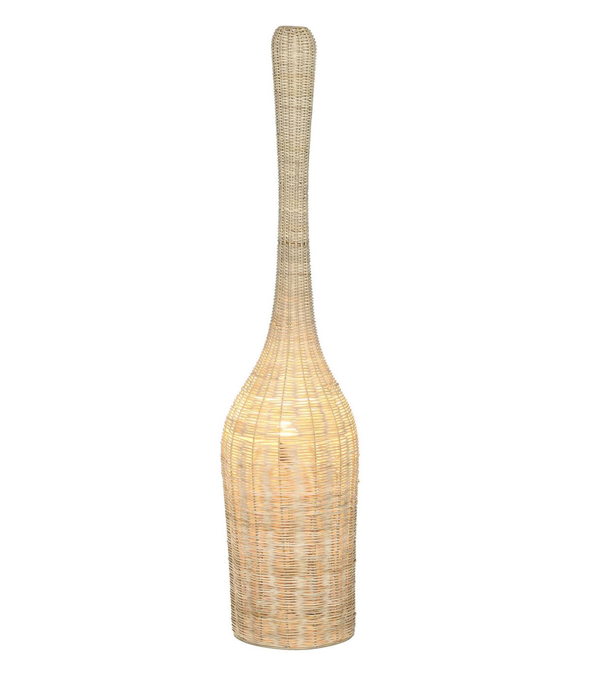 Esta lámpara de pie alargada y escultórica está elaborada en ratán natural trenzado a mano sobre estructura metálica, aportando ligereza y textura artesanal. Su silueta estilizada recuerda a las antiguas damajuanas malladas, reinterpretadas en clave mediterránea.