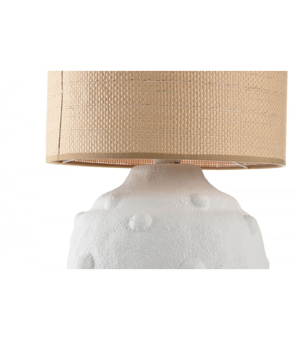 Ilumina tu hogar con un toque natural y mediterráneo gracias a esta lámpara de sobremesa con carácter propio. Su base de cerámica blanca rugosa aporta textura y presencia, mientras que la pantalla cilíndrica en fibra natural crea una luz cálida y envolvente.