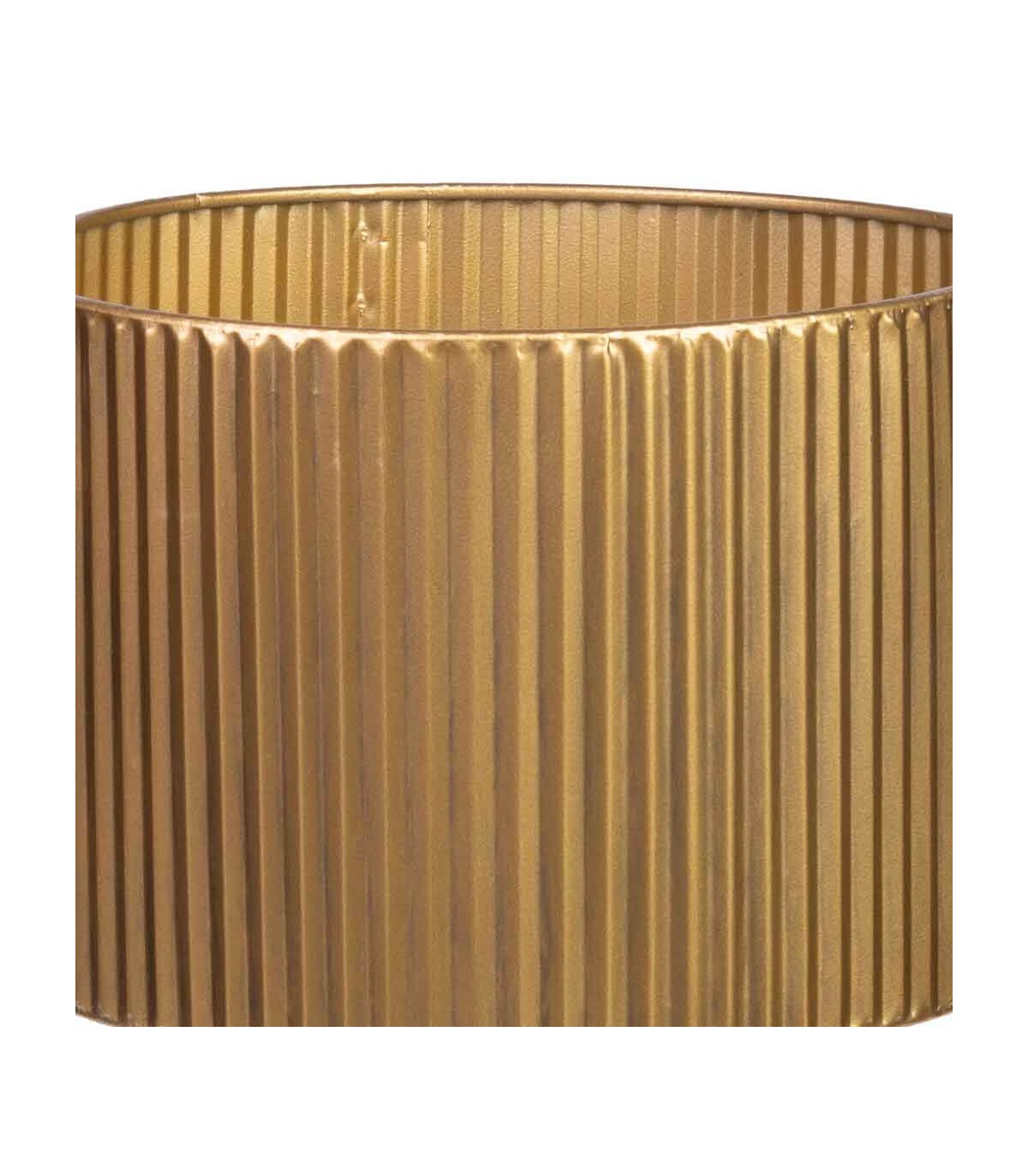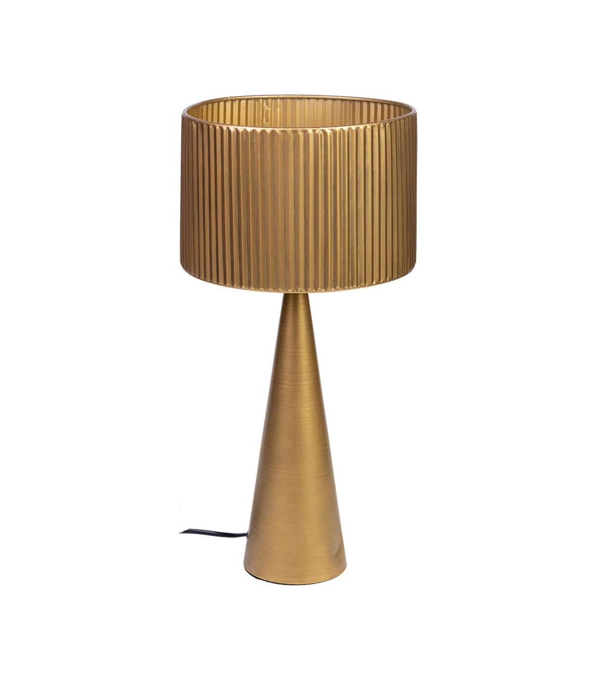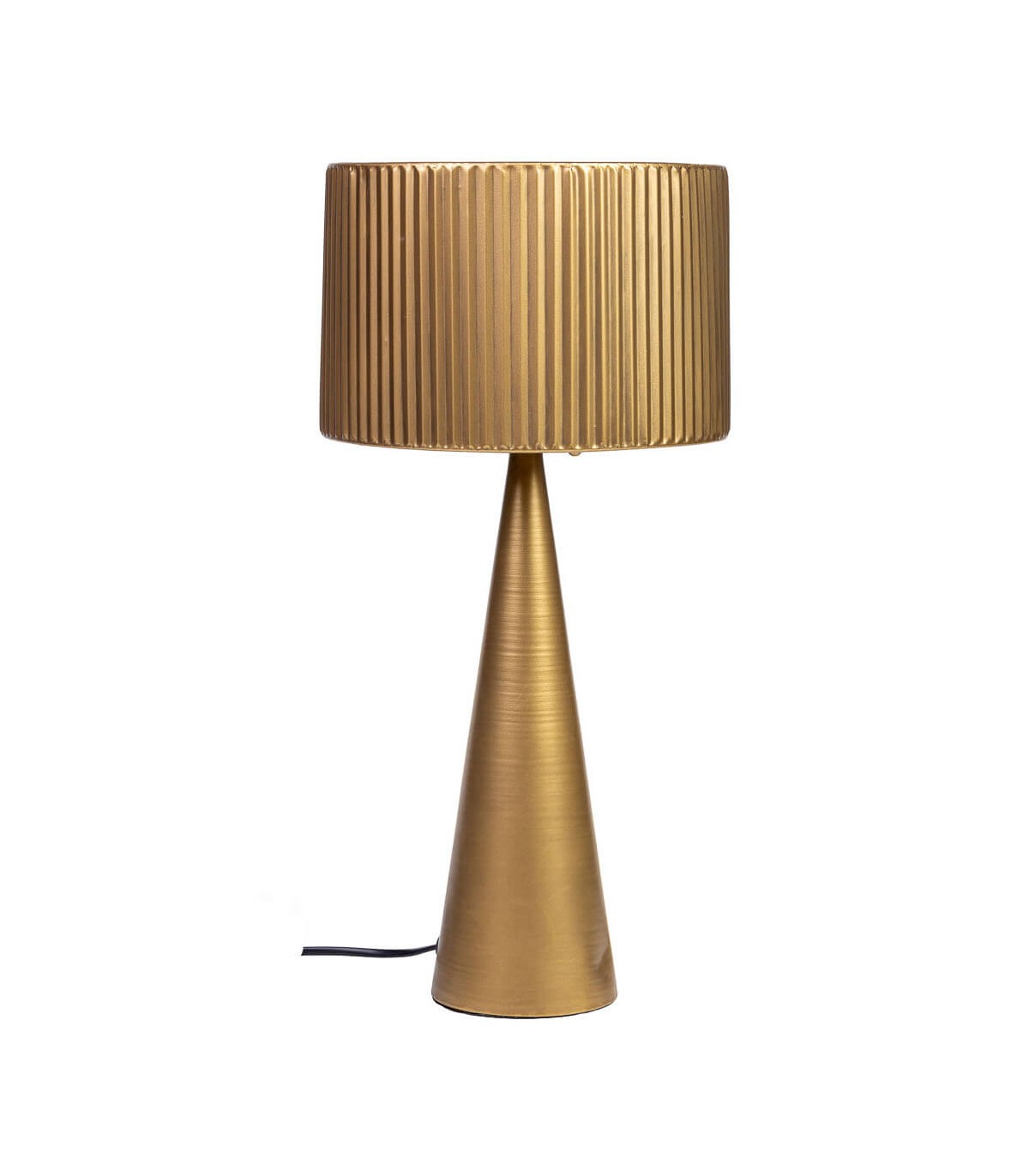 Una lámpara de sobremesa que aporta un toque de glamour refinado. Su estructura cónica estilizada se complementa con una pantalla cilíndrica acanalada, ambas realizadas en acero con un elegante acabado dorado satinado.