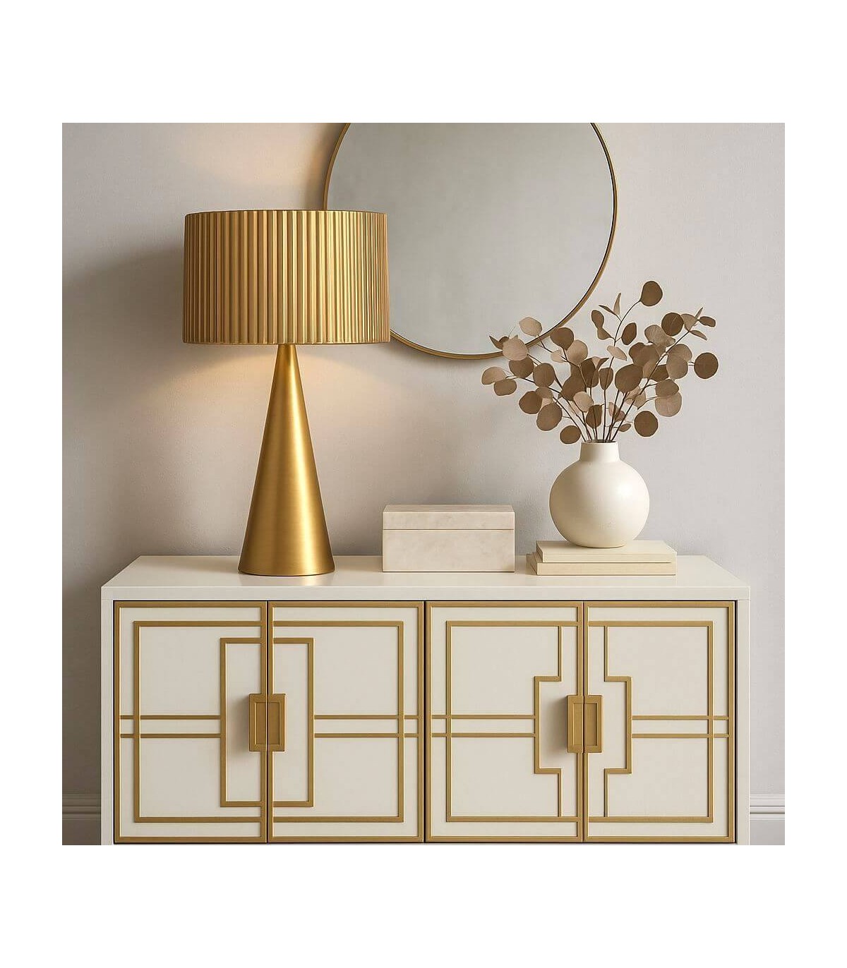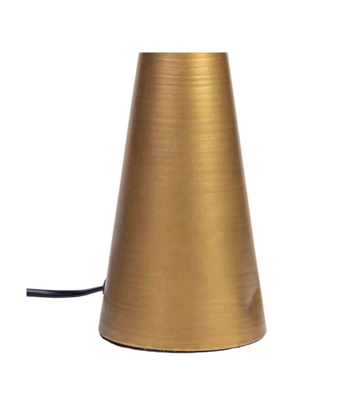La forma geométrica y el acabado metálico crean un efecto de luz cálido y sofisticado, ideal para salones, dormitorios o rincones de lectura con estilo art decó. Esta pieza combina diseño decorativo y funcionalidad, iluminando cualquier ambiente con distinción. Un acento dorado que realza la decoración sin sobrecargarla.