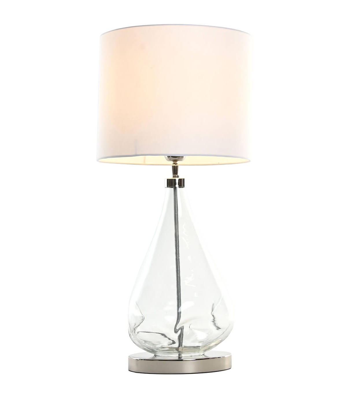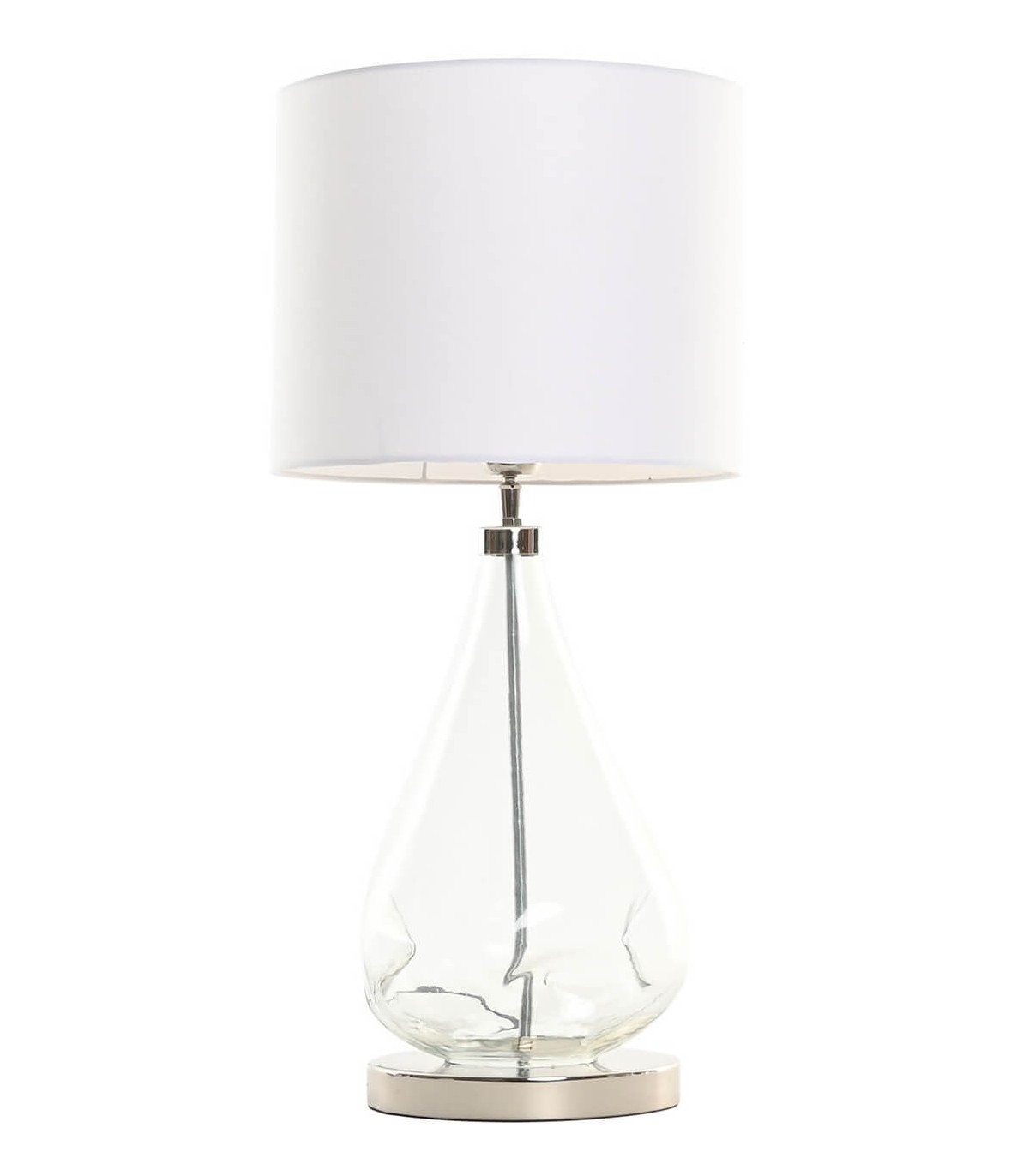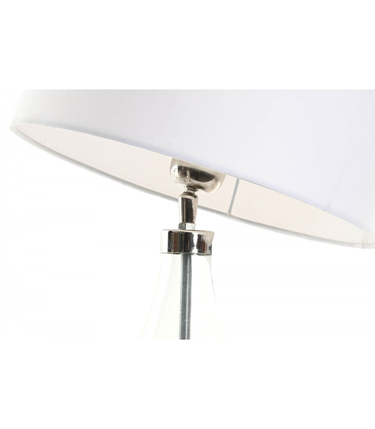 Descubre una luminaria elegante y moderna con esta lámpara de sobremesa de líneas suaves y refinadas. Su base de cristal orgánico transparente con formas fluidas transmite naturalidad y sofisticación. El metal cromado añade un toque brillante y actual, mientras que la pantalla textil blanca en algodón aporta calidez a la iluminación.