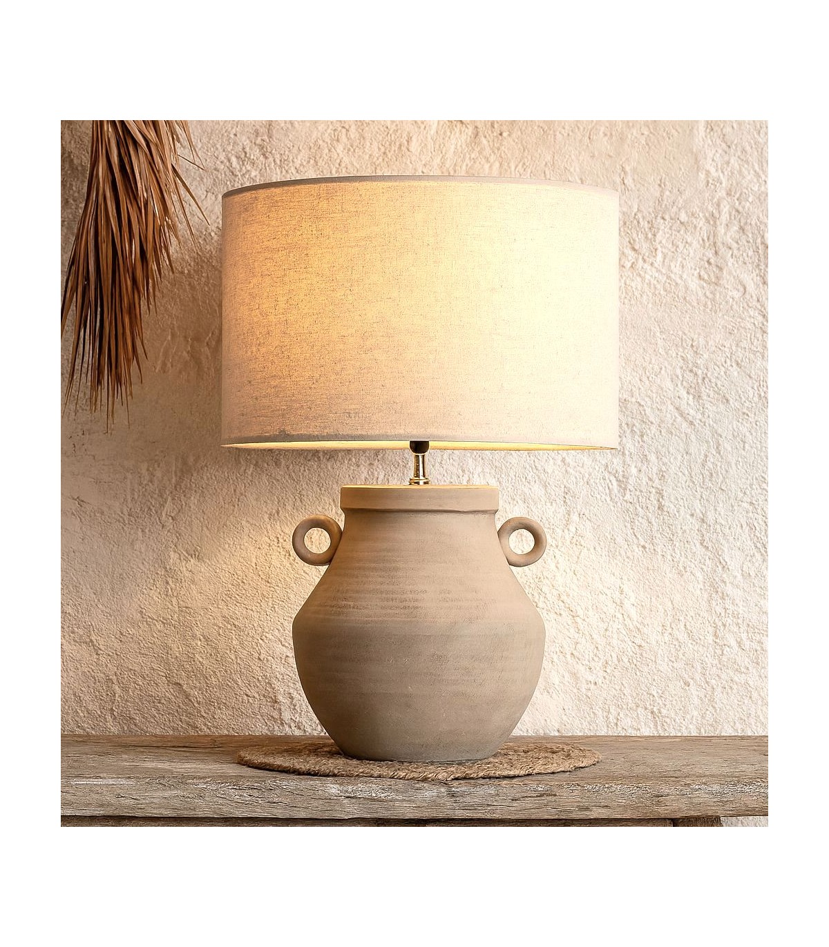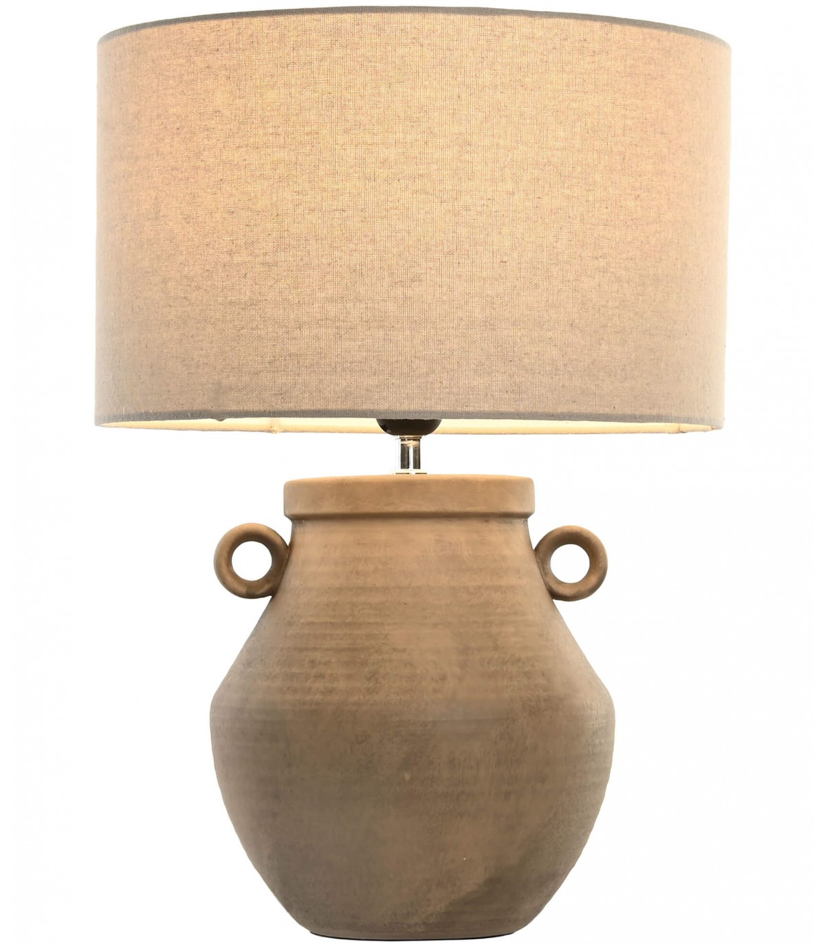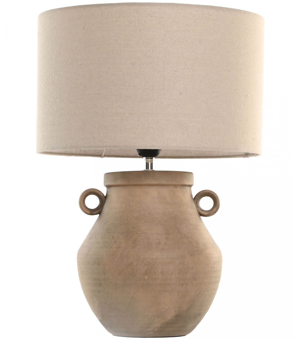 Inspirada en las formas de la cerámica tradicional, esta lámpara combina un cuerpo de gres marrón natural con asas decorativas que evocan antiguas ánforas. El acabado mate realza su carácter artesanal, mientras la pantalla cilíndrica de lino beige filtra la luz con calidez.