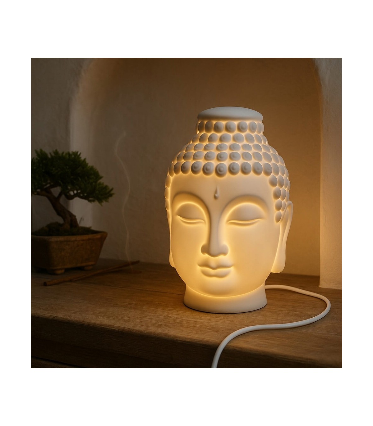 La silueta serena de esta lámpara de sobremesa evoca calma y crea una luz suave que transforma el ambiente con delicadeza. Su cuerpo de porcelana blanca dibuja un rostro estilizado que transmite equilibrio, aportando un acento zen a la decoración. El acabado liso y mate permite que la iluminación resalte cada curva, generando un efecto cálido y envolvente.