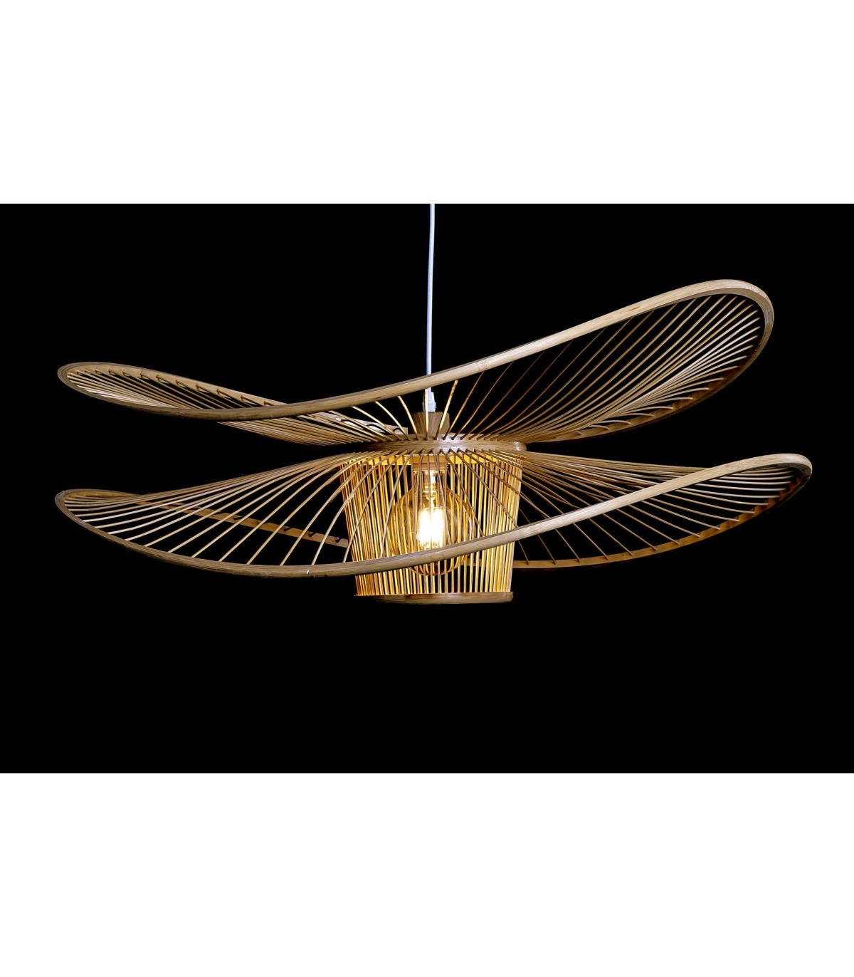 Lámpara de techo, se compone de un armazón de ratán, caracterizado por sus formas sencillas, de color natural y duradero. Ideal para estancias decoradas en en el nuevo estilo natural rústico, la disposición de sus varillas deja traspasar la luz creando un ambiente cálido y acogedor, también característicos de las zonas mediterráneas avocadas al descanso y la meditación, utilizándose también este estilo para relajar zonas de trabajo y hogares.