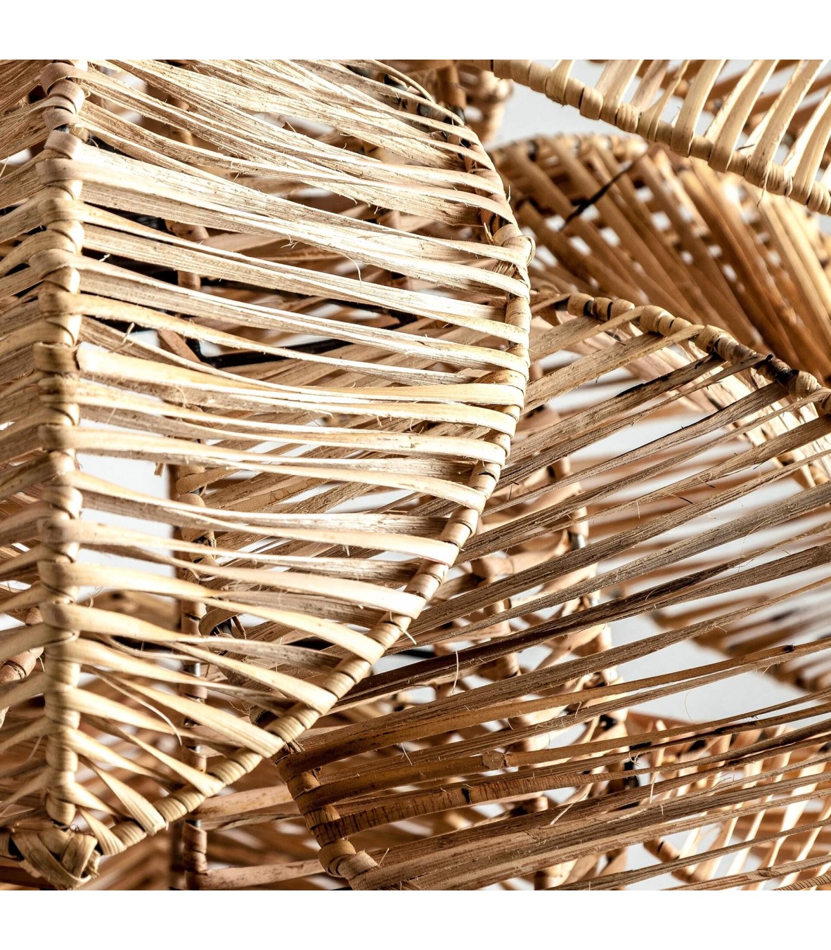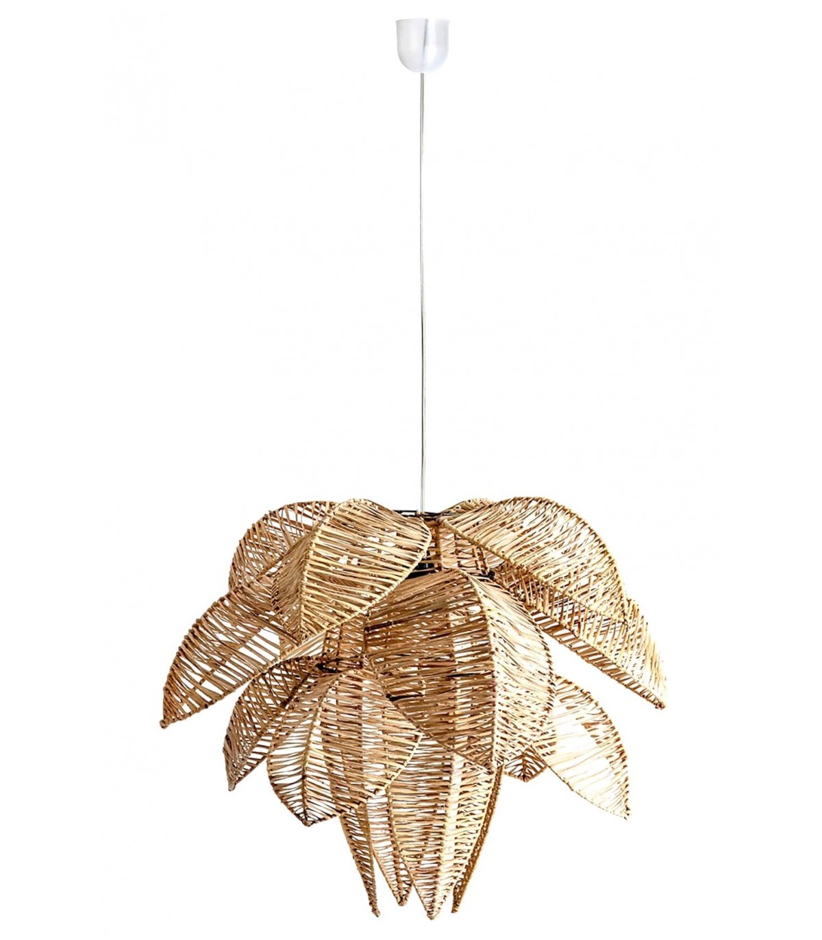 La lámpara de techo de ratán trenzado a mano envuelve el ambiente con una luz suave que filtra calidez y textura en el espacio. Su trenzado natural dibuja formas orgánicas que aportan movimiento y una sensación de calma serena, perfecta para interiores acogedores y vitales.