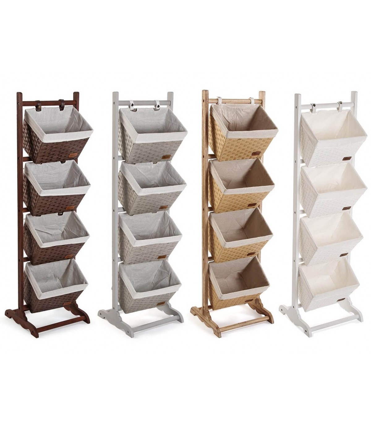 • Mueble organizativo ideal para el cuarto de baño, existe en dos formatos con 3 o 4 cestas y varios acabados para que puedas escoger la combinación que mejor encaje en tu decoración.