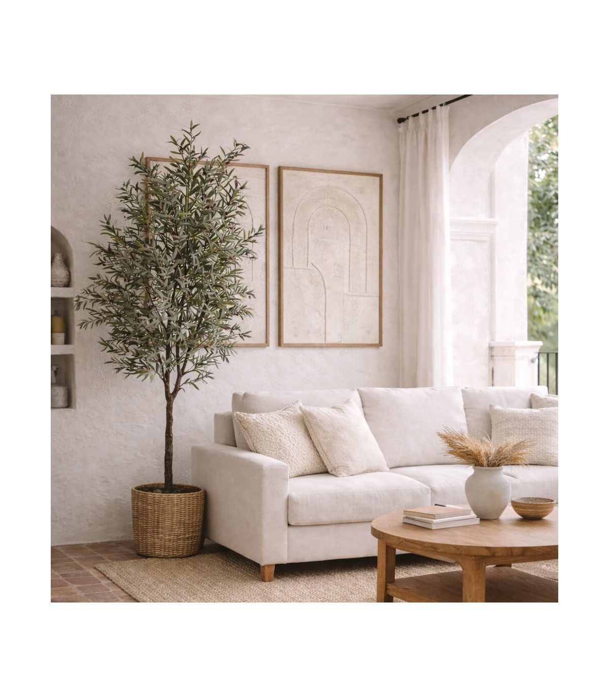 Inspirado en la frescura natural del paisaje mediterráneo, este árbol artificial aporta equilibrio y serenidad al espacio. Su follaje de poliéster transmite una sensación realista y envolvente en tonos verdes suaves. El tronco y las hojas crean un conjunto armónico y decorativo sin necesidad de mantenimiento.