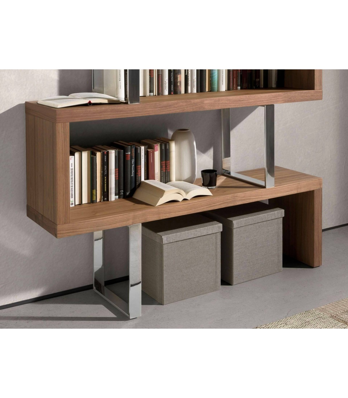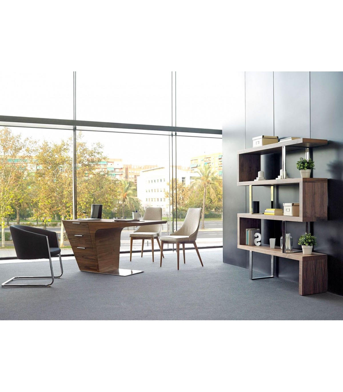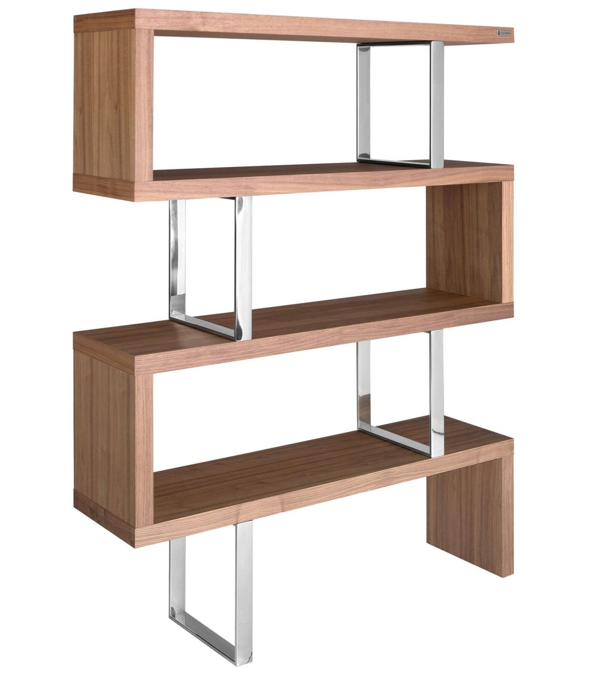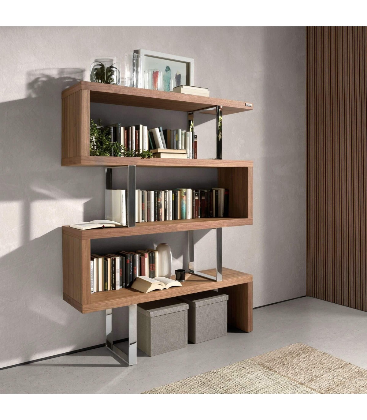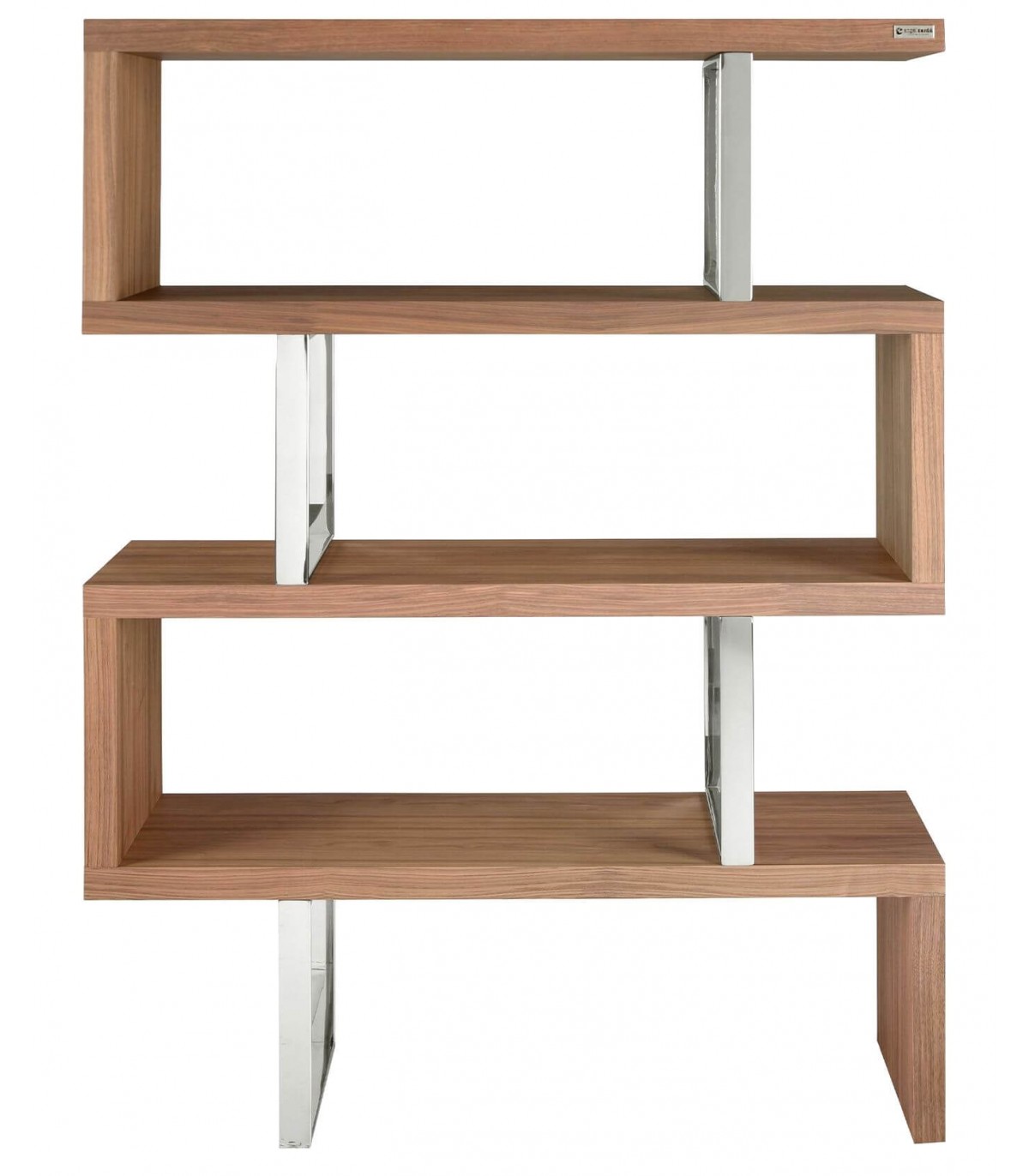 Esta impresionante estantería combina la calidez de la madera chapada en nogal natural con la elegancia del acero cromado, creando un diseño arquitectónico moderno y vanguardista. Su estructura asimétrica proporciona dinamismo y versatilidad, permitiendo exhibir libros, objetos decorativos o elementos personales con estilo.