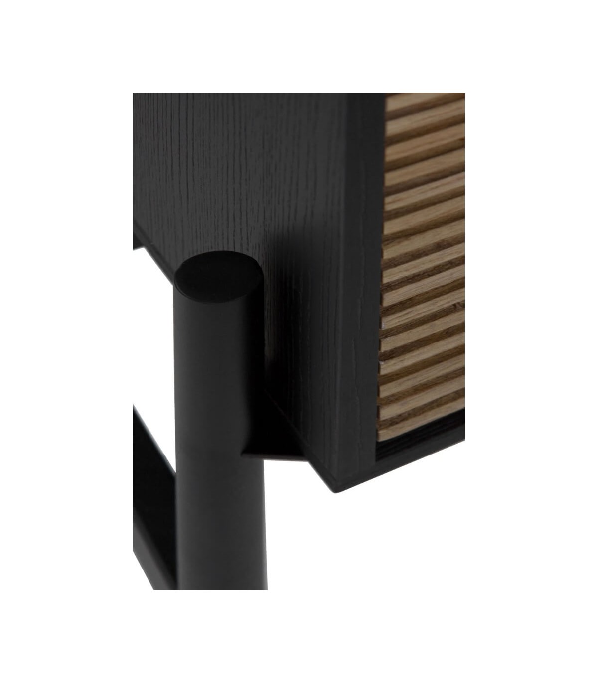 Acabado, madera mdf acabado natural fresno, base y estructura en metal color negro.