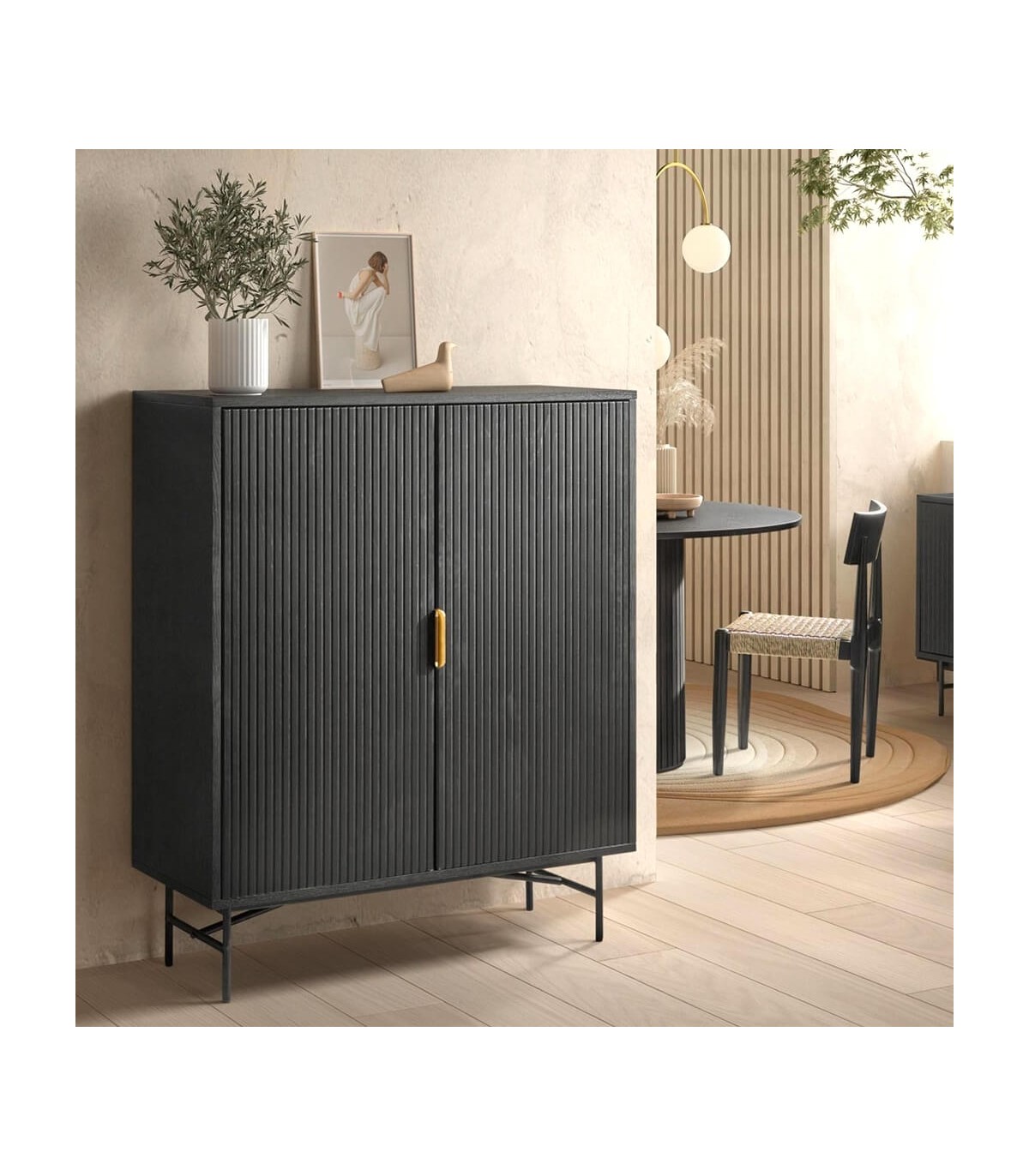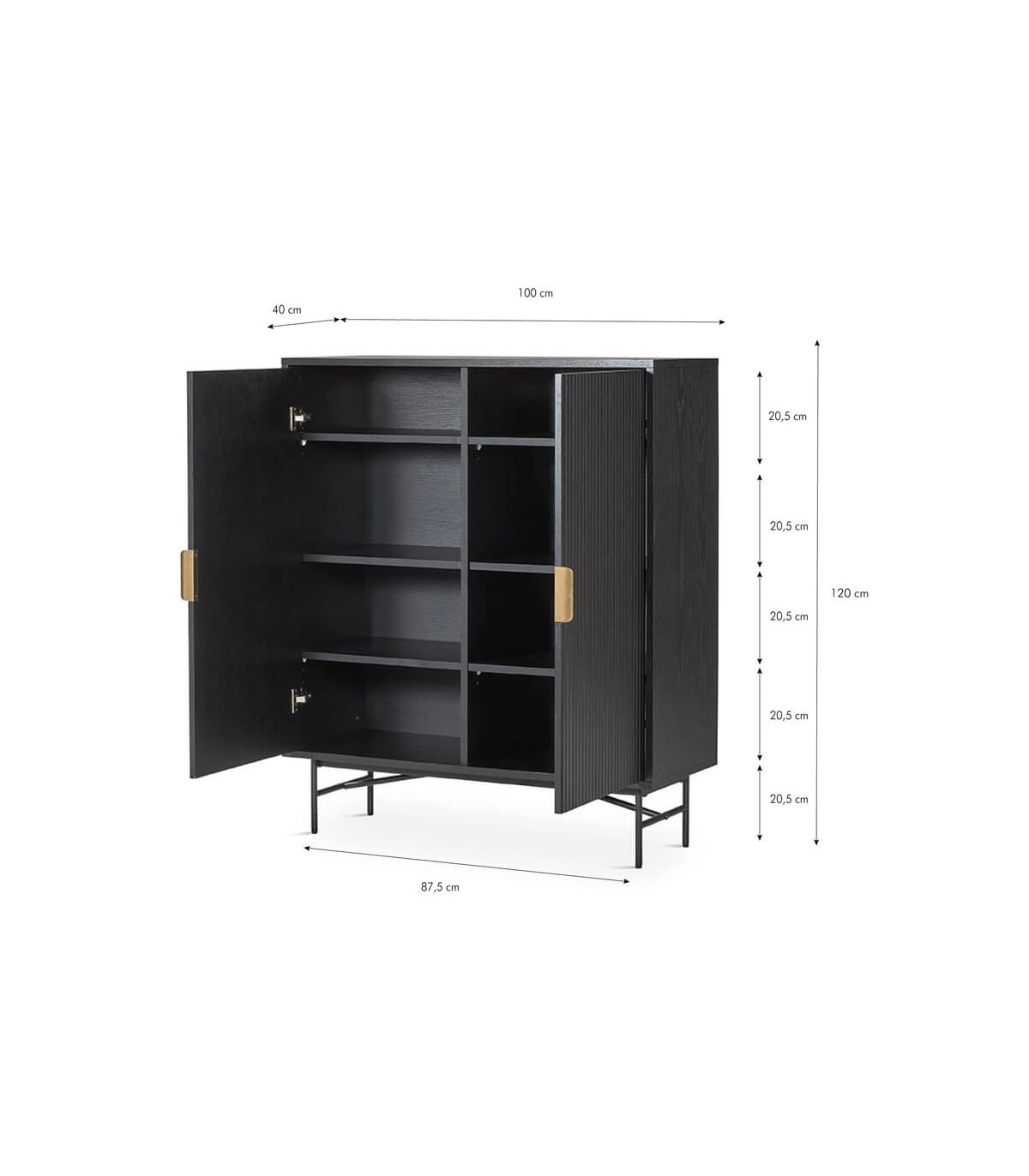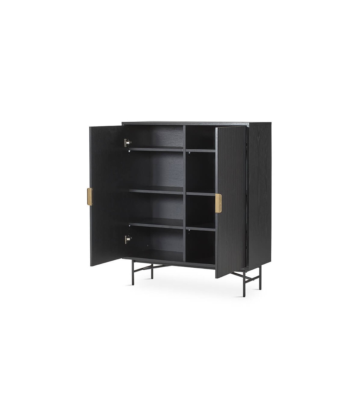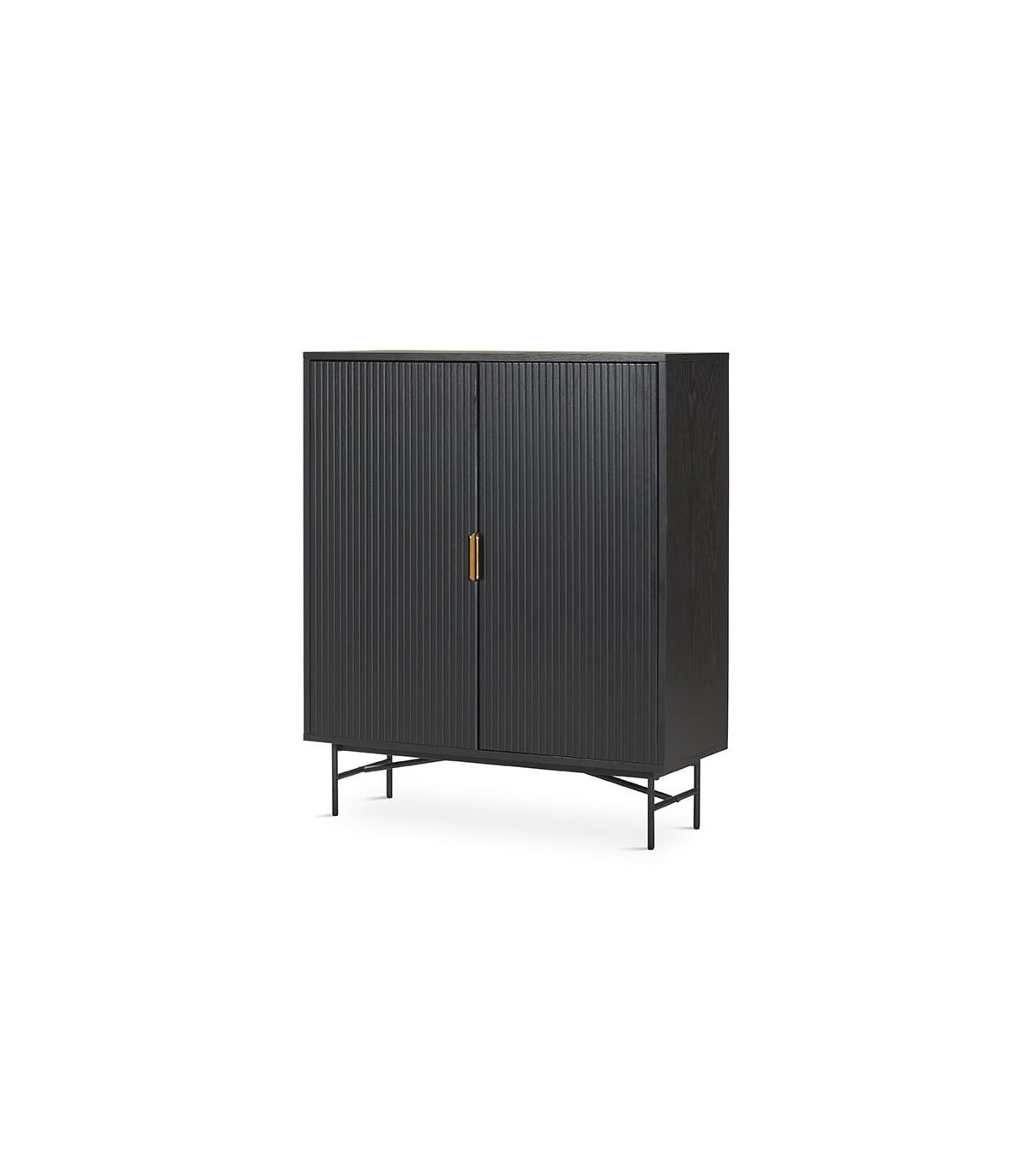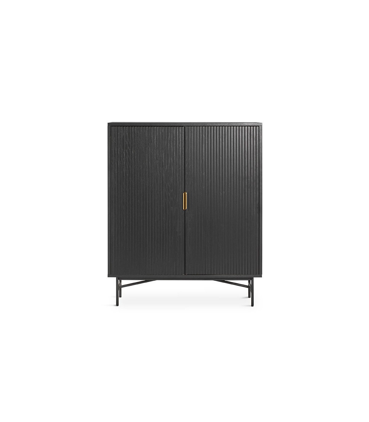 Armario alacena realizado en madera de roble teñido en color negro con las patas en metal negro y un bonito tirador acabado oro. Un buen mueble de capacidad que encajará perfectamente en tu decoración como armario o mueble bar.