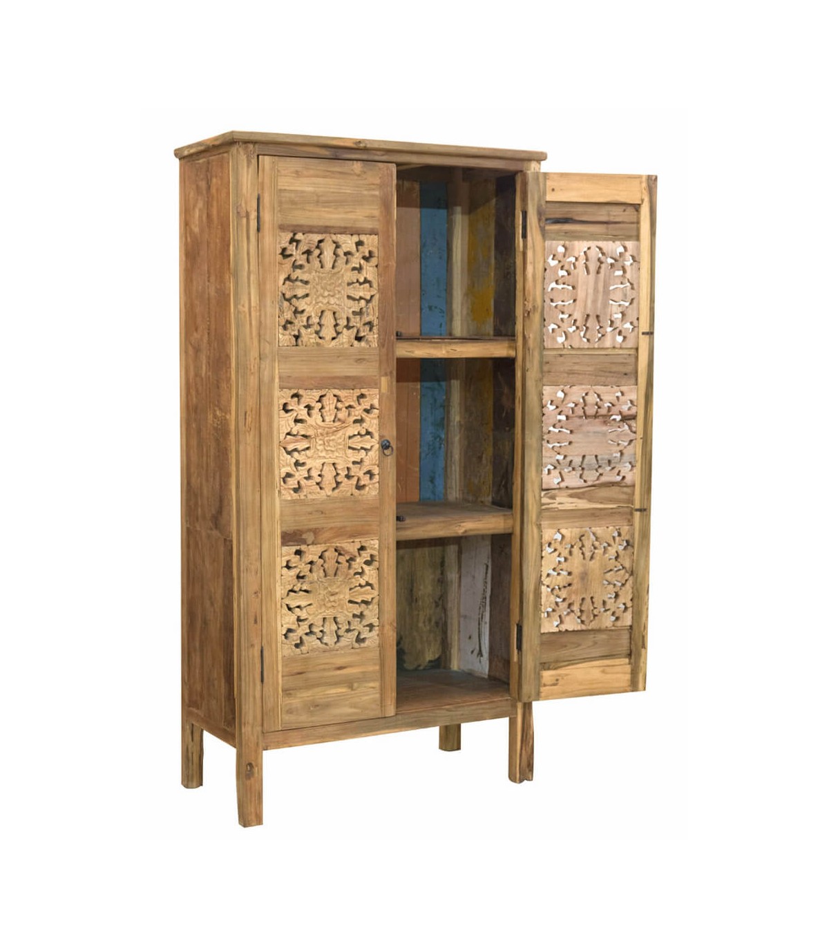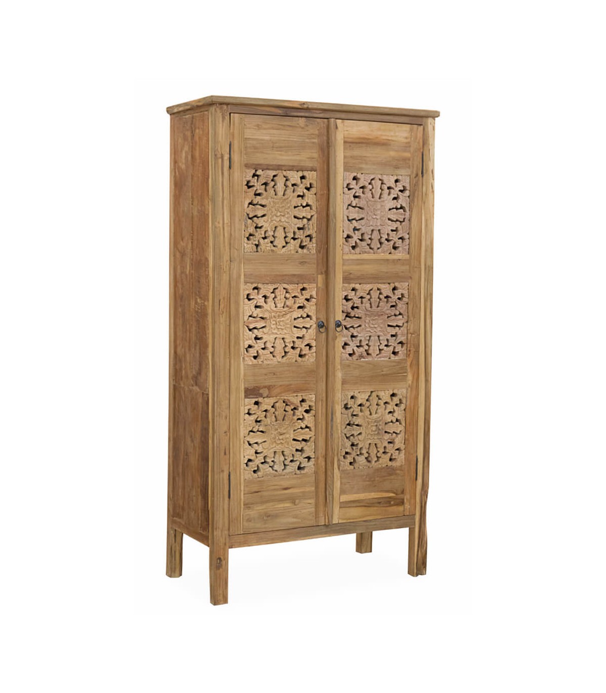 Déjate cautivar por el encanto exótico de este armario alacena de dos puertas, elaborado en auténtica madera maciza de teca reciclada. Cada panel ha sido tallado a mano con un intrincado motivo floral, aportando carácter y singularidad a esta pieza única. Su acabado en madera natural resalta la riqueza de las vetas y texturas, mientras que los tiradores metálicos en tono envejecido completan su esencia artesanal.