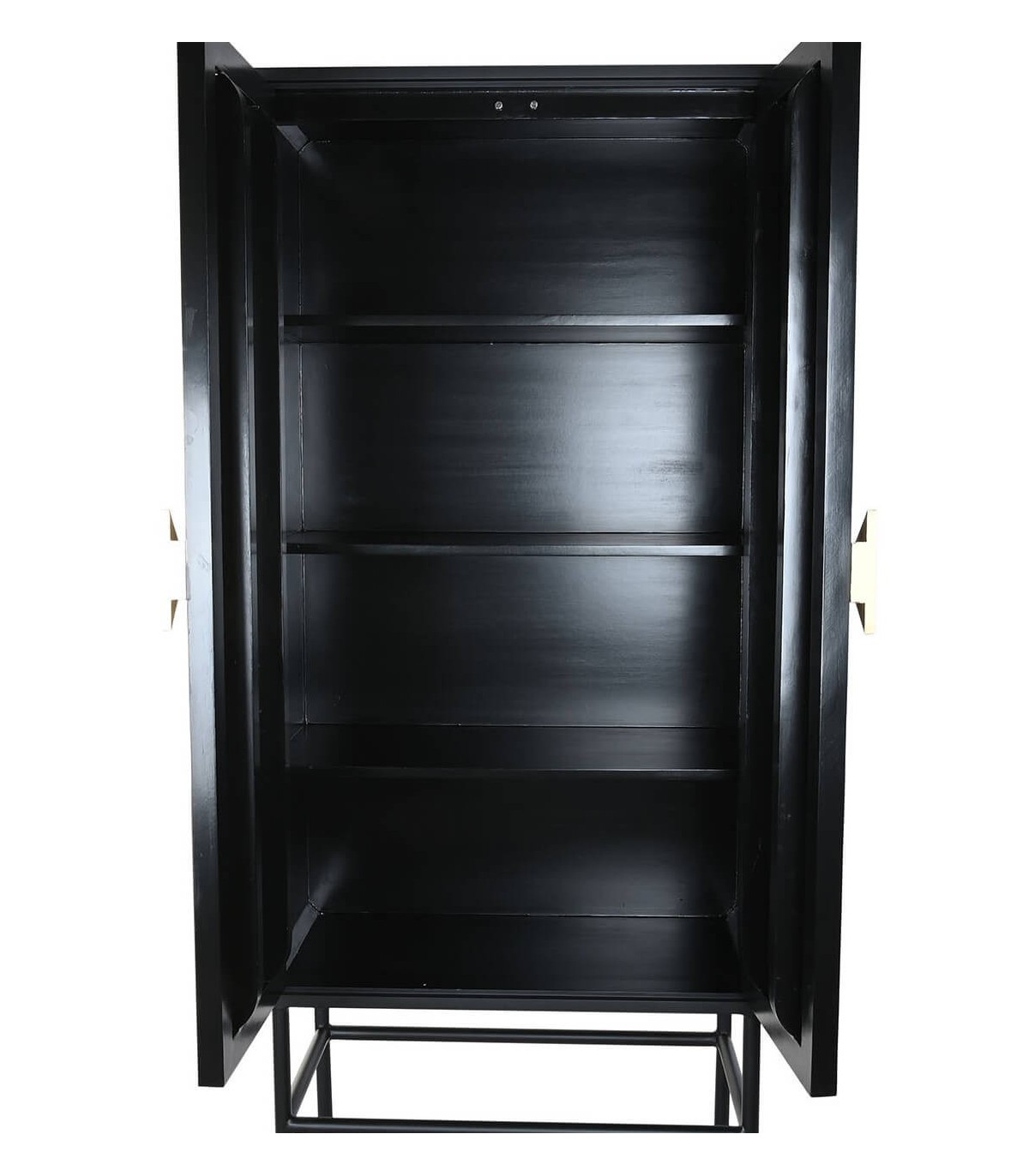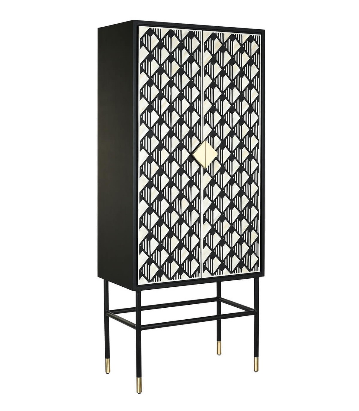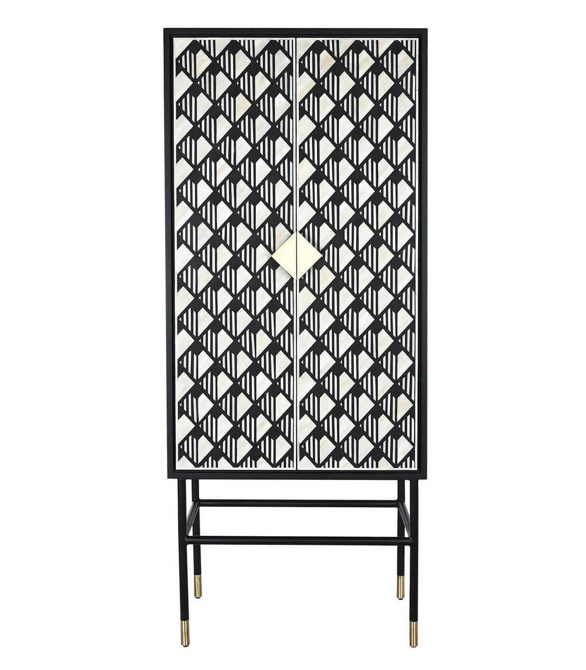 Armario alacena de nuestra colección de muebles Huerso, una colección realizada en madera mdf lacada en negro con el detalle artesanal de la tarace en hueso natural y el detalle del tirador y el remate de las patas en oro, a caballo entre el estilo étnico y el toque art decó que nos dan los detalles en oro, una colección muy versátil y decorativa.