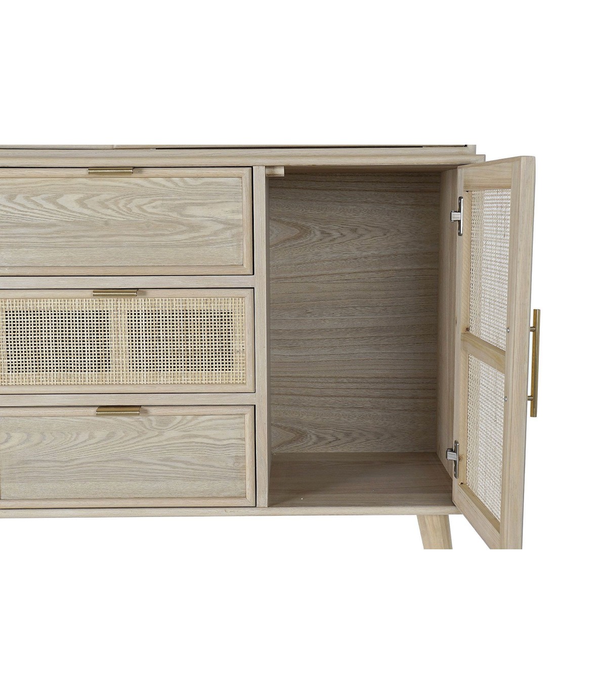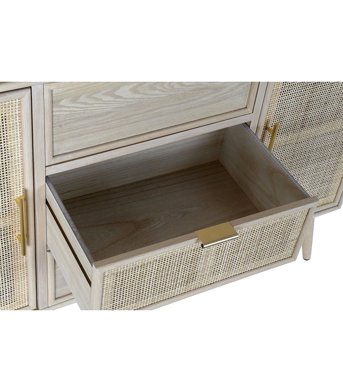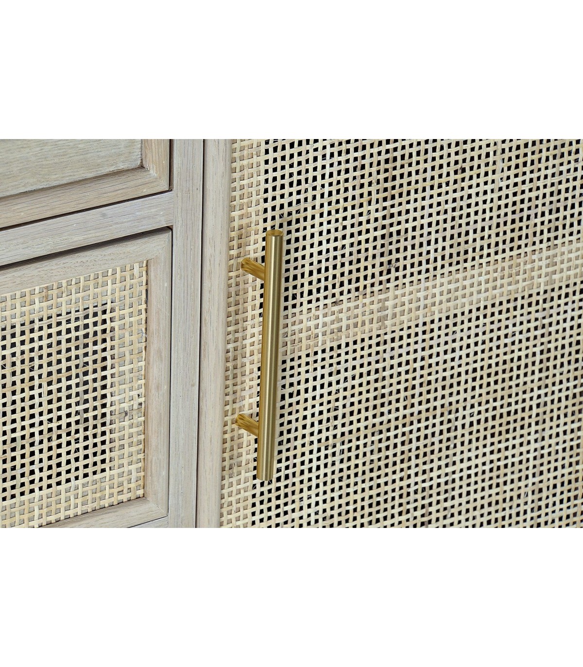 Acabado, madera acabado natural, ratán natural, tiradores color oro.