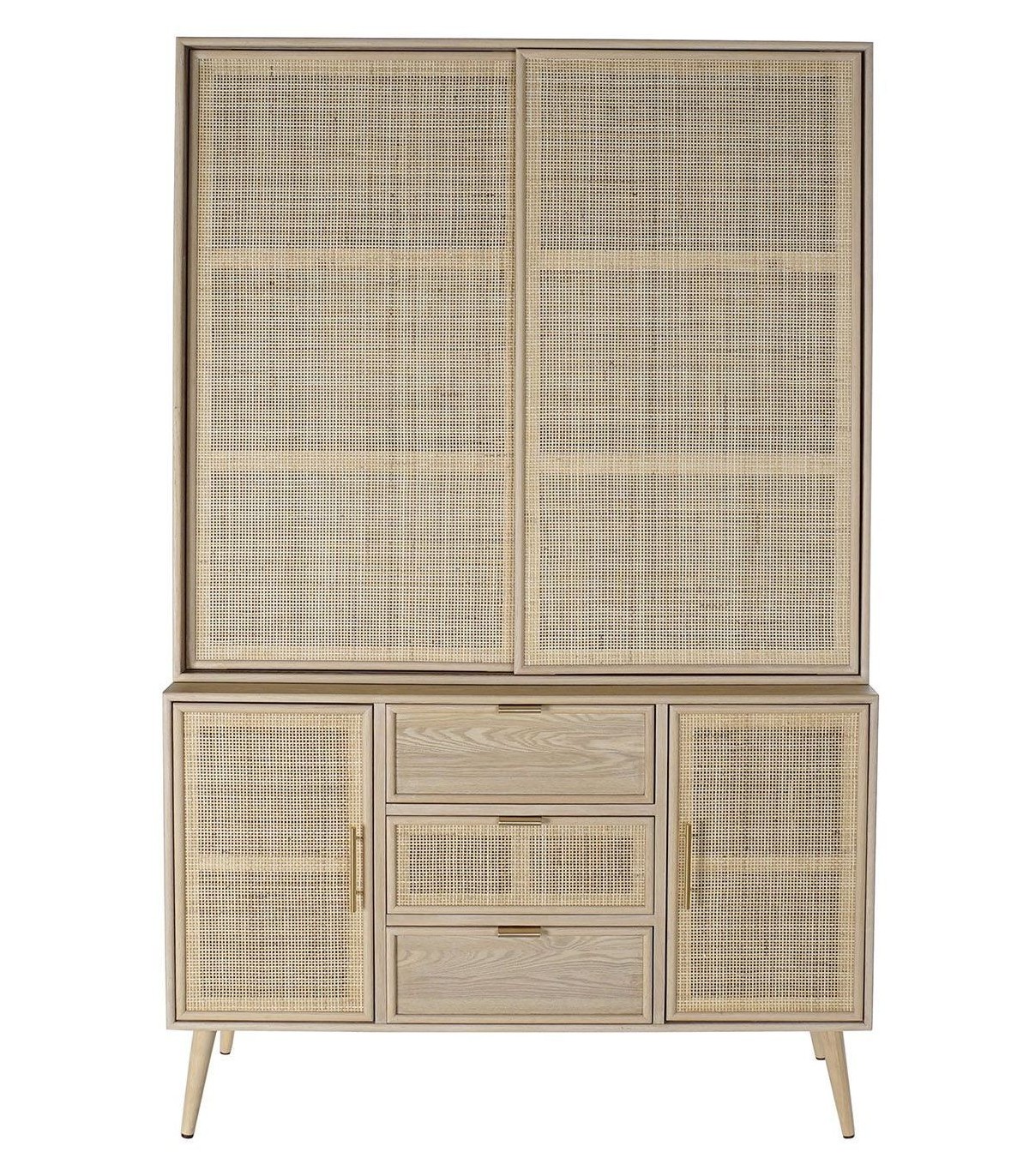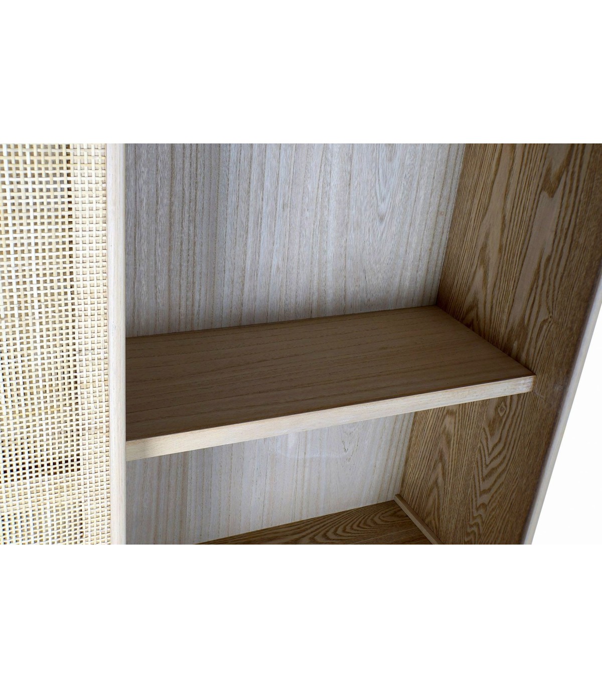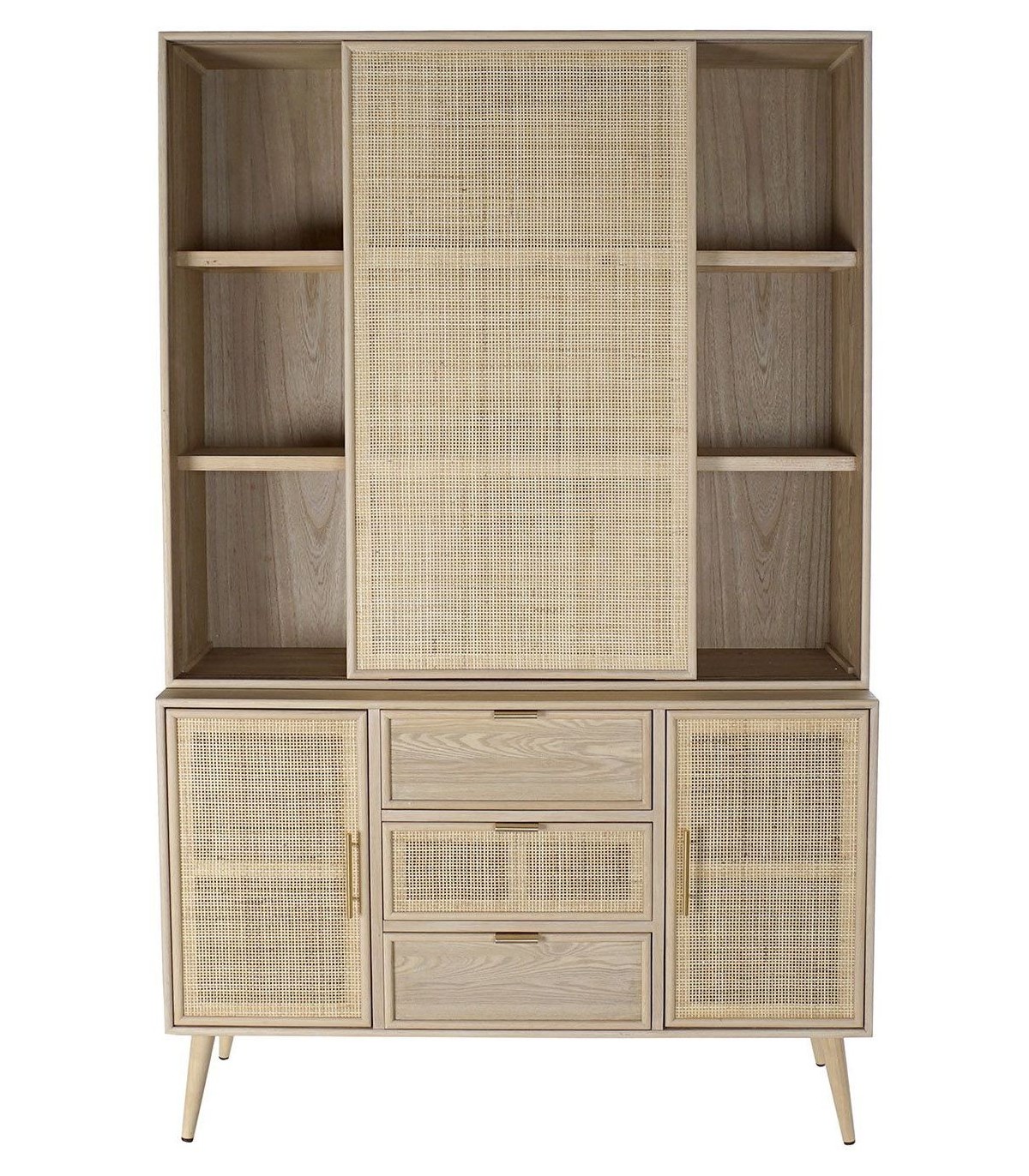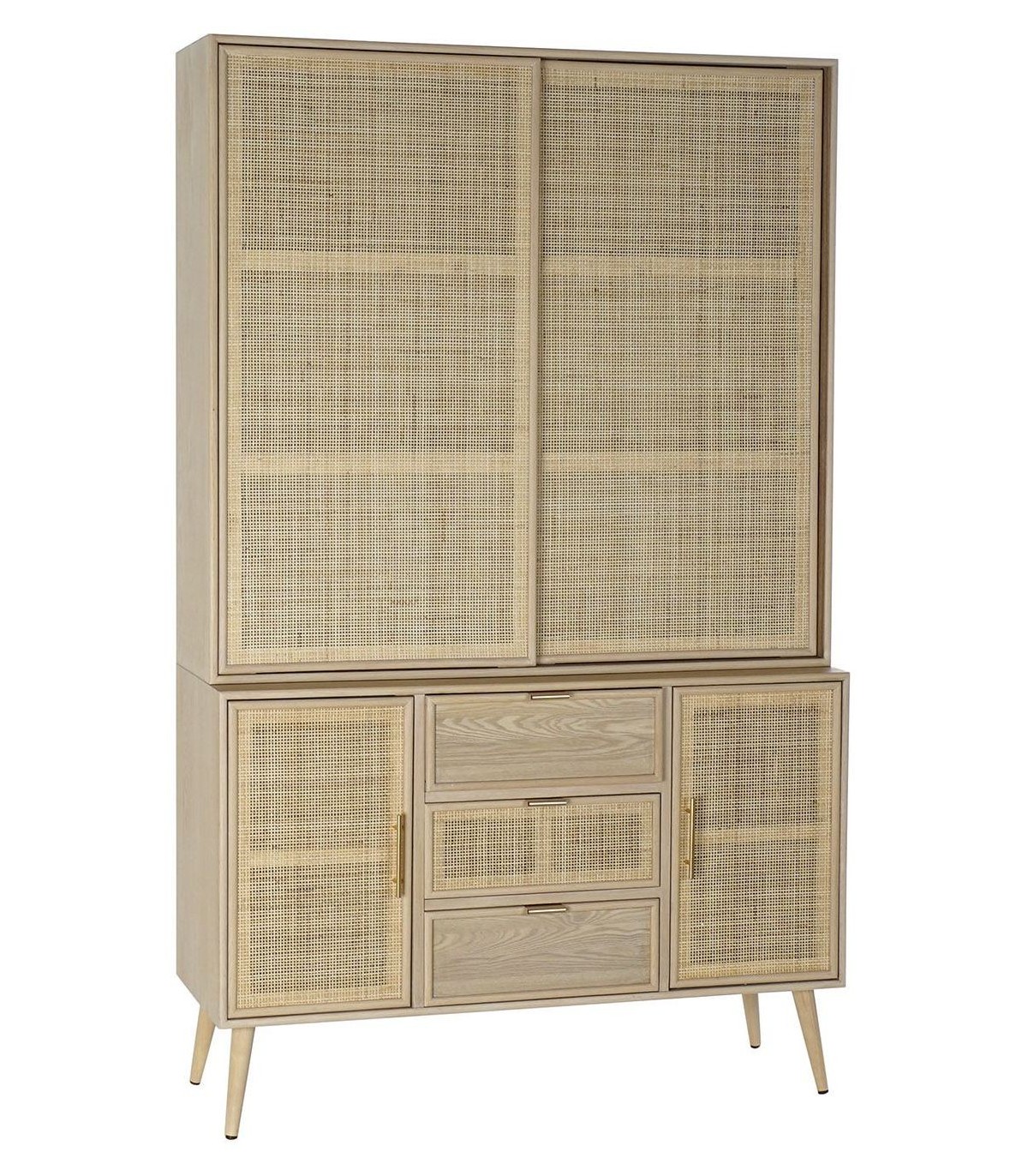 Acabado, madera acabado natural, ratán natural, tiradores color oro.