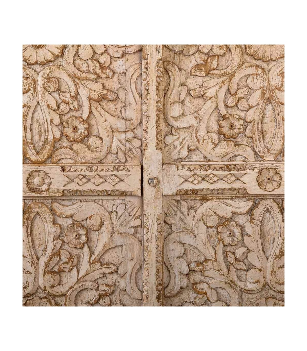 Armario alacena de presencia majestuosa y alma artesanal que aporta elegancia y calidez al espacio. Fabricado en madera maciza de mango, muestra un trabajo de talla a mano con relieves florales que dotan de textura y profundidad.