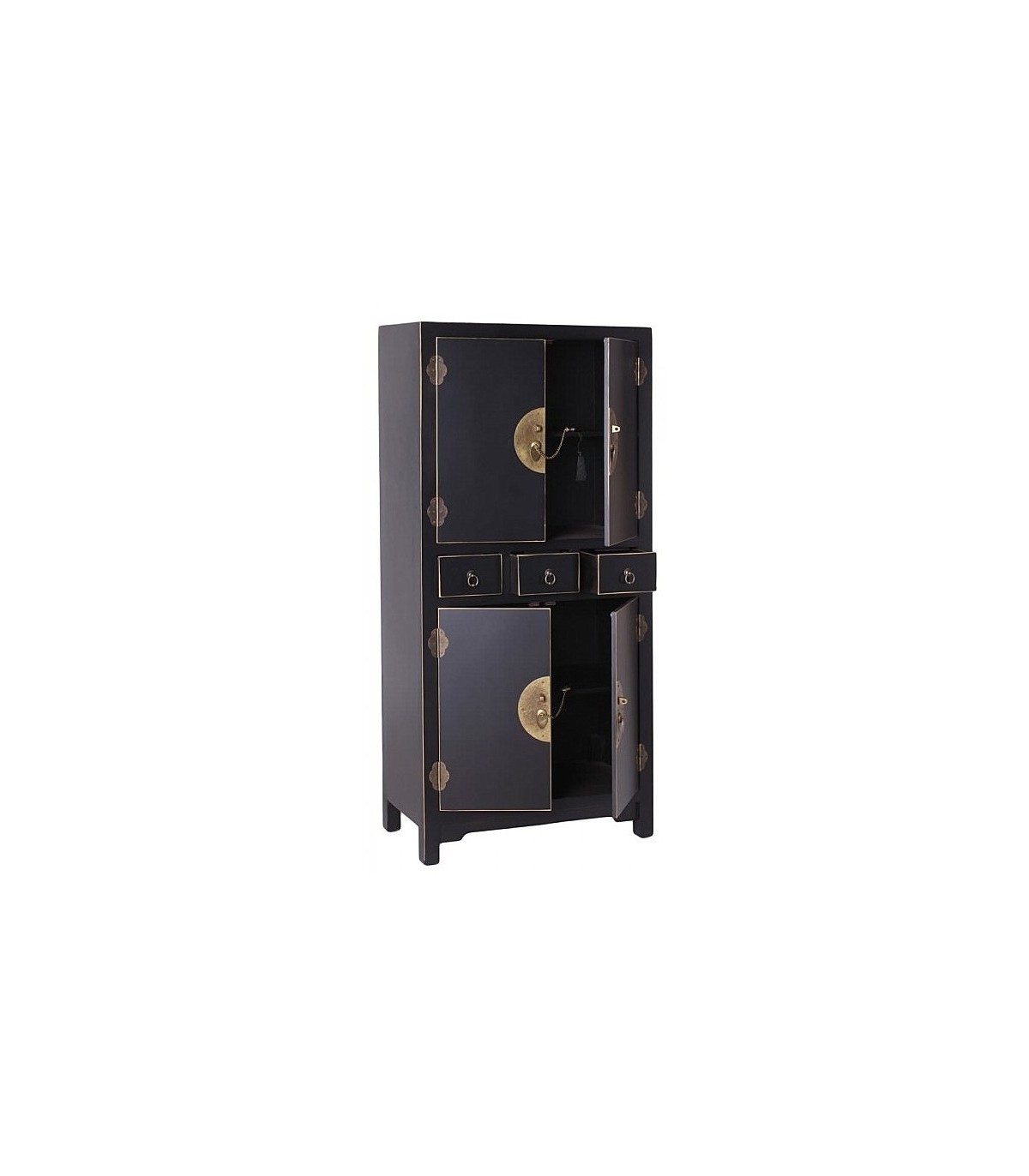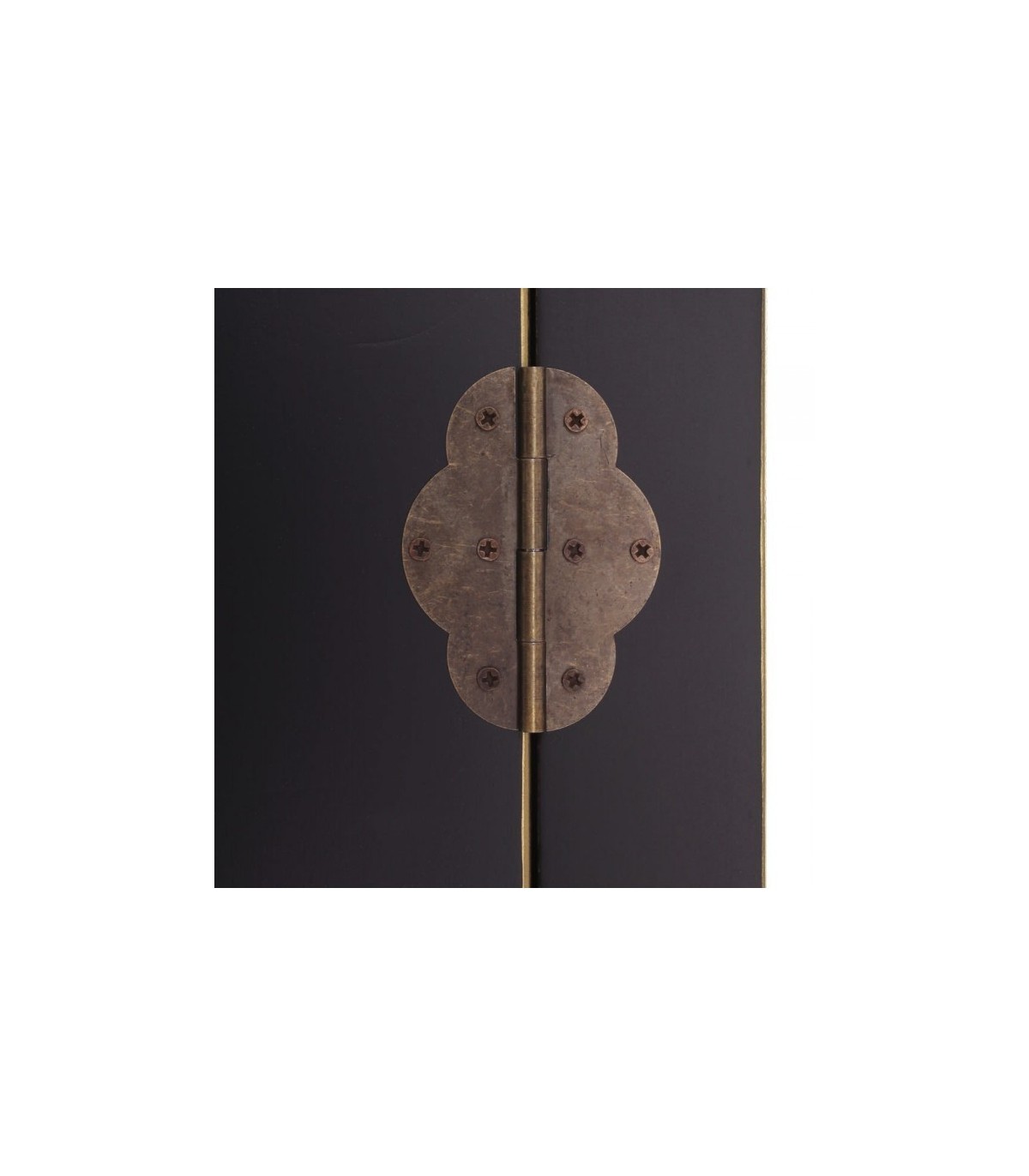 Fabricado en madera MDF y acabado en negro profundo con finos filetes dorados, destaca por sus herrajes en latón pavonado que evocan los antiguos muebles asiáticos. Una opción decorativa perfecta para recibidores, salones o dormitorios con inspiración oriental.