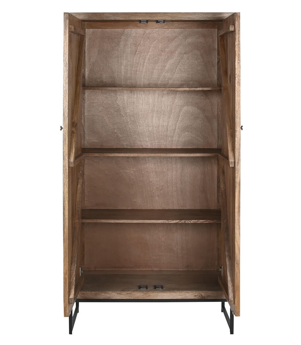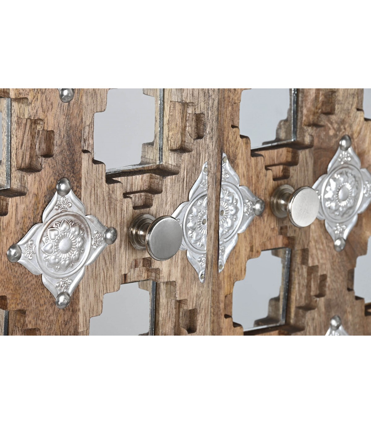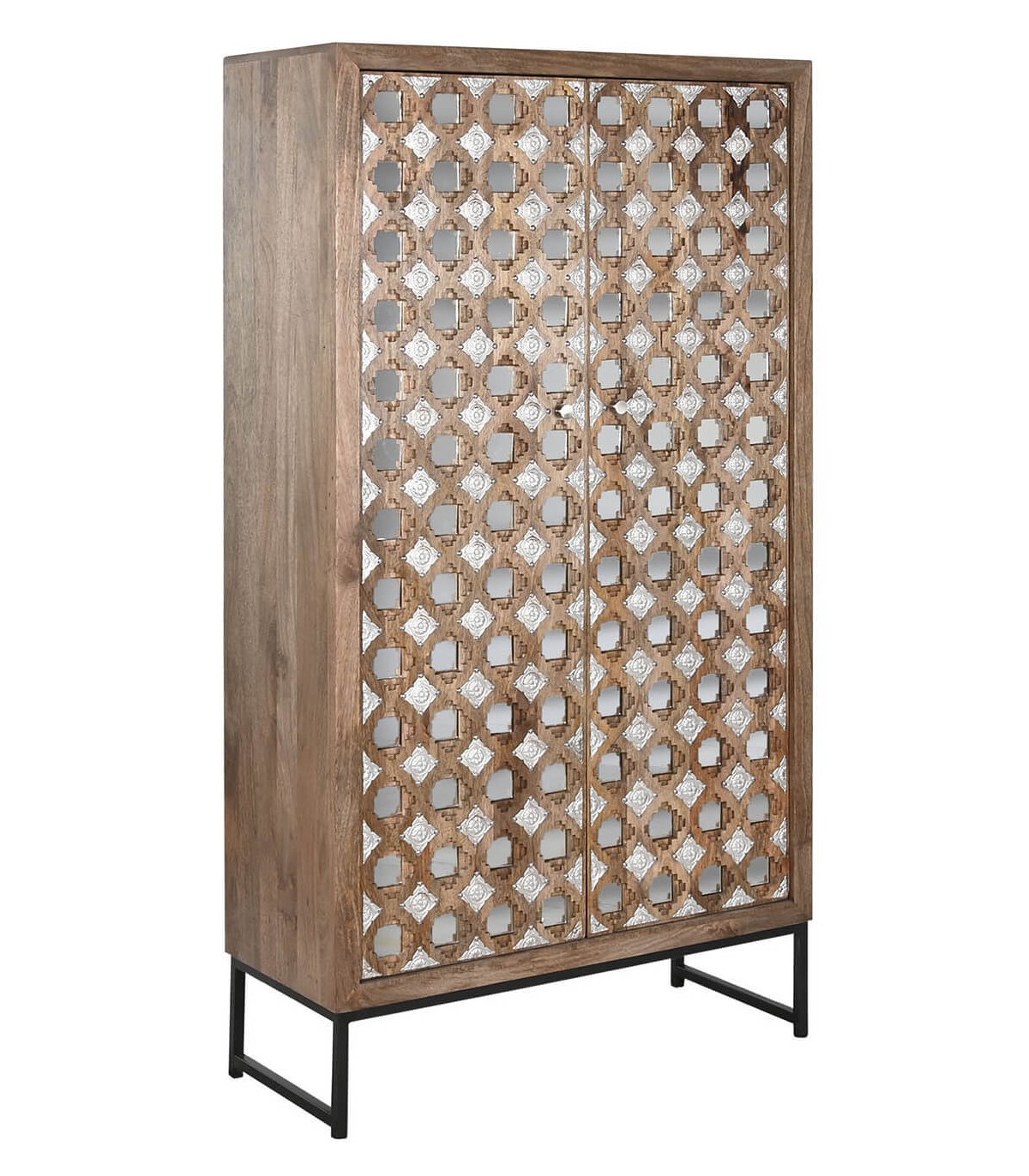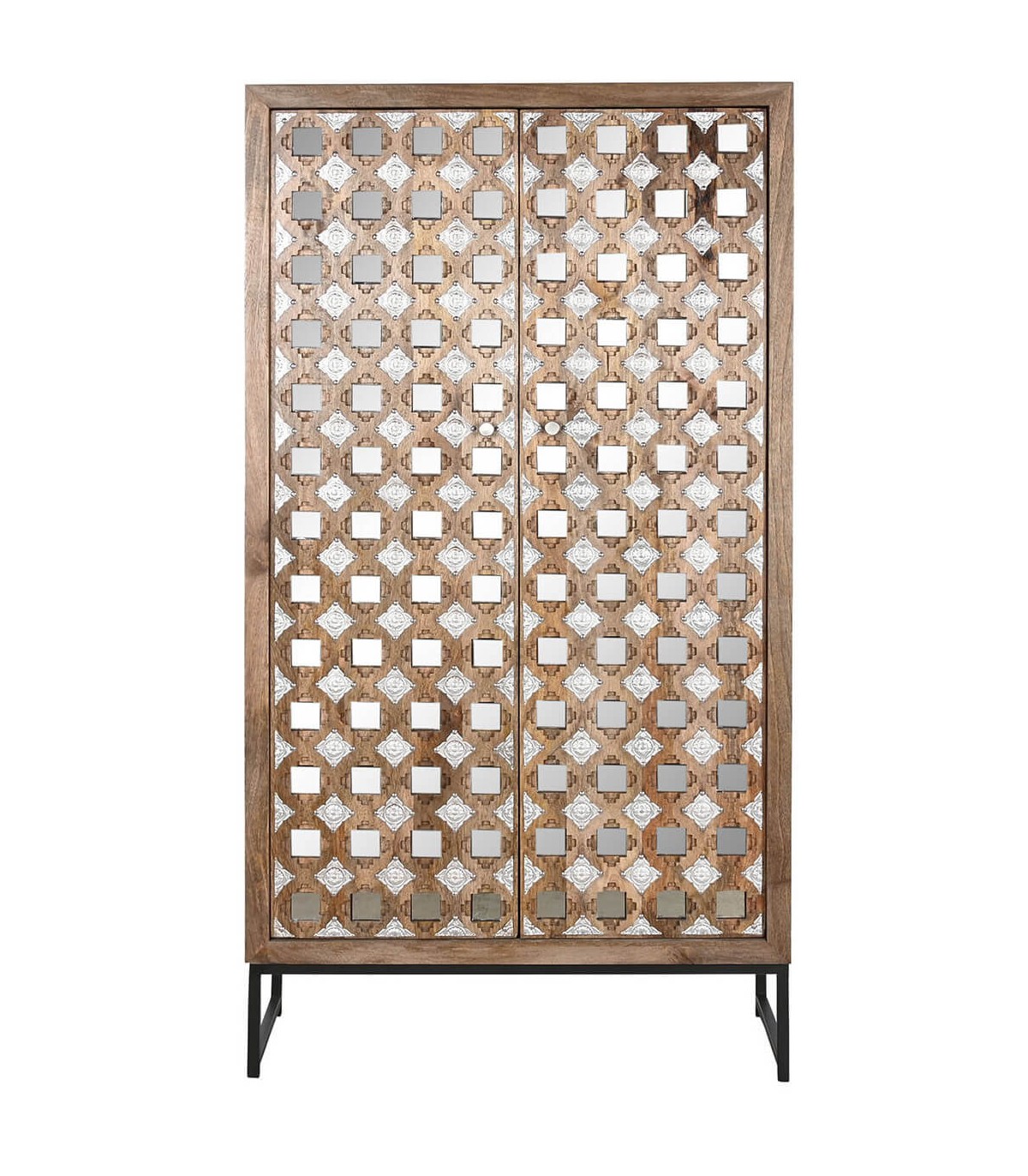 Armario alacena de estilo étnico realizado en madera de mango natural con aplicaciones en espejo y metal cromado, patas en metal negro, adaptable a cualquier tipo de decoración como pieza singular.