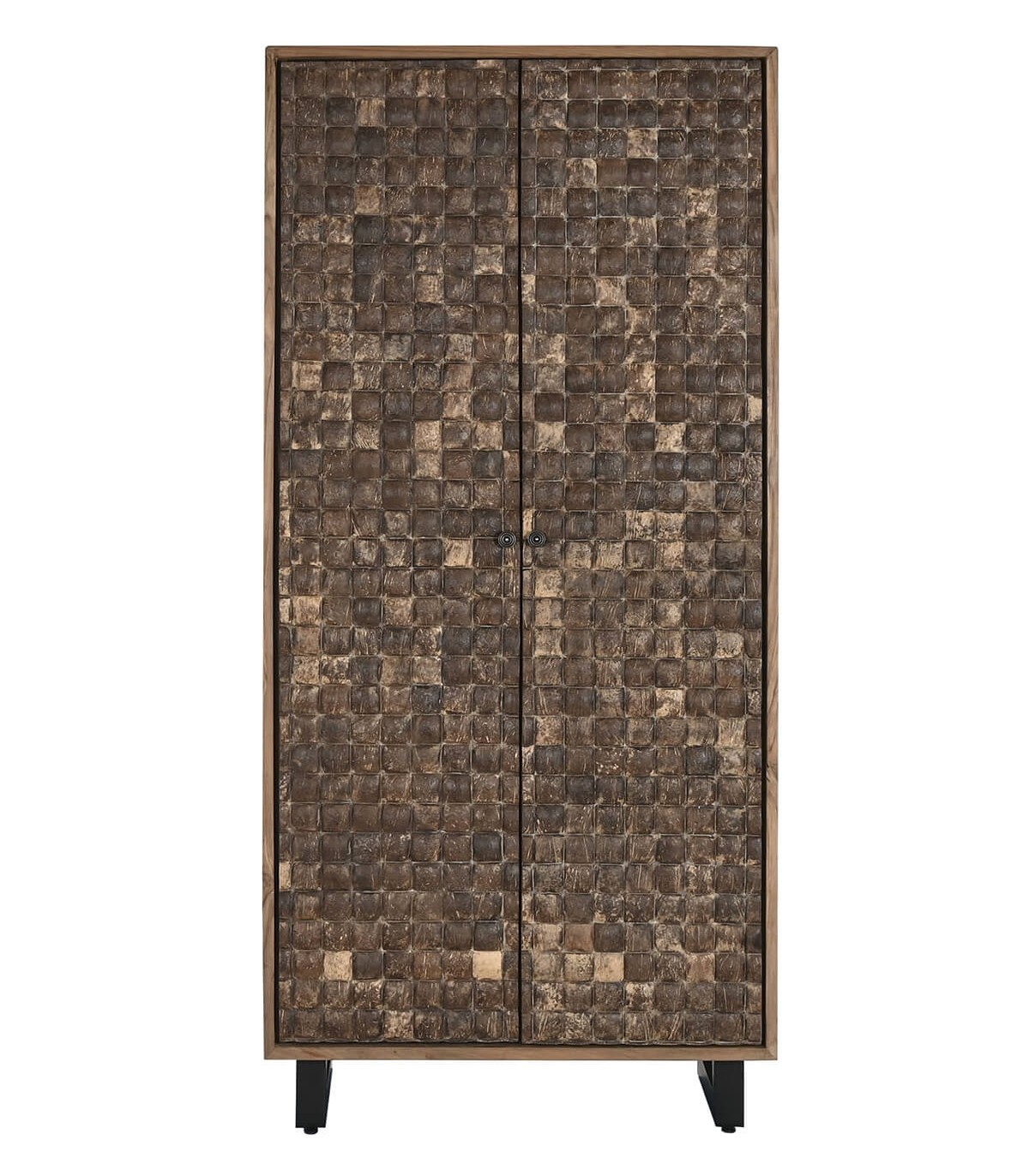 Armario alacena con 2 puertas realizado en madera de teca reciclada, con el frente de las puertas en coco, patas en metal negro, adaptable a cualquier tipo de decoración como pieza singular.