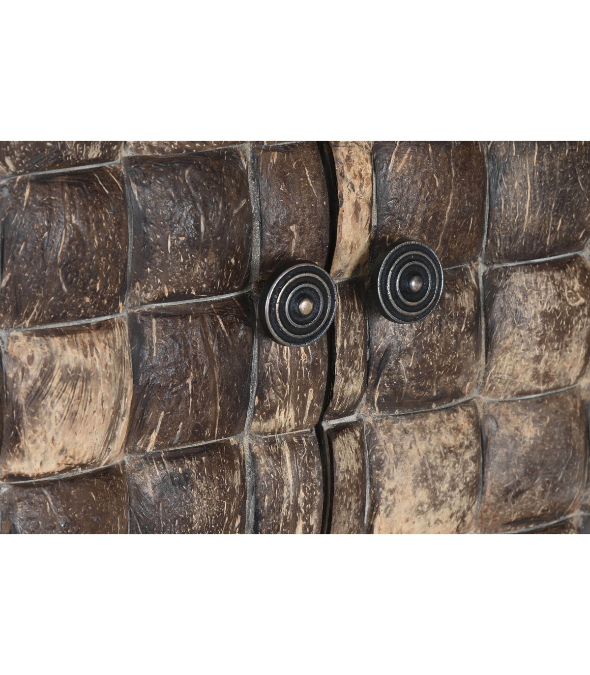 Acabado, madera natural , frente de puertas coco, metal negro. Fabricación artesanal. entendemos las variaciones de tonalidad, tamaño y forma o ciertas imperfecciones (grietas, nudos, marcas) como un valor añadido que la convierten en pieza única.