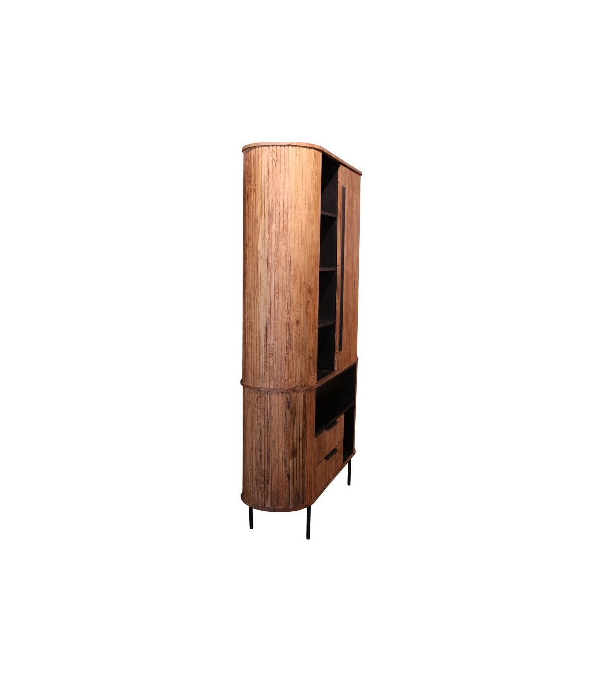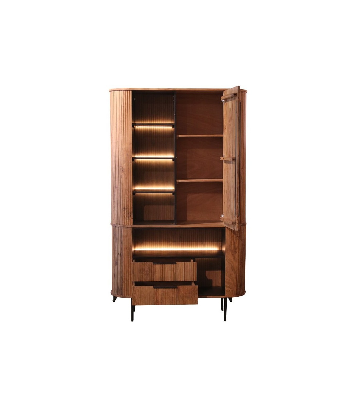 Diseño versátil que une vitrina, armario y estantería en un solo mueble, combinando líneas redondeadas con detalles de inspiración boho para destacar en cualquier rincón. La madera de acacia en tono nogal aporta calidez, mientras que la luz LED integrada crea un ambiente acogedor y sofisticado.