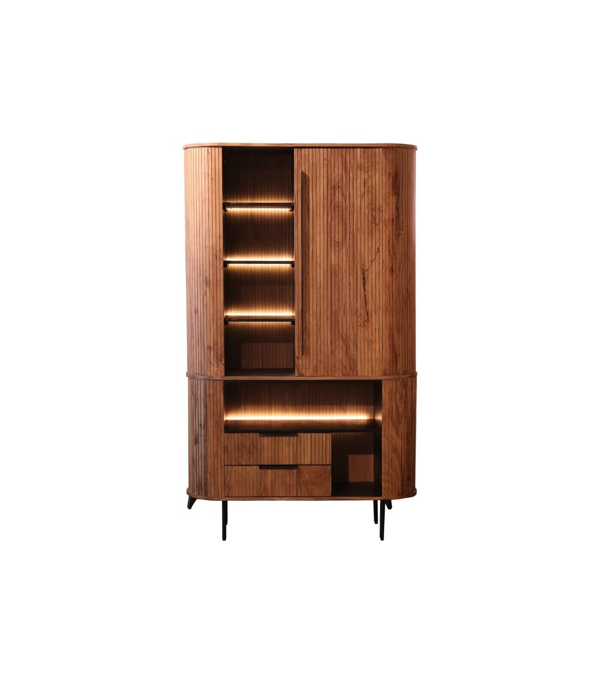 Sus estantes abiertos iluminados permiten exhibir objetos decorativos, mientras que la puerta y los cajones guardan todo en orden. Estructura sólida reforzada con patas de metal negro que contrastan y aportan un toque moderno. Ideal para salón, comedor o despacho, llenando el espacio de personalidad, calidez y funcionalidad.
