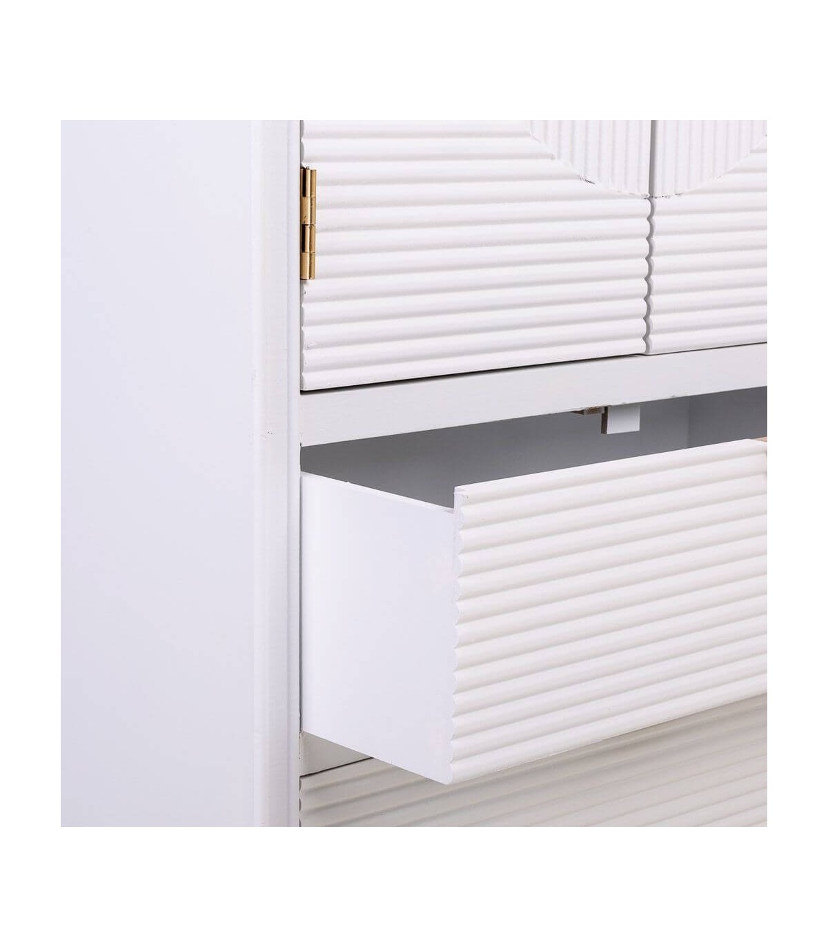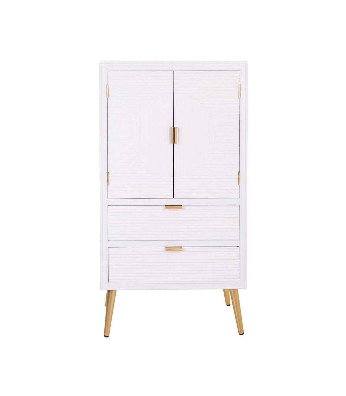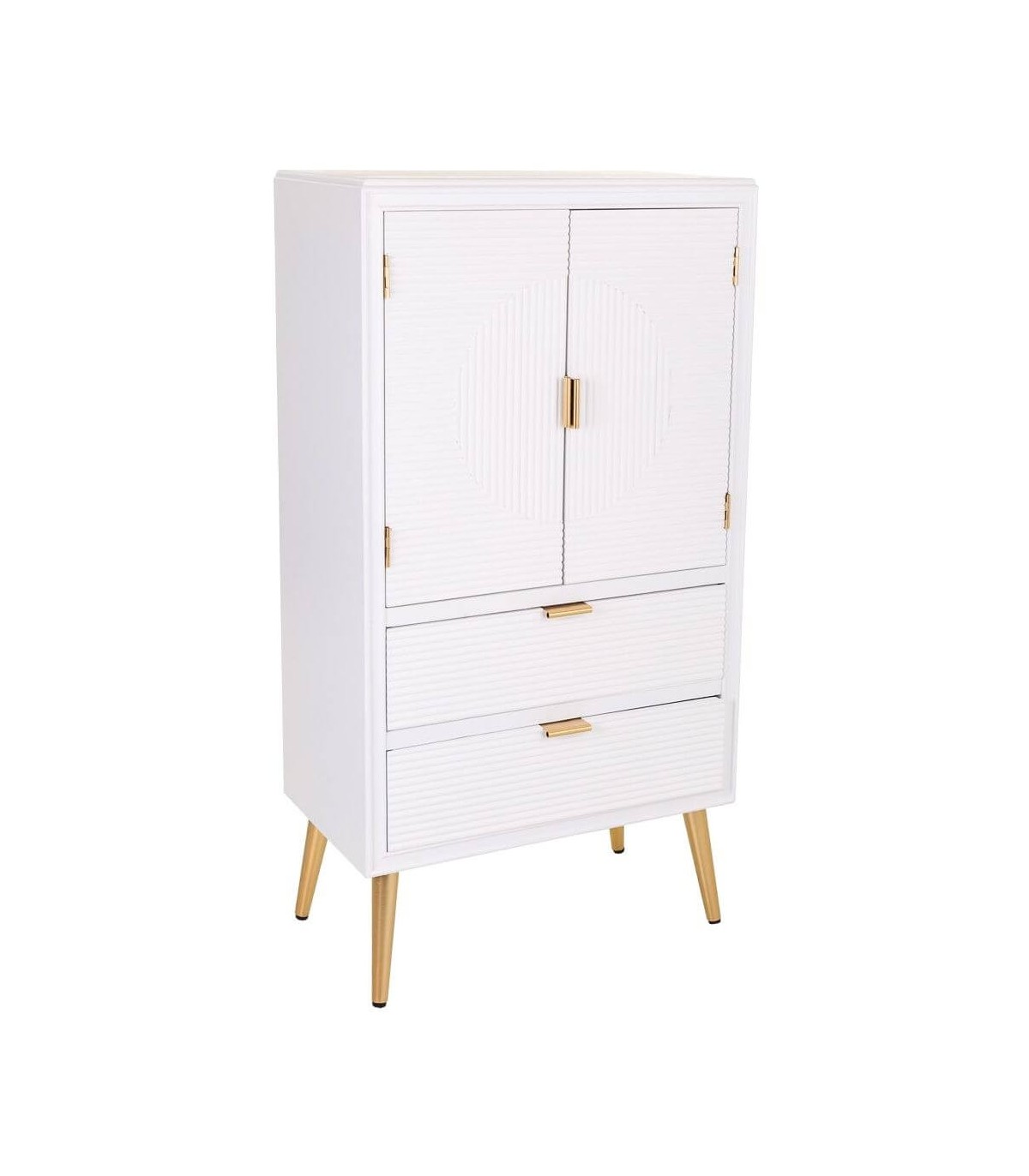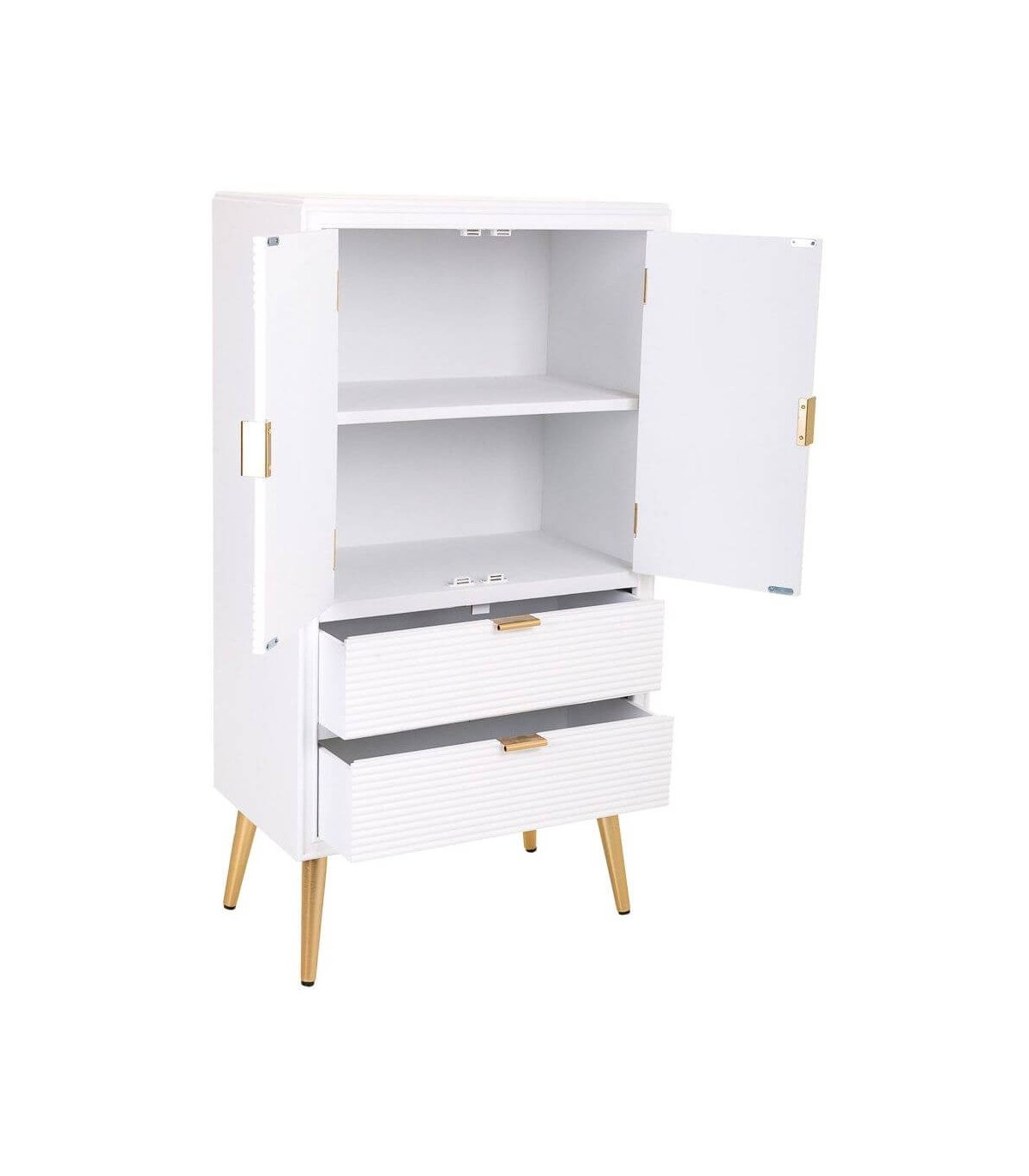 Acabado, lacado en blanco, tiradores y patas en metal oro.