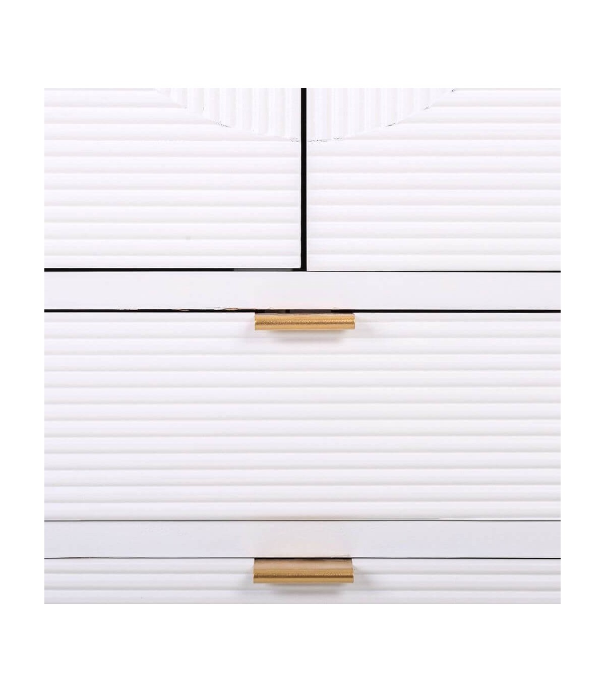 Armario de nuestra colección Neo, una colección que se caracteriza por su estilo art decó, realizada en madera lacada en negro o blanco, de líneas rectas con el contraste de los dibujos geométricos en sus frentes y el contraste con el oro, una colección muy elegante con muebles y complementos patra cualquier lugar de tu casa.