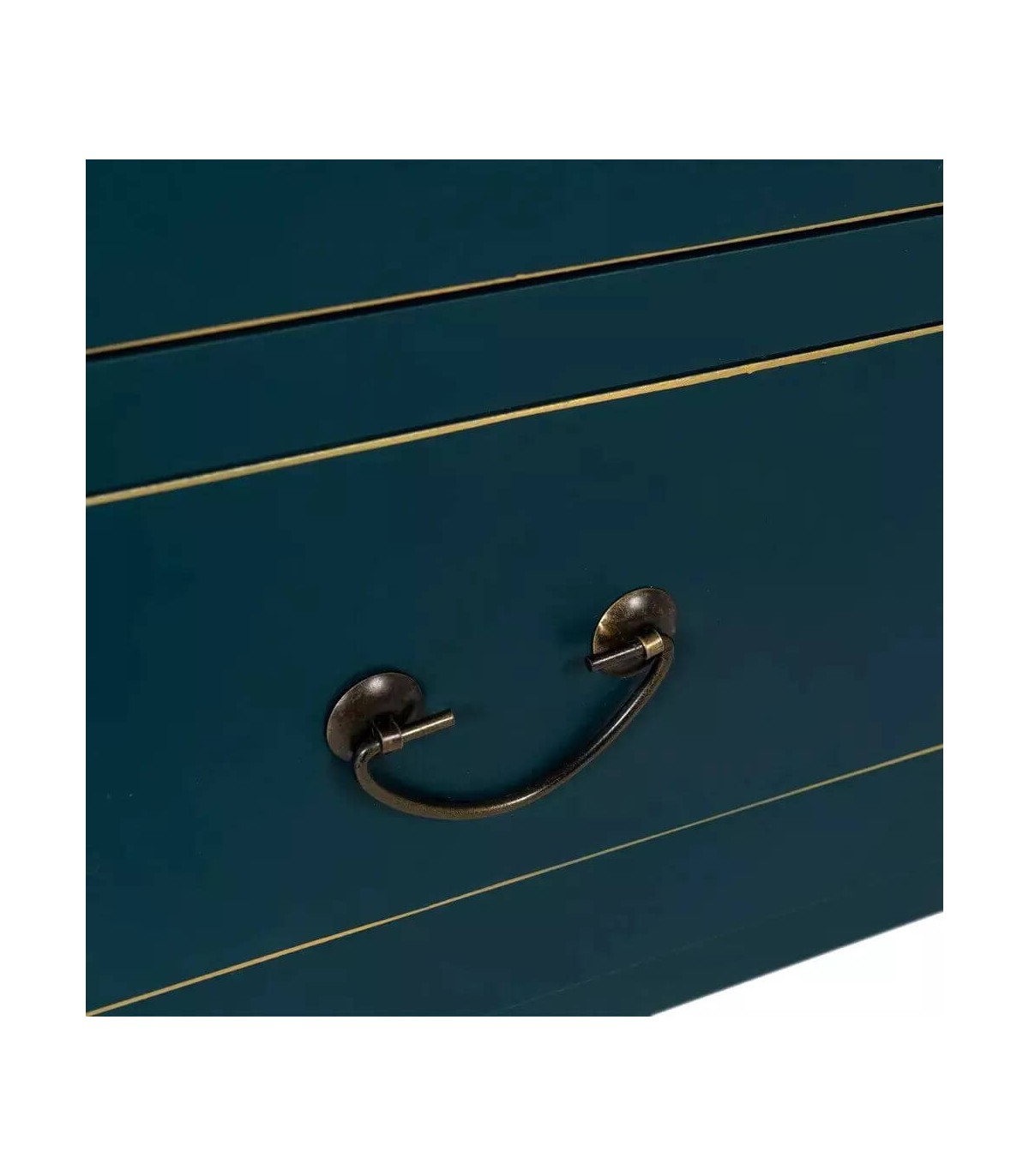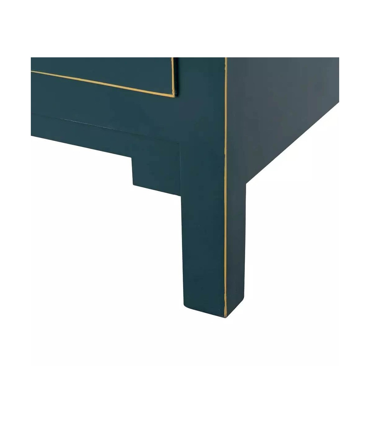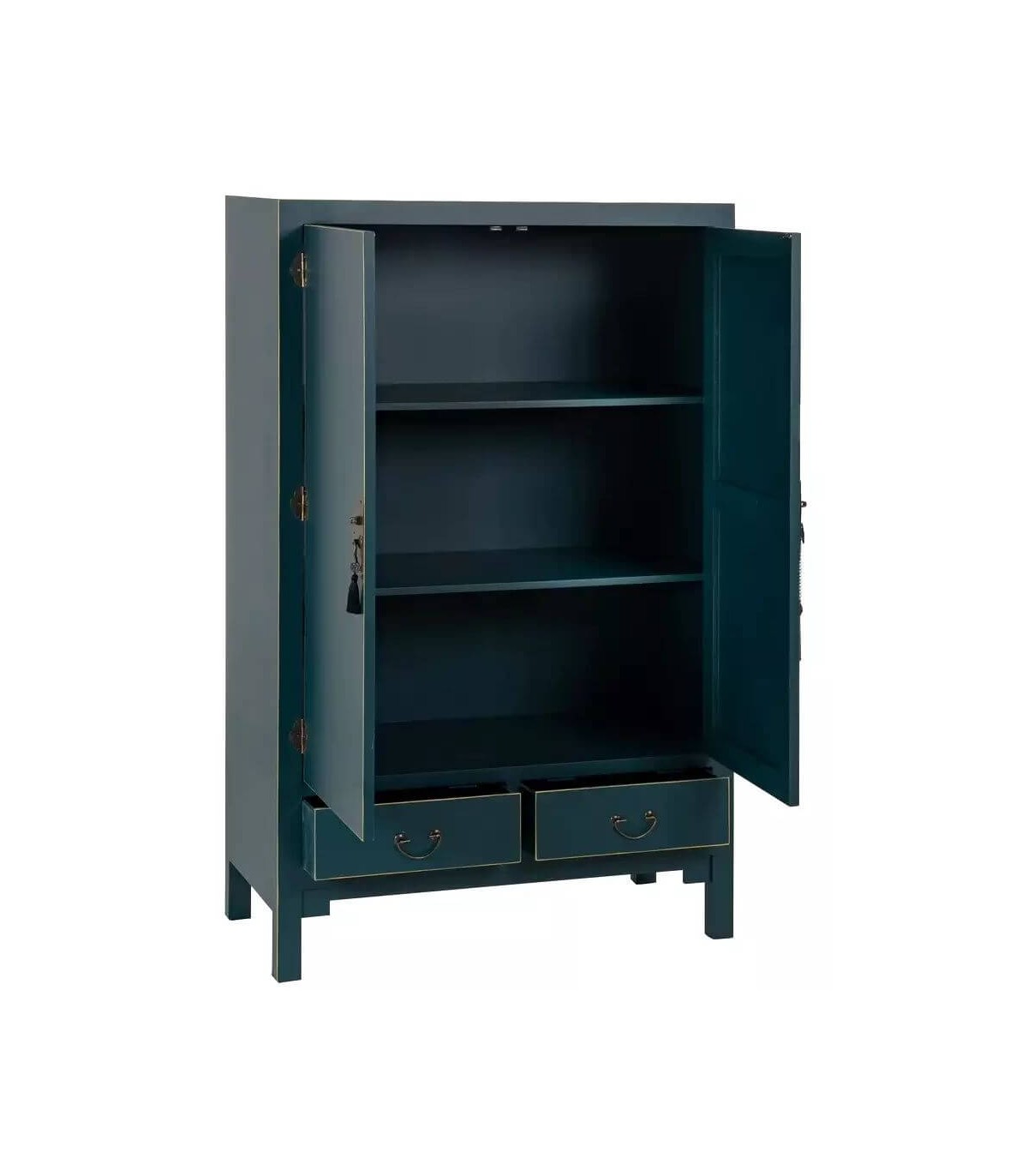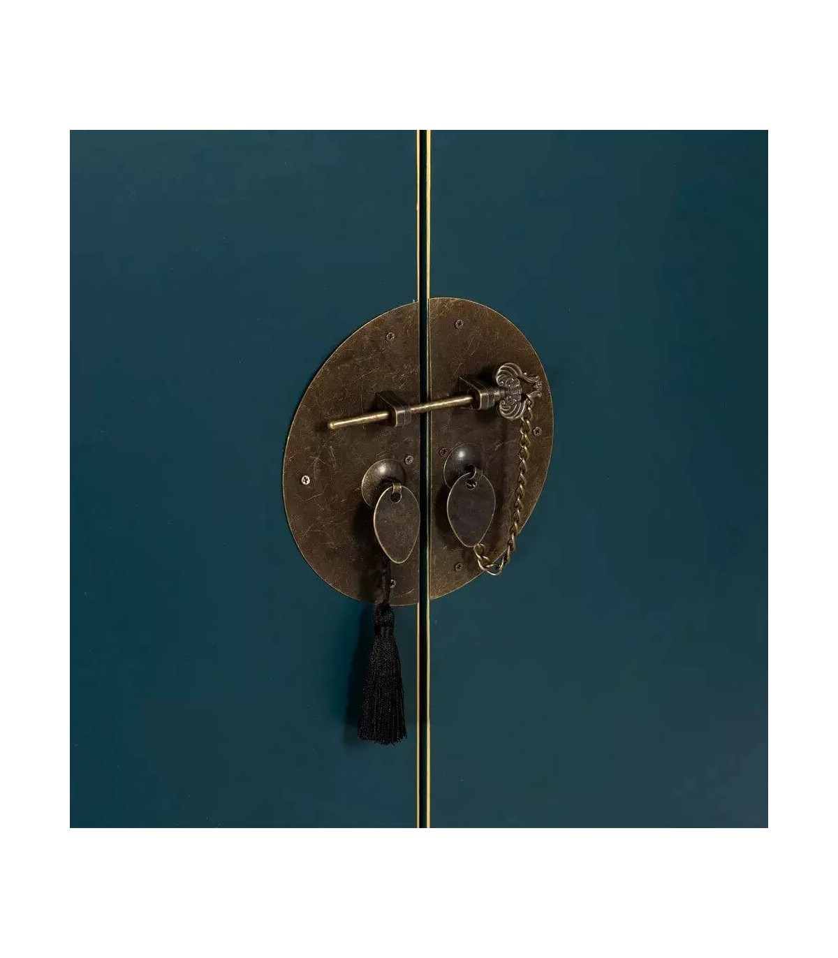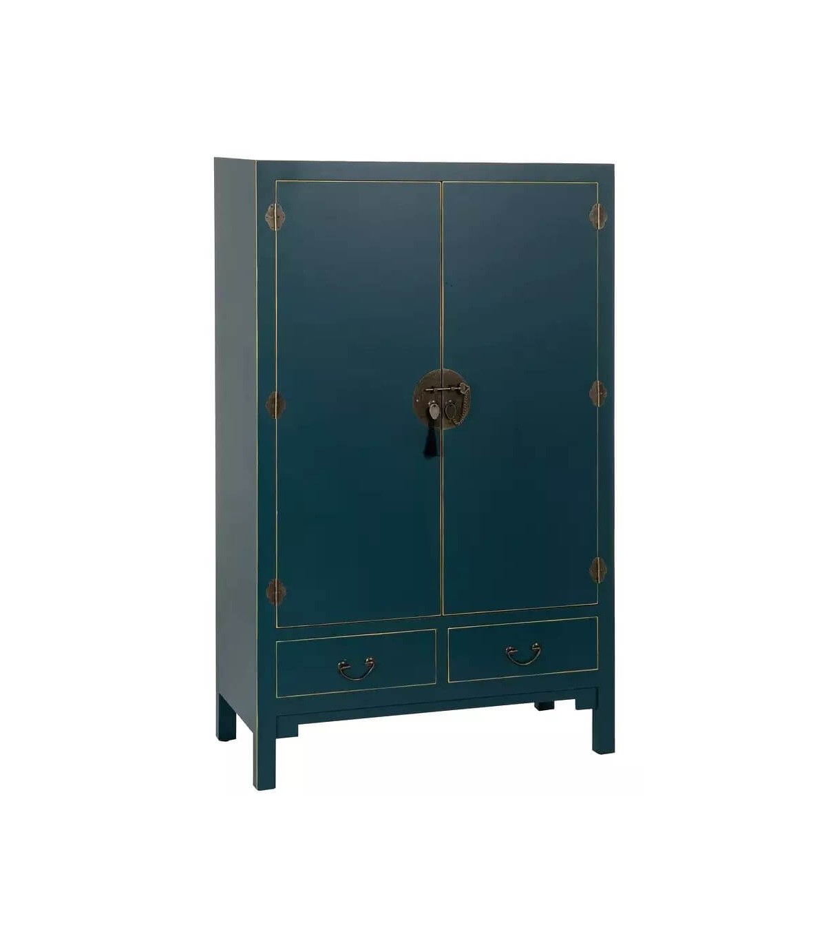 Armario de estilo oriental , acabado en color azul con los cantos perfilados en oro, con dos puertas y dos baldas interiores y un cajón, sus característicos tiradores que acentúan el estilo, un mueble de gran capacidad muy decorativo.