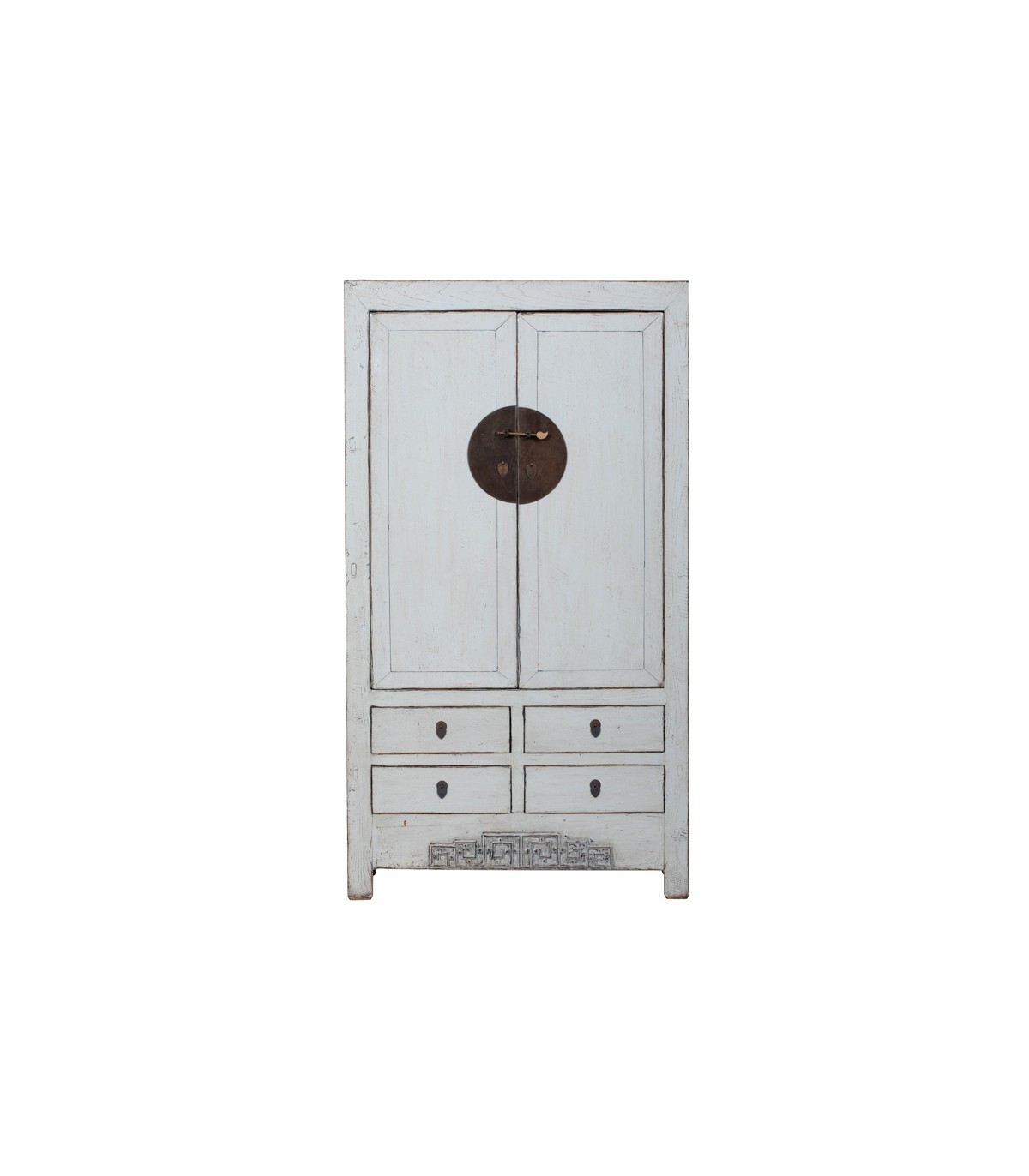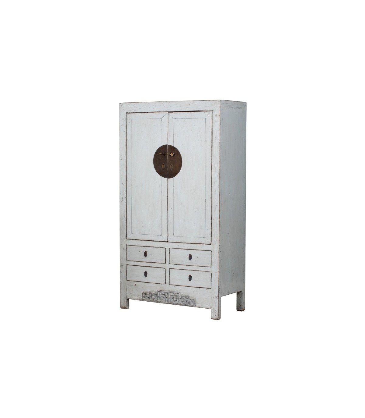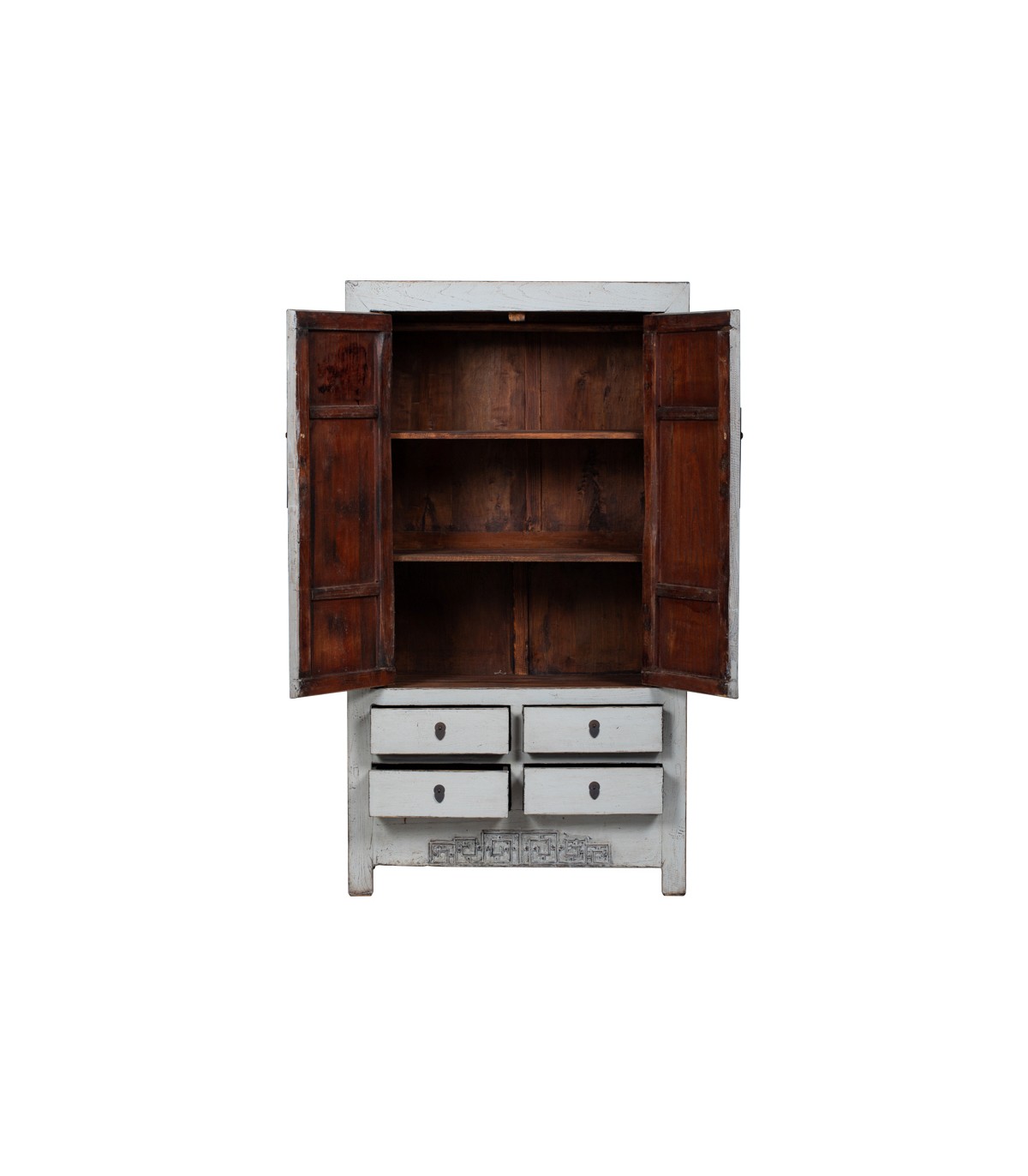 Aporta una presencia única y sofisticada a tu decoración con este espectacular armario alacena antiguo de inspiración oriental. Su diseño tradicional con dos puertas superiores y cuatro cajones inferiores combina proporción, funcionalidad y un marcado acento artesanal.