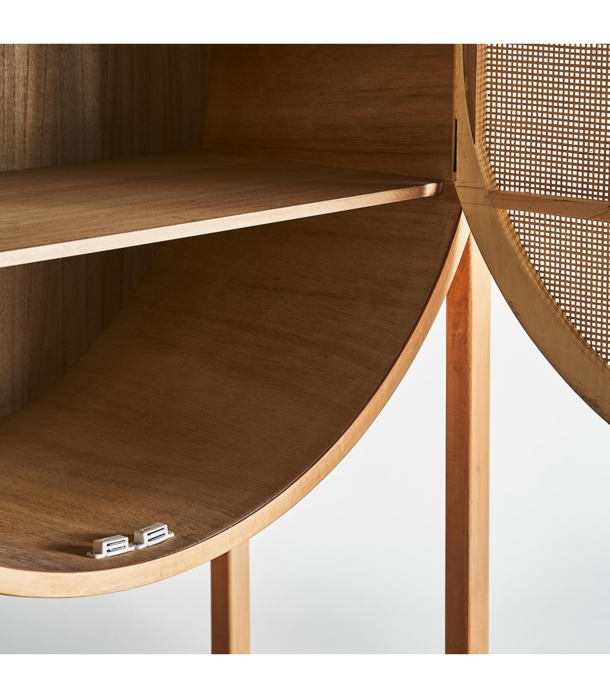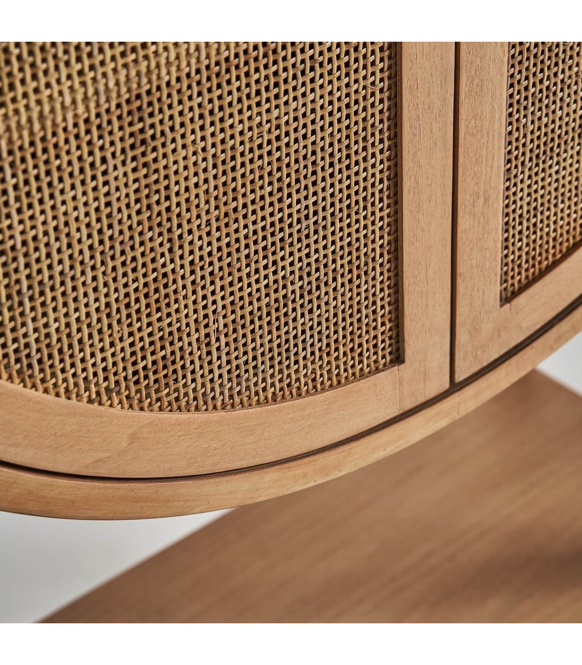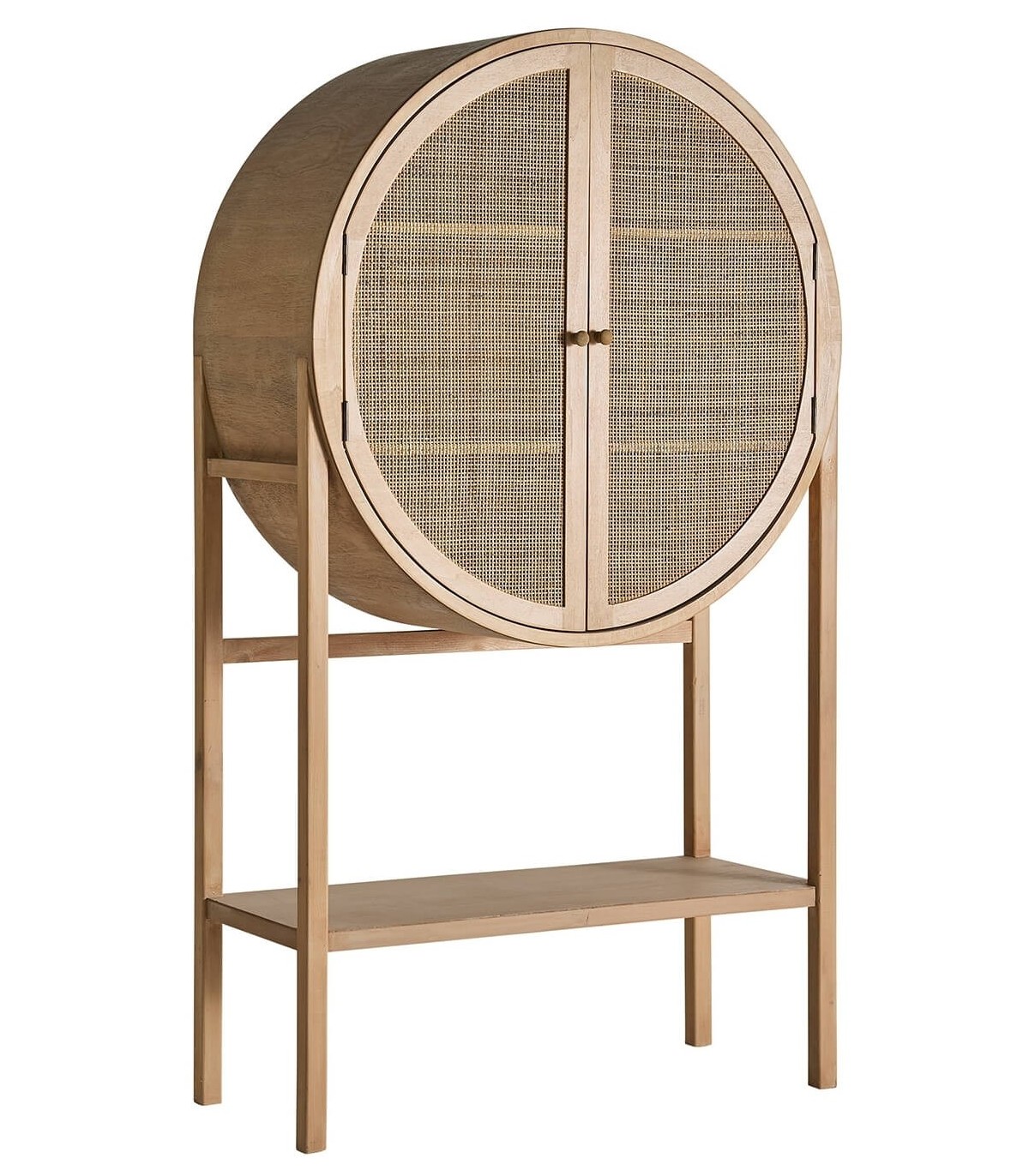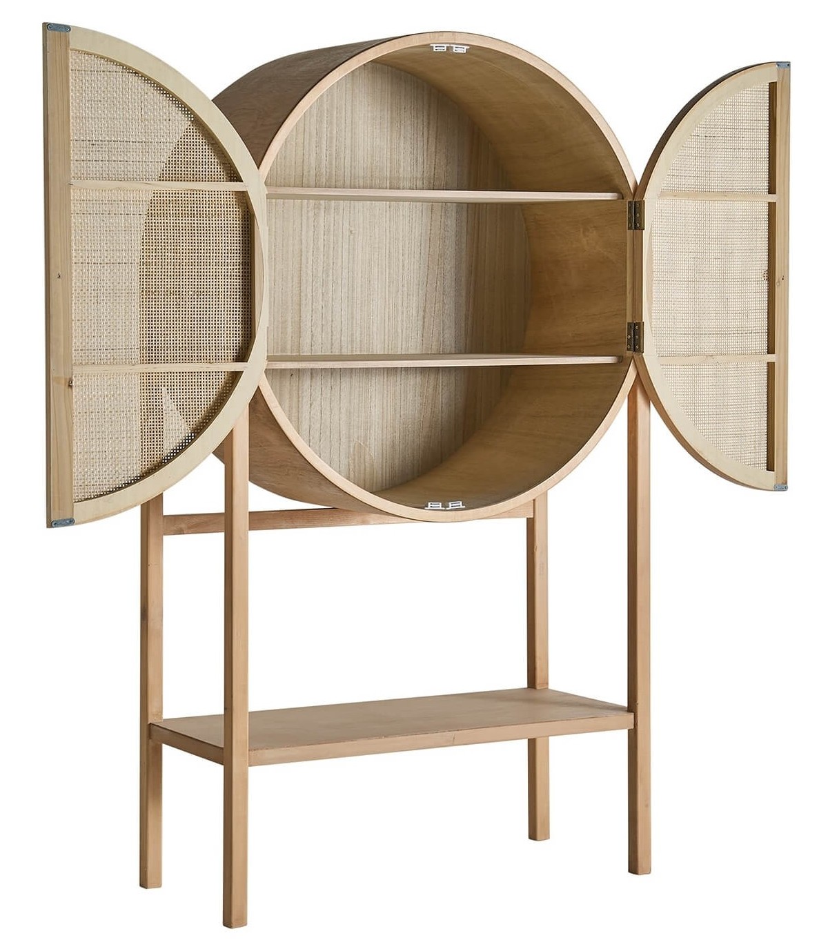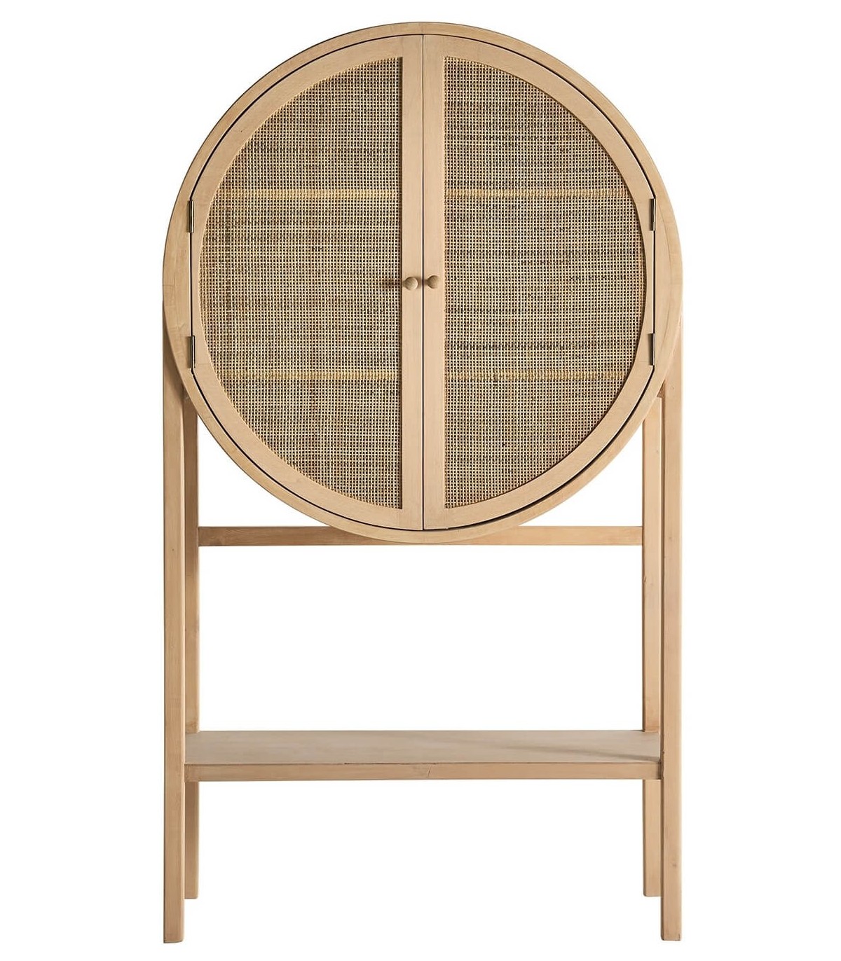 Armario alacena de nuestra colección Jumpi, una colección caracterizada por su combinación entre el ratán y la madera o natural o teñida en color, en el dormitorio también combinado con tela, y añadiendo las formas curvas que le dan un aspecto tan característico.